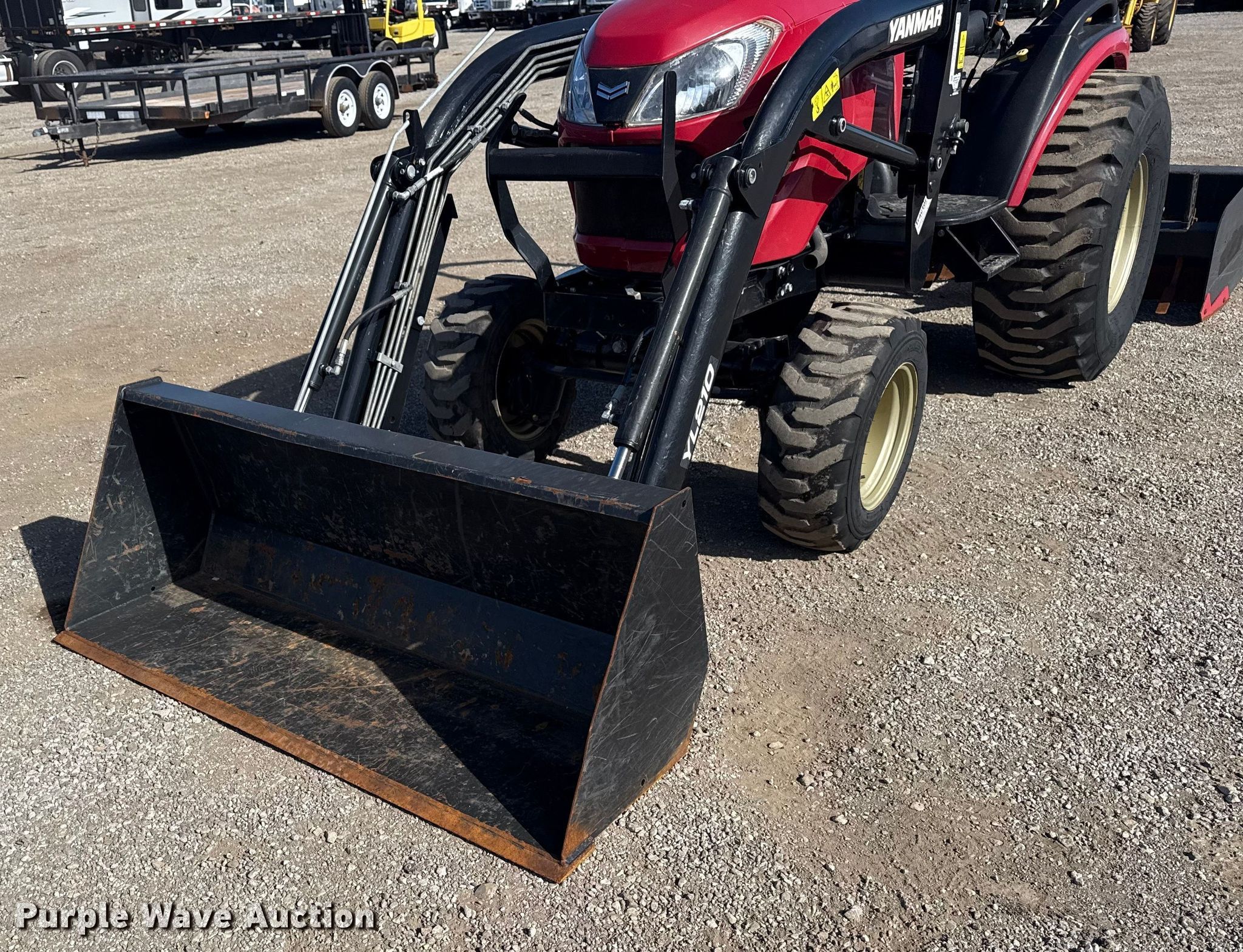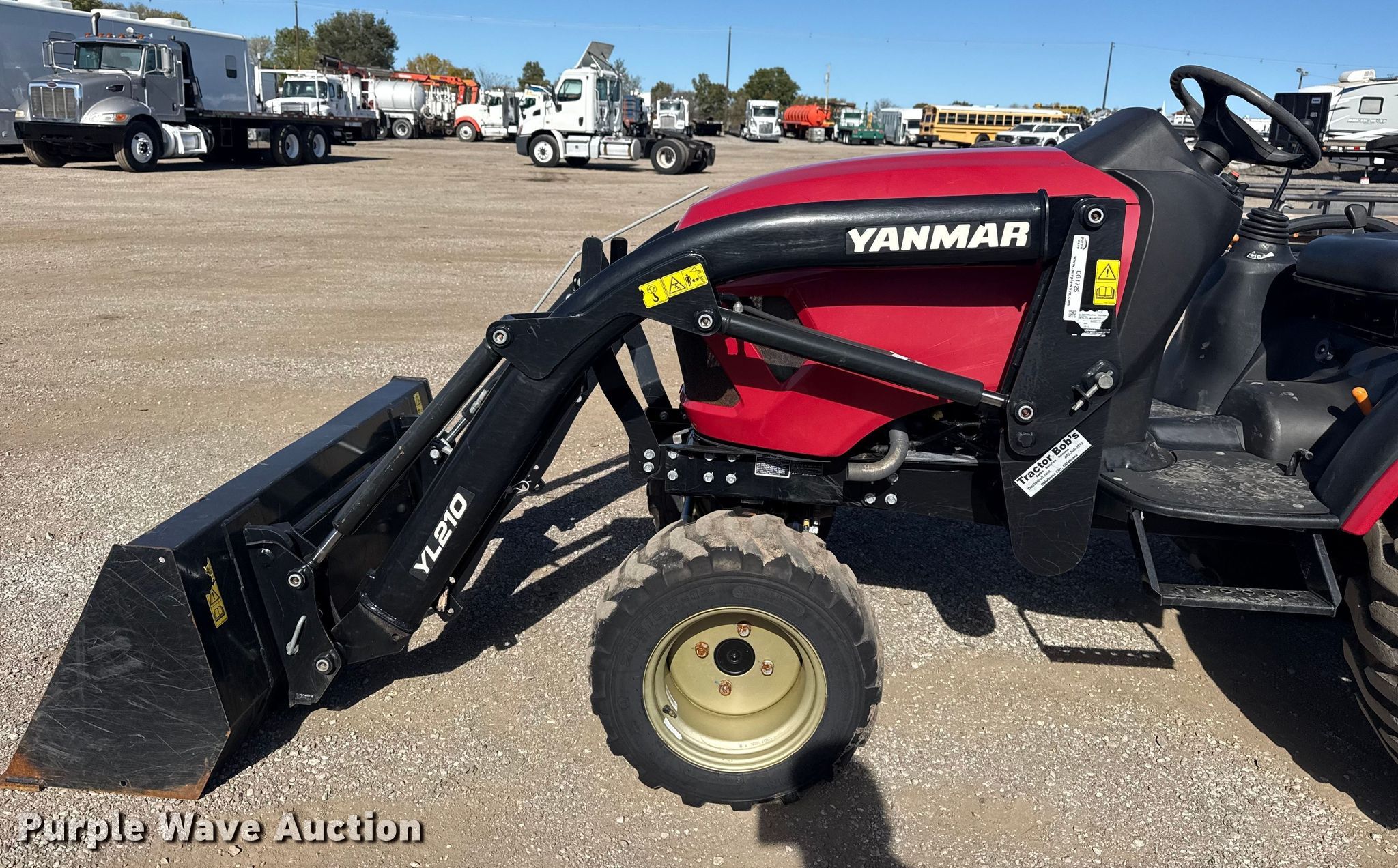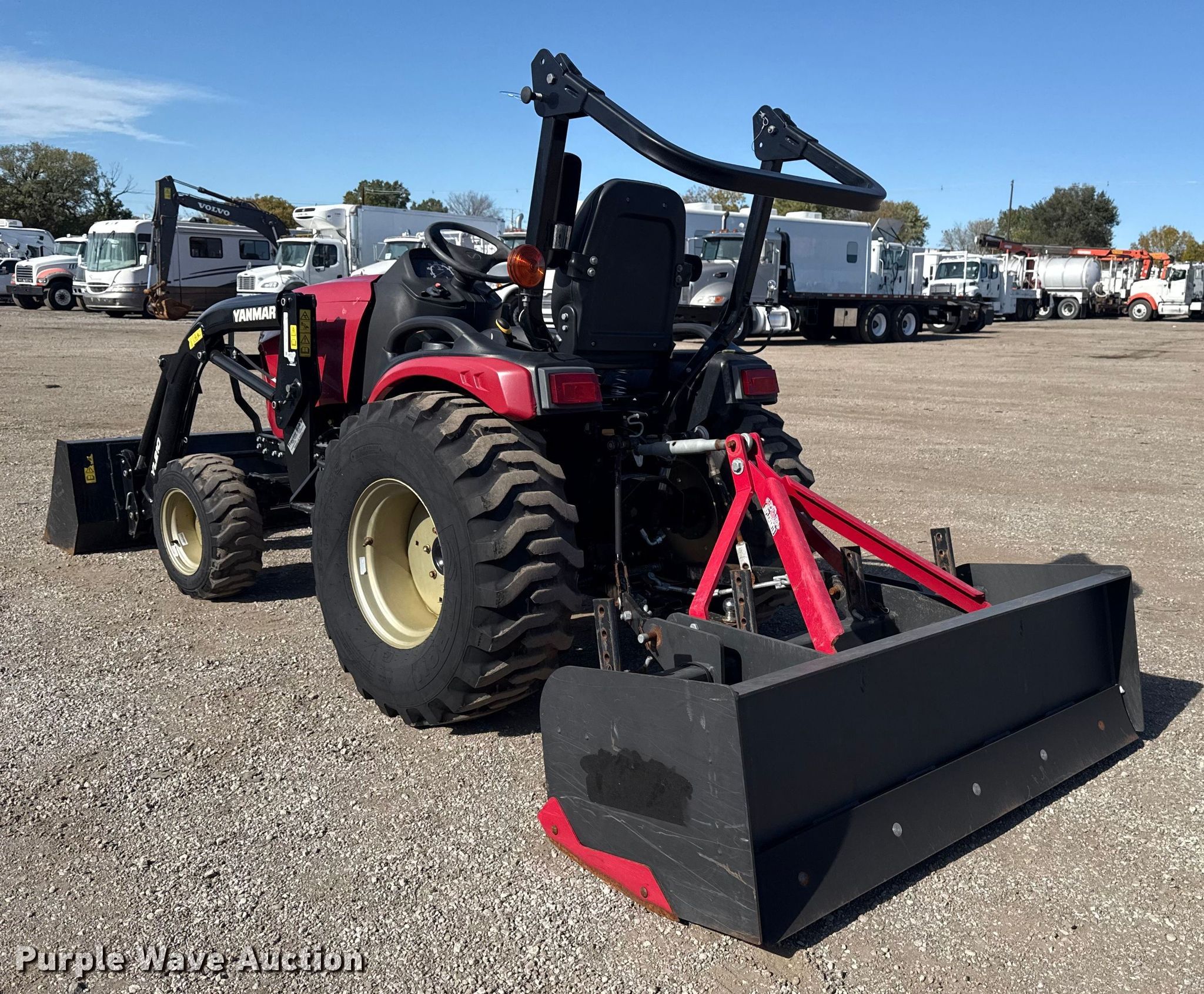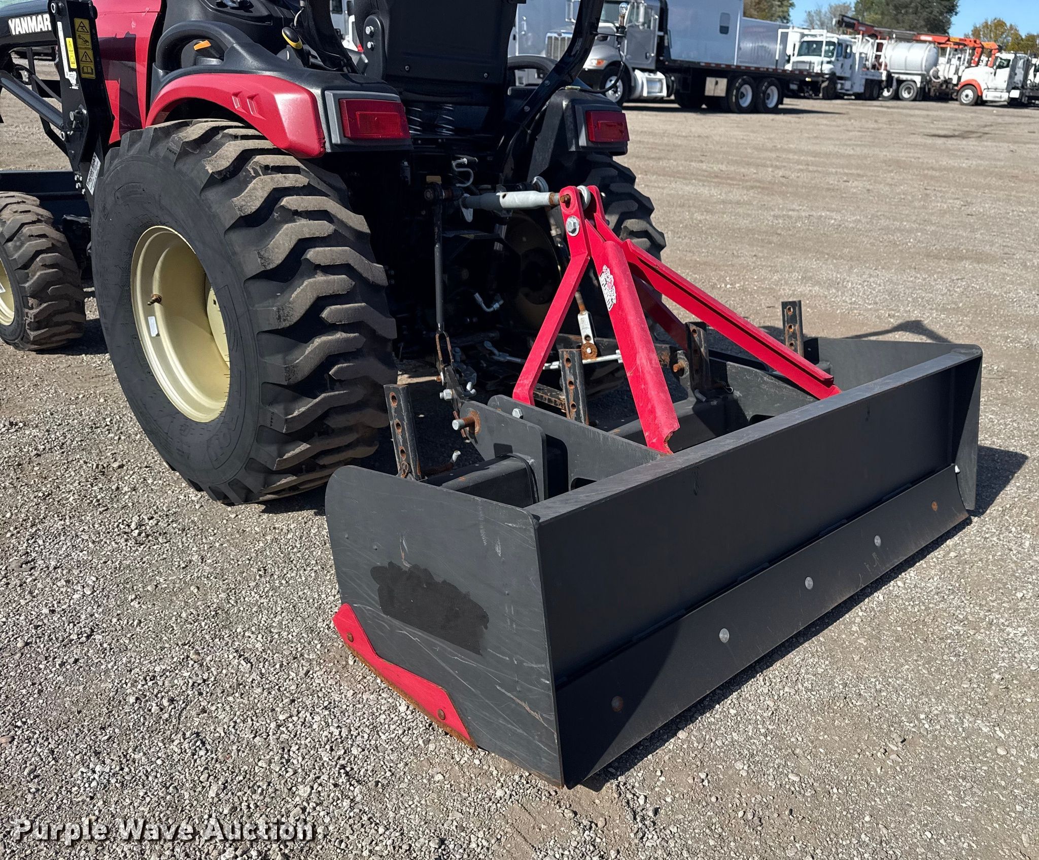 2020 Yanmar SA24 MFWD tractor. Hours: 304 on meter, Serial: YMJS0026ELT410552. Engine Yanmar 4WNCAAY, Displacement: 1.276L, Cylinders: 3, Fuel type: Diesel. Transmission Hydrostatic, Differential lock. Features PTO: 540, Three point Top link, Loader Yanmar YL210, Controls: Joystick, Bucket Width: 53", Brady Boy Implements box blade Width: 61". Tires Front: 205/65-12, Rear: 350/70-17.5. Notes Springs not installed. Collinsville, OK 74021