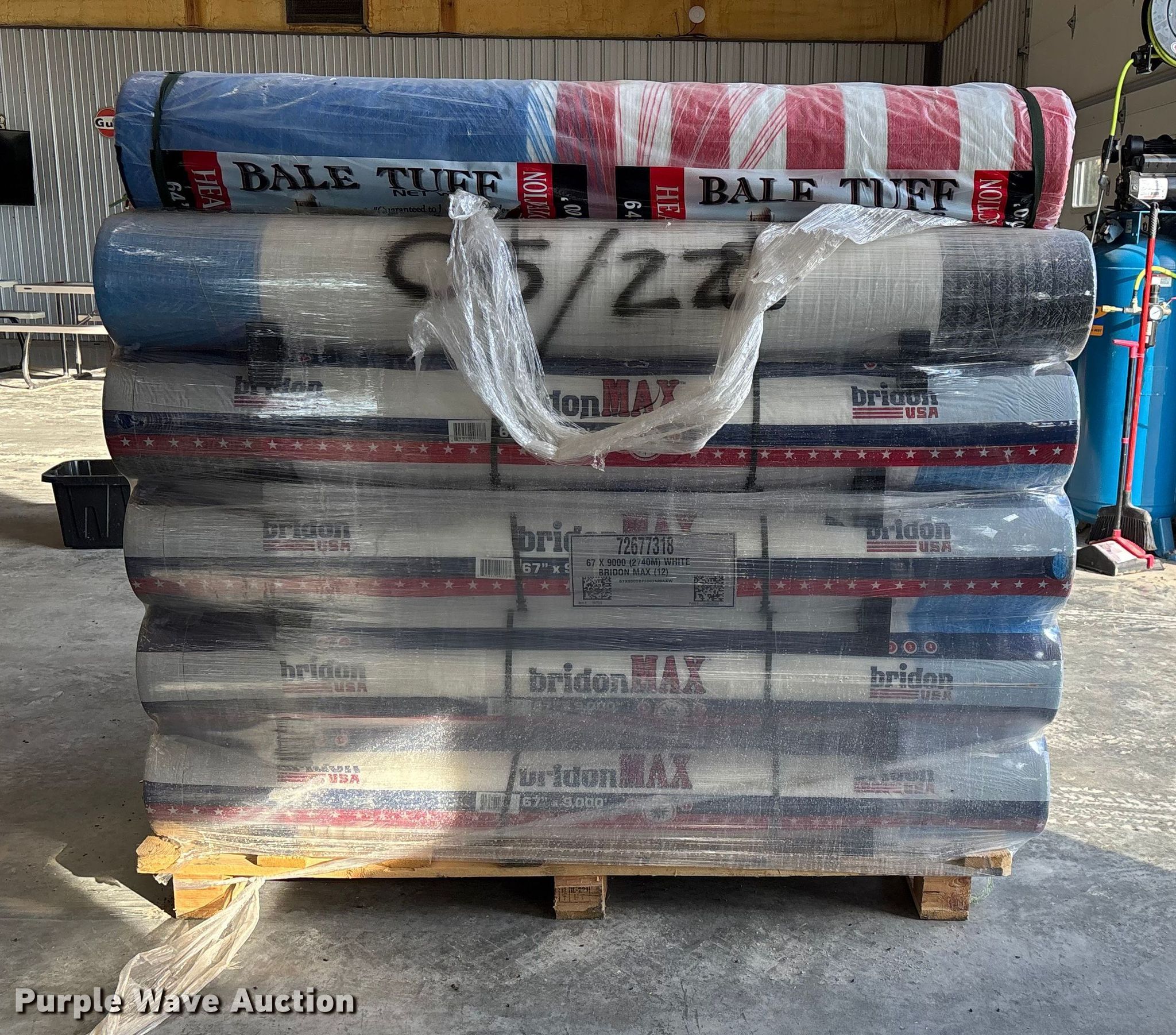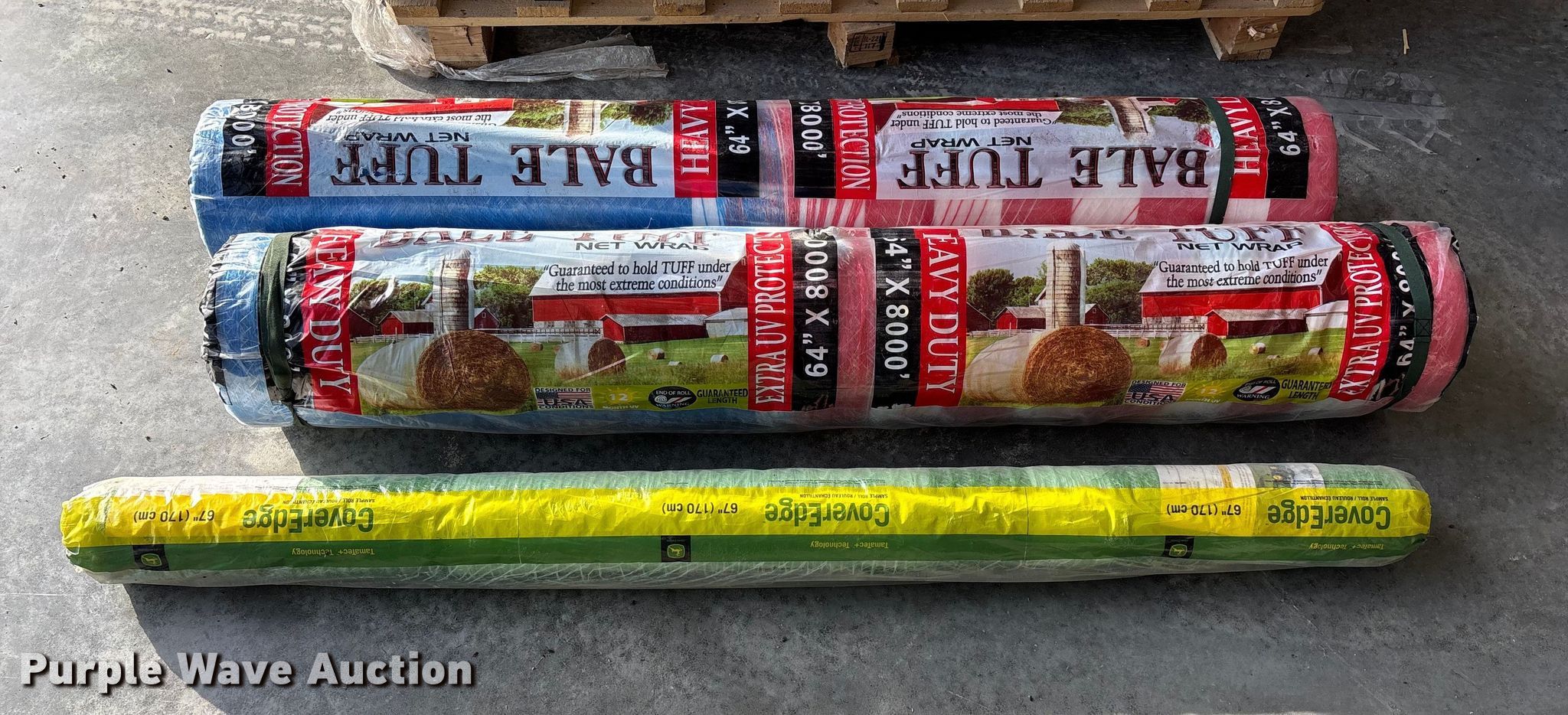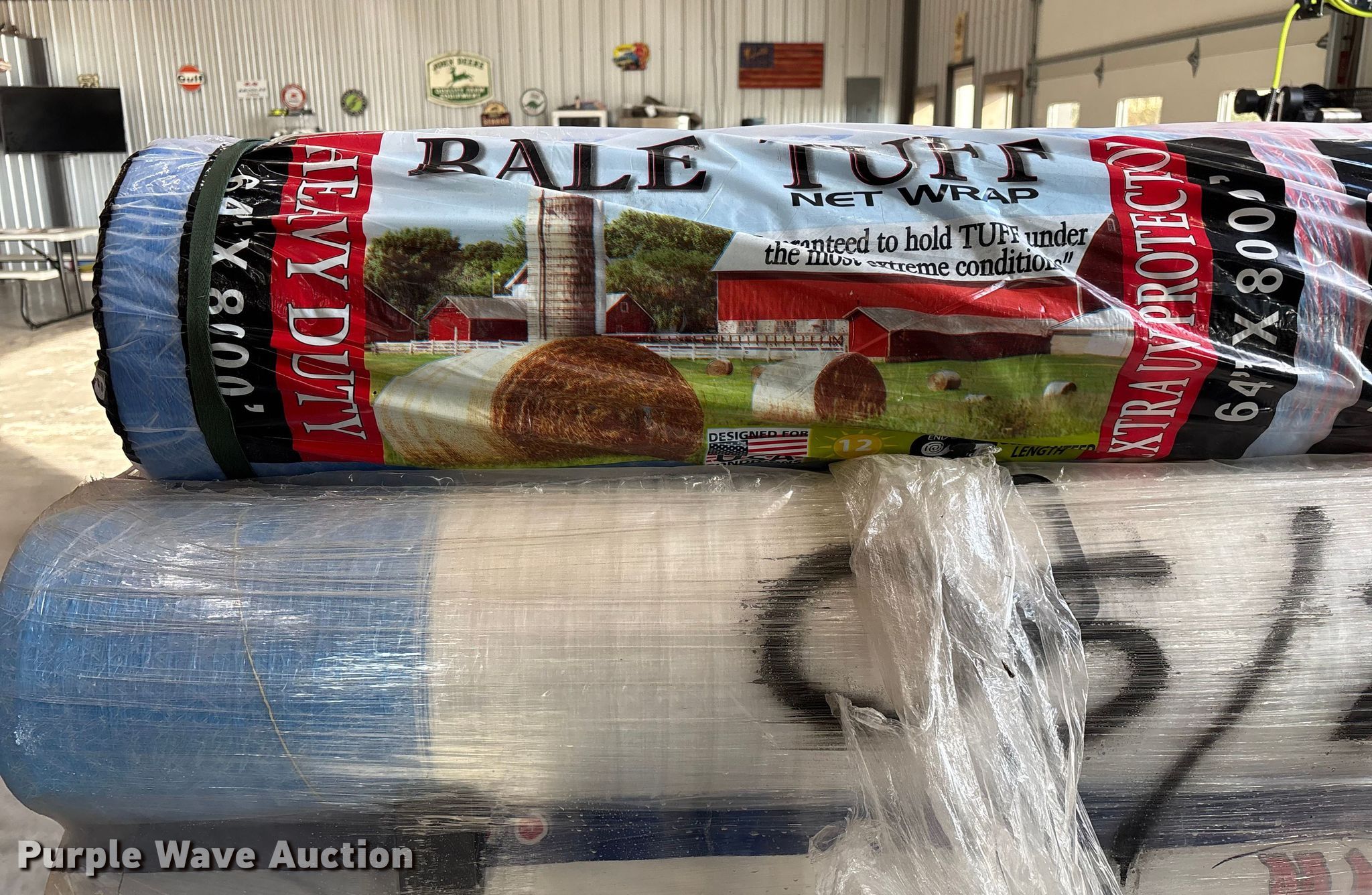 Purple Wave is selling a used Hay Handling in Kansas. This item is a Baler net wrap with the following: (15) rolls of Bridon MAX 67" x 9000', (4) rolls of Bale Tuff 64" x 8000', Roll of John Deere CoverEdge 67" sample roll