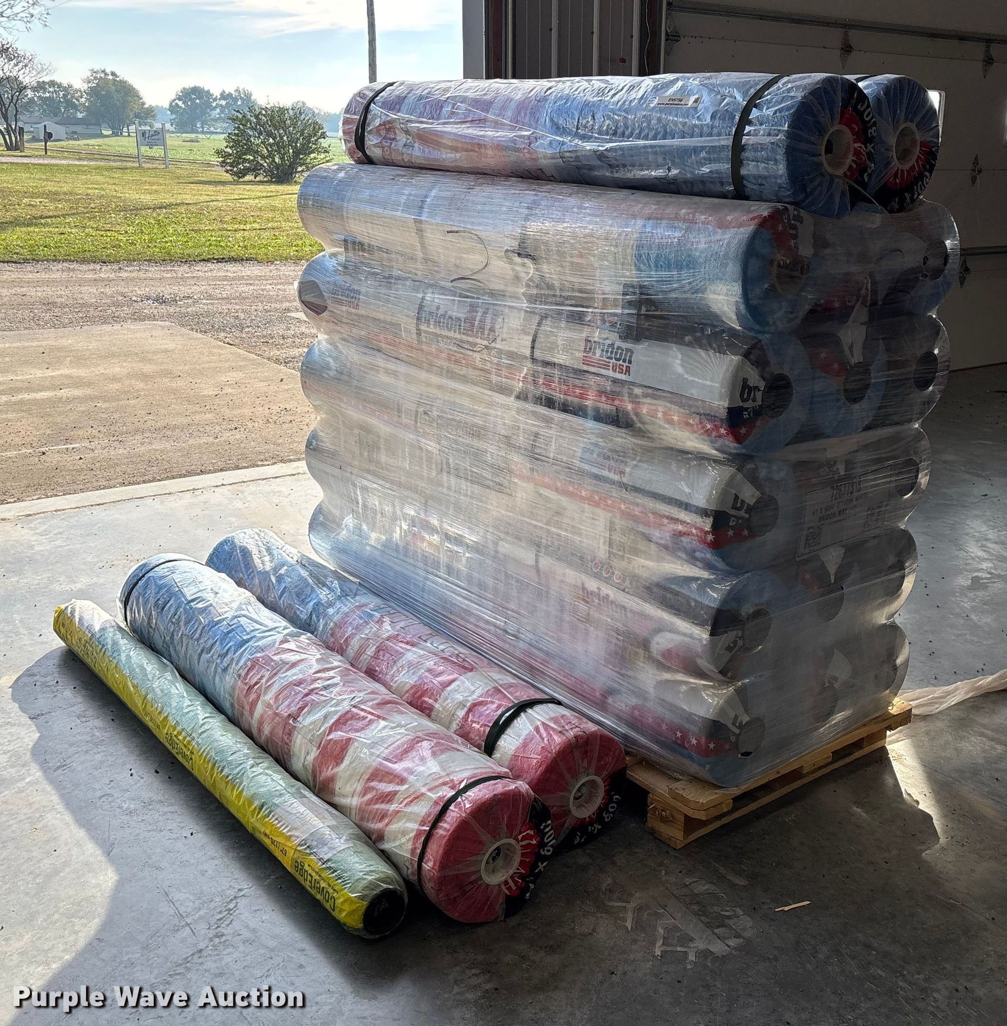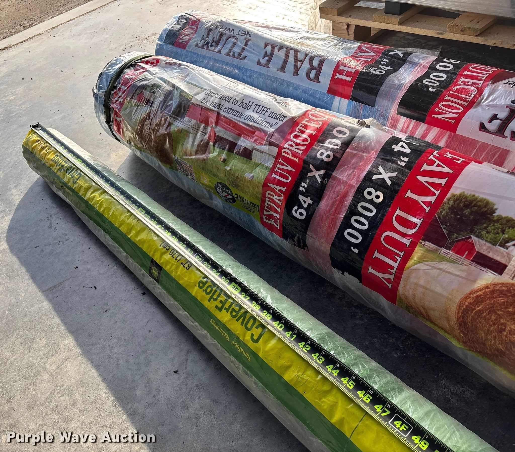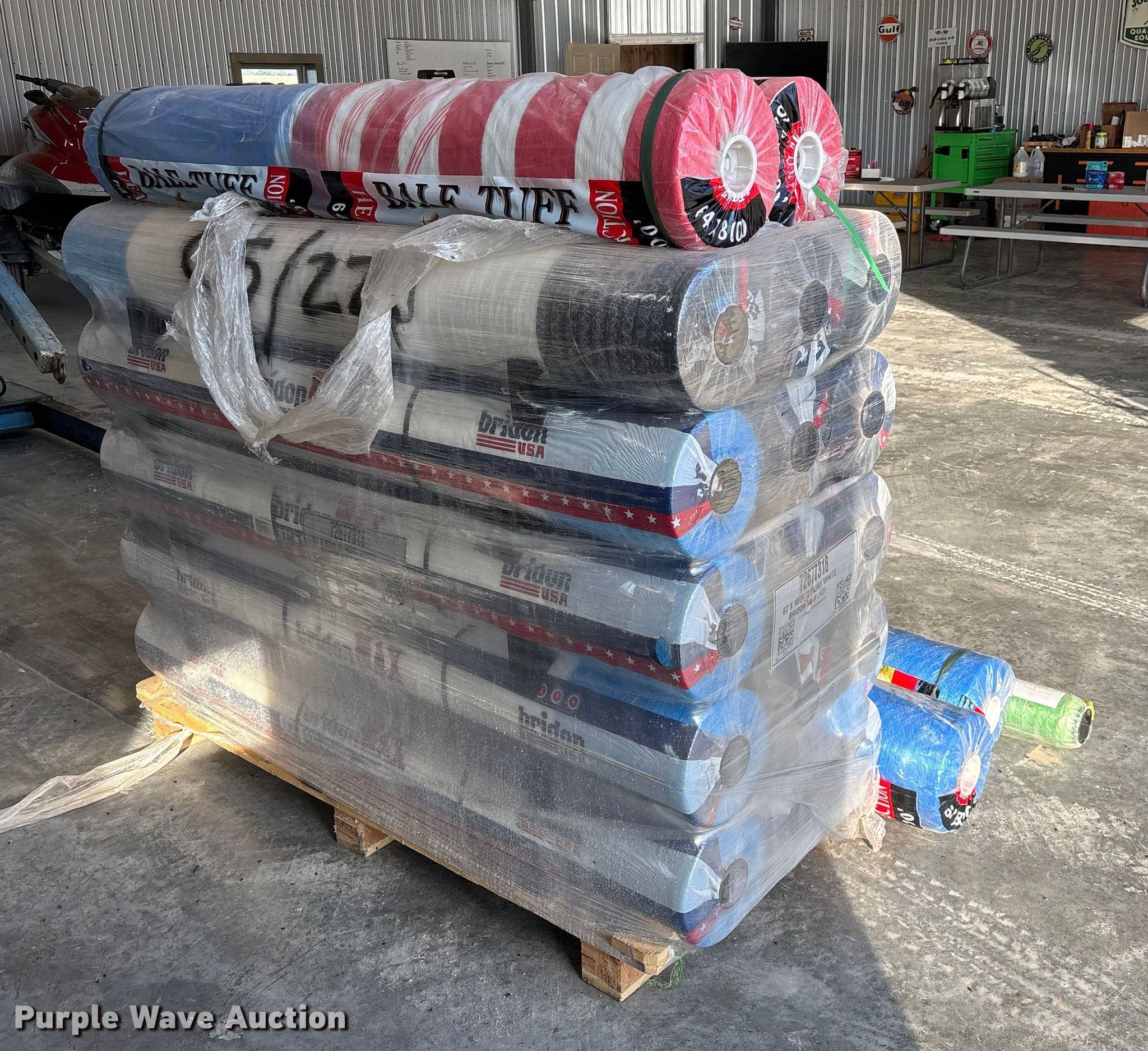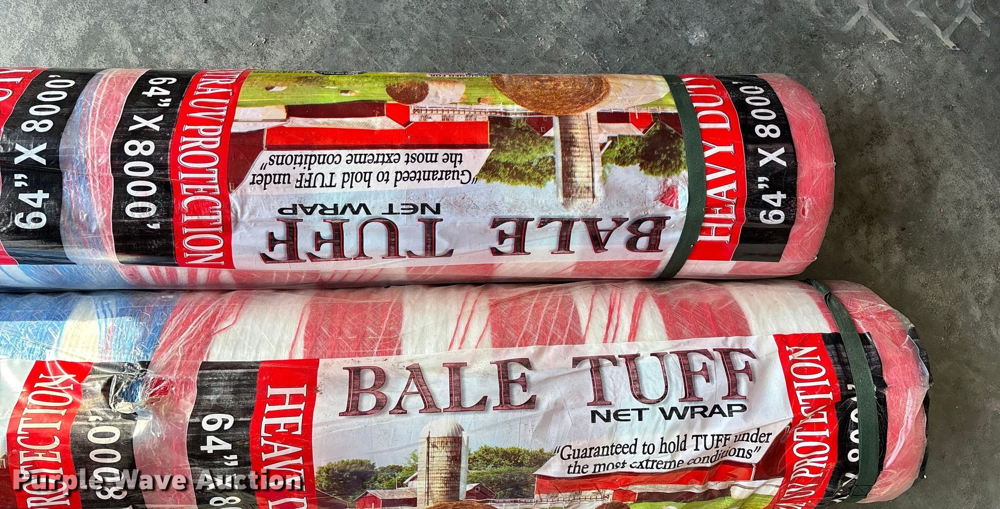 Purple Wave is selling a used Hay Handling in Kansas. This item is a Baler net wrap with the following: (15) rolls of Bridon MAX 67" x 9000', (4) rolls of Bale Tuff 64" x 8000', Roll of John Deere CoverEdge 67" sample roll