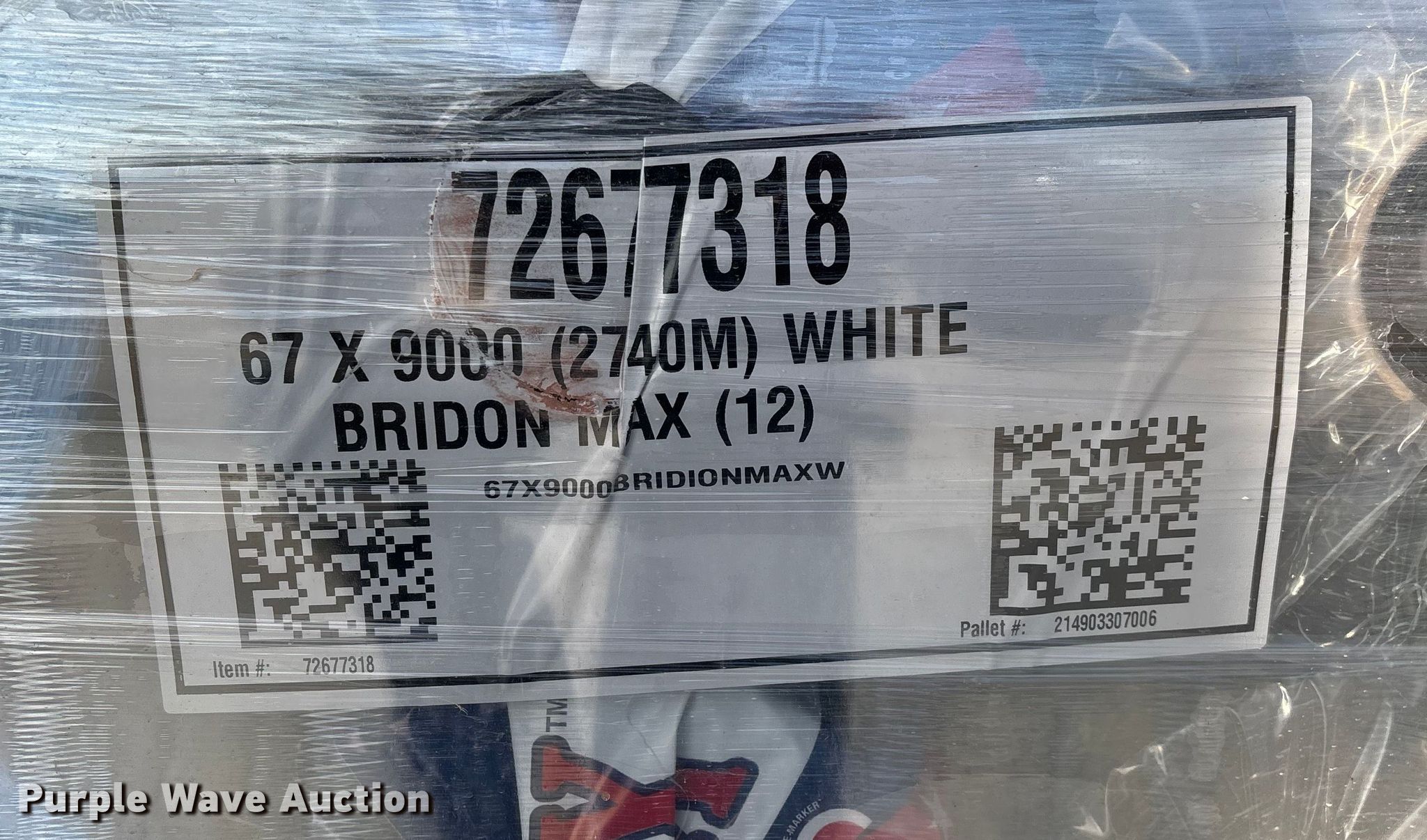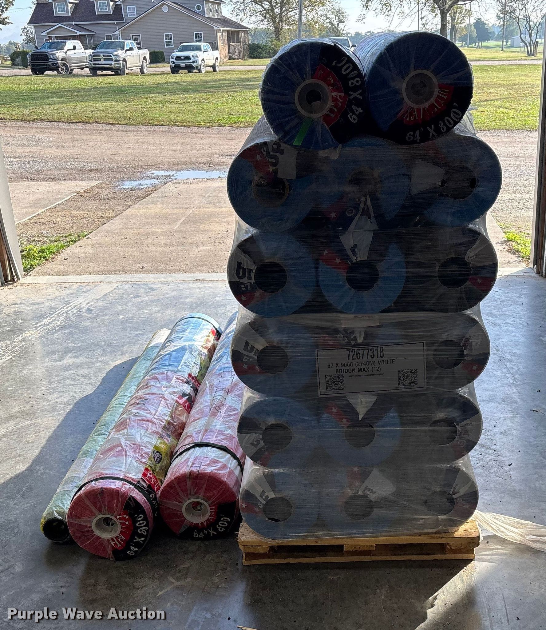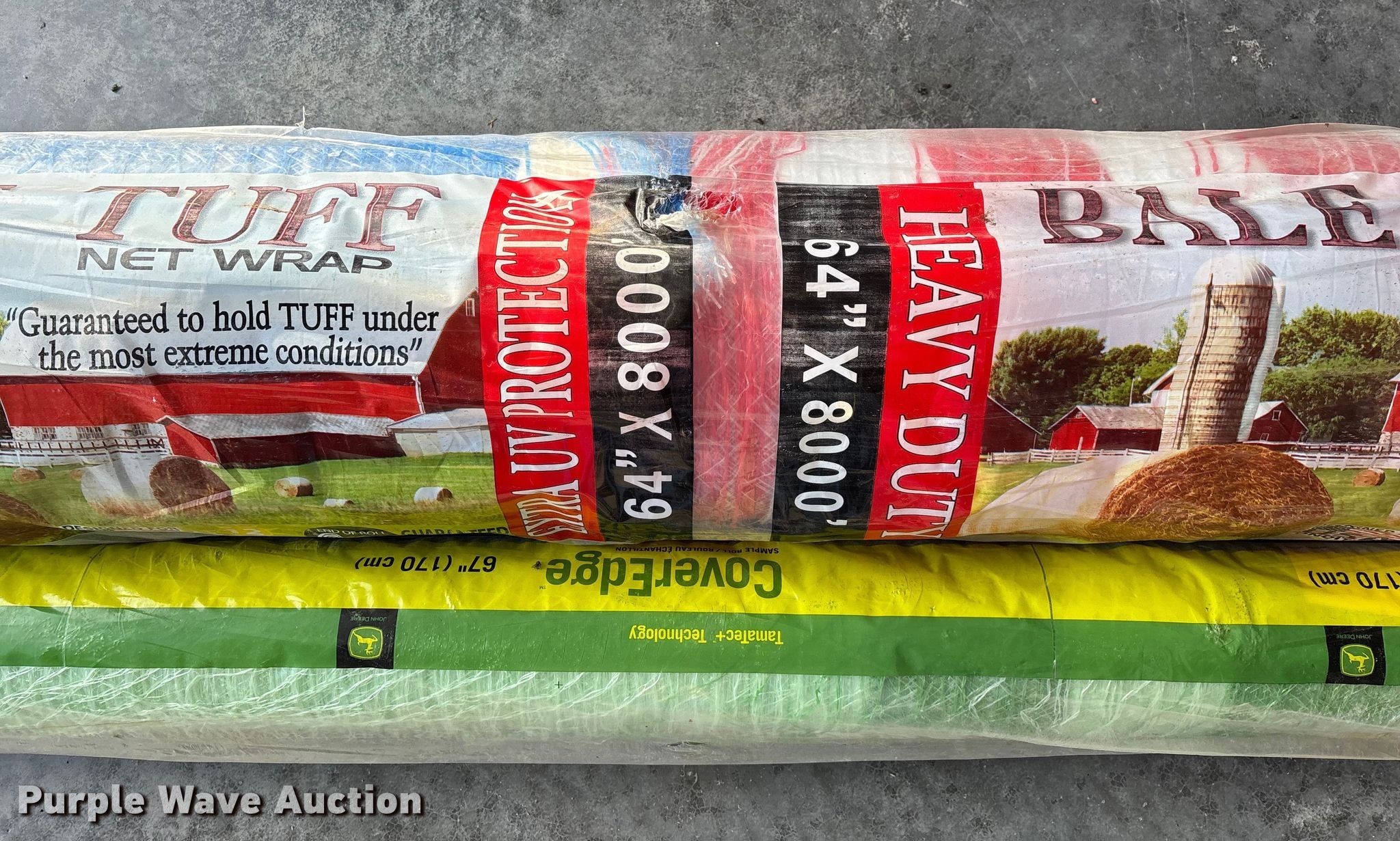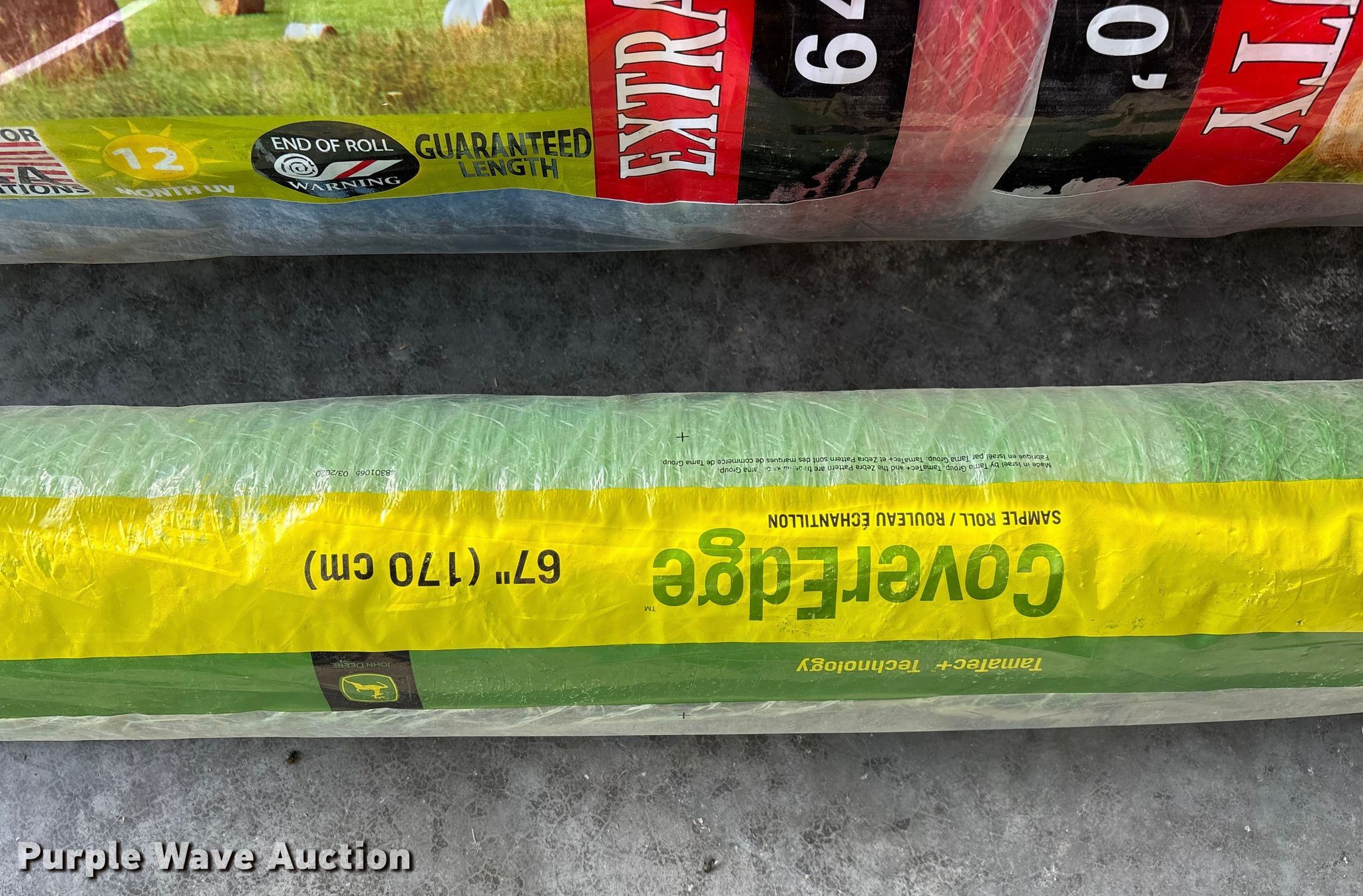 Baler net wrap. (15) rolls of Bridon MAX 67" x 9000', (4) rolls of Bale Tuff 64" x 8000', Roll of John Deere CoverEdge 67" sample roll. Hutto Grain & Livestock Inc.. Galena, KS 66739