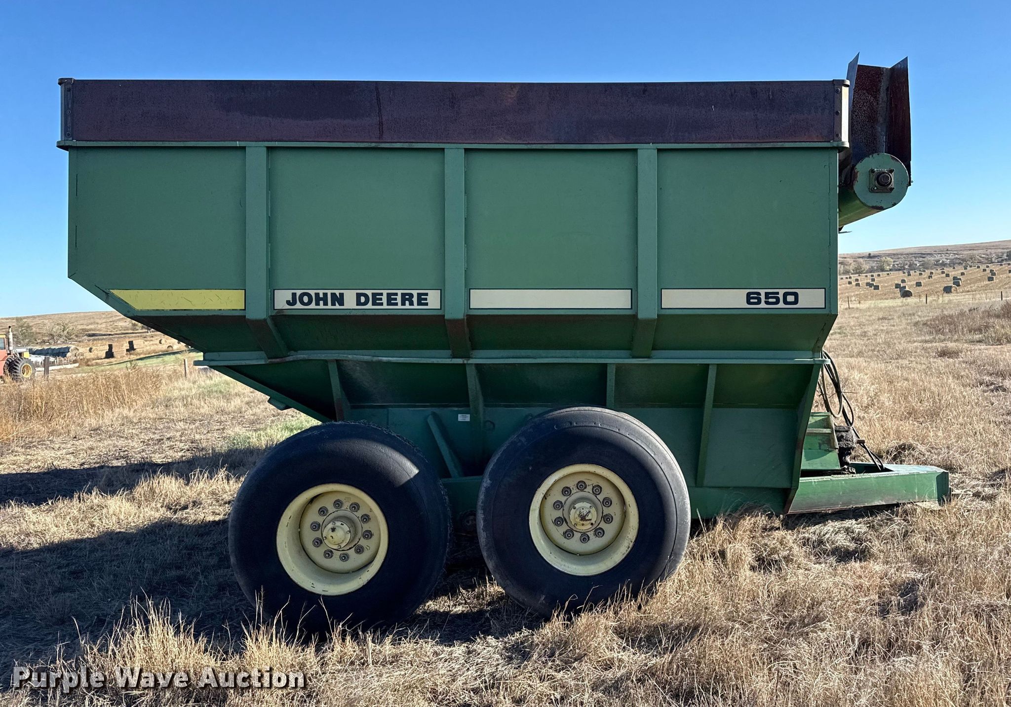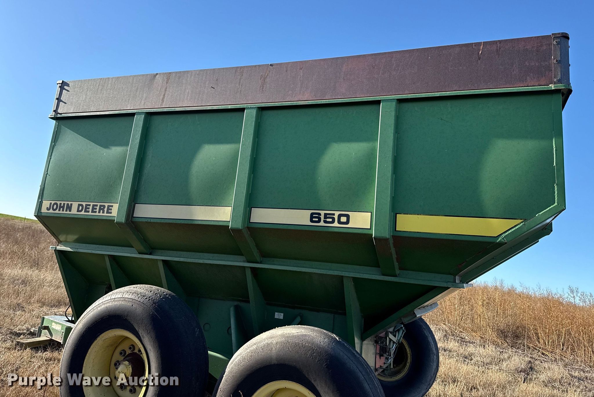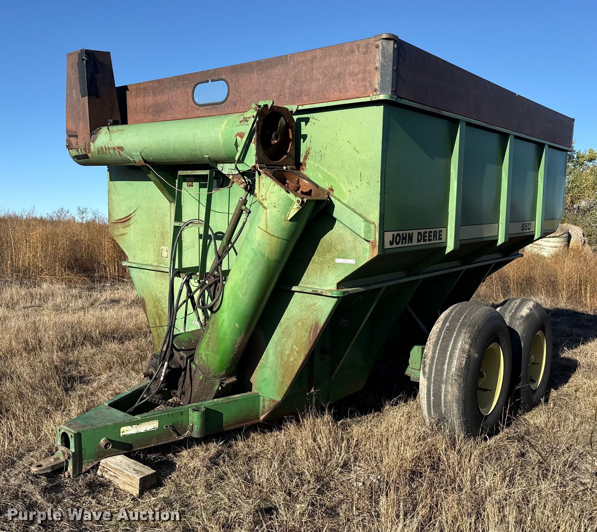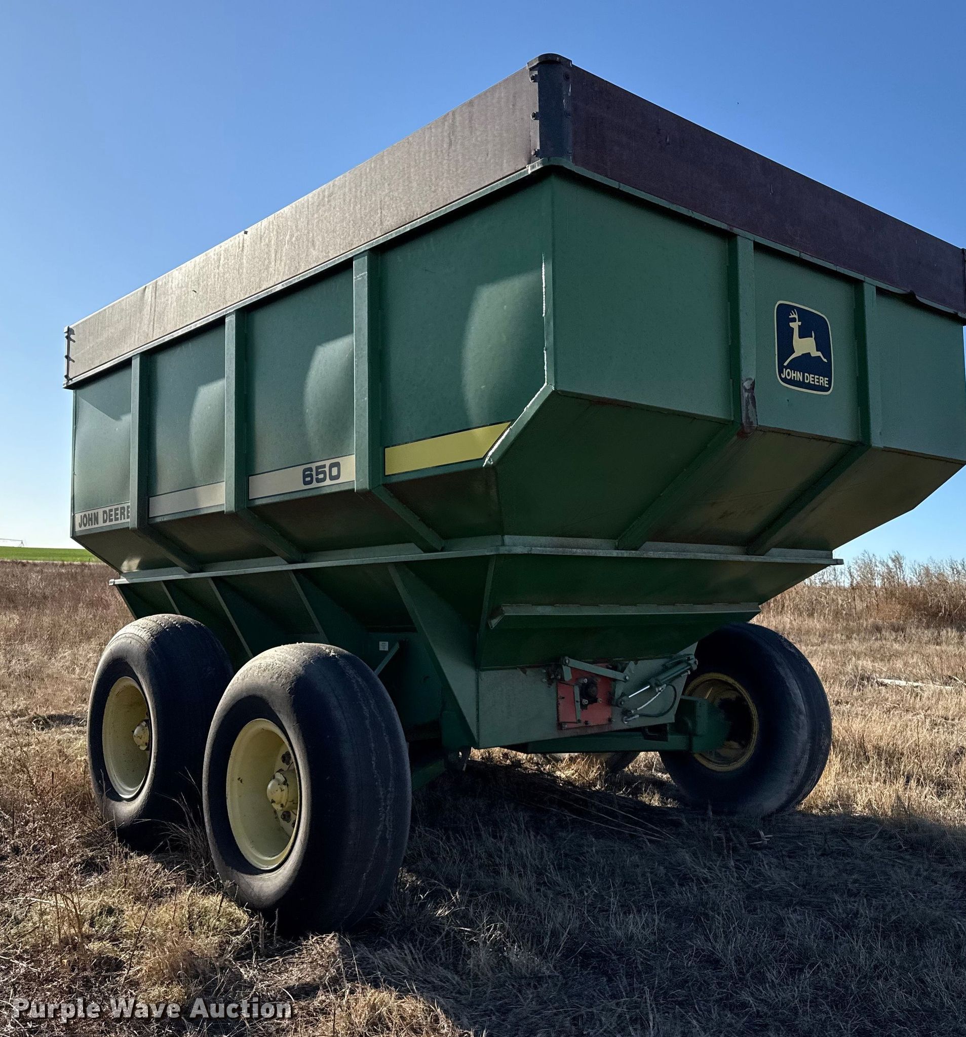 Purple Wave is selling a used Grain Cart or Gravity Wagon in Kansas. This item is a John Deere 650 grain cart with the following: Auger diameter: 12", Shut-off gate: Hydraulic