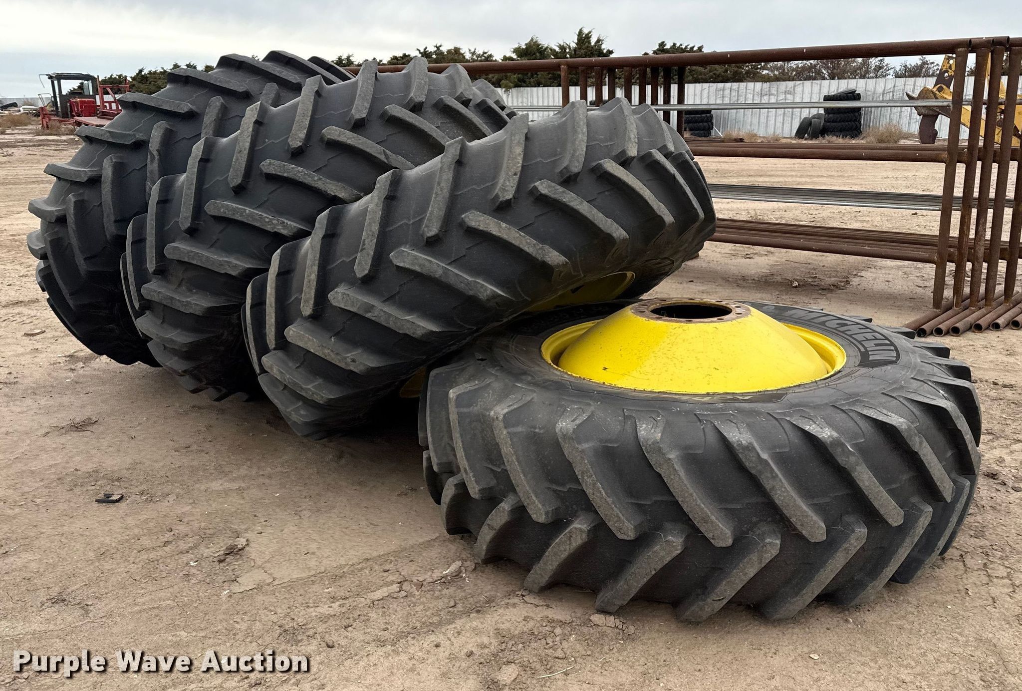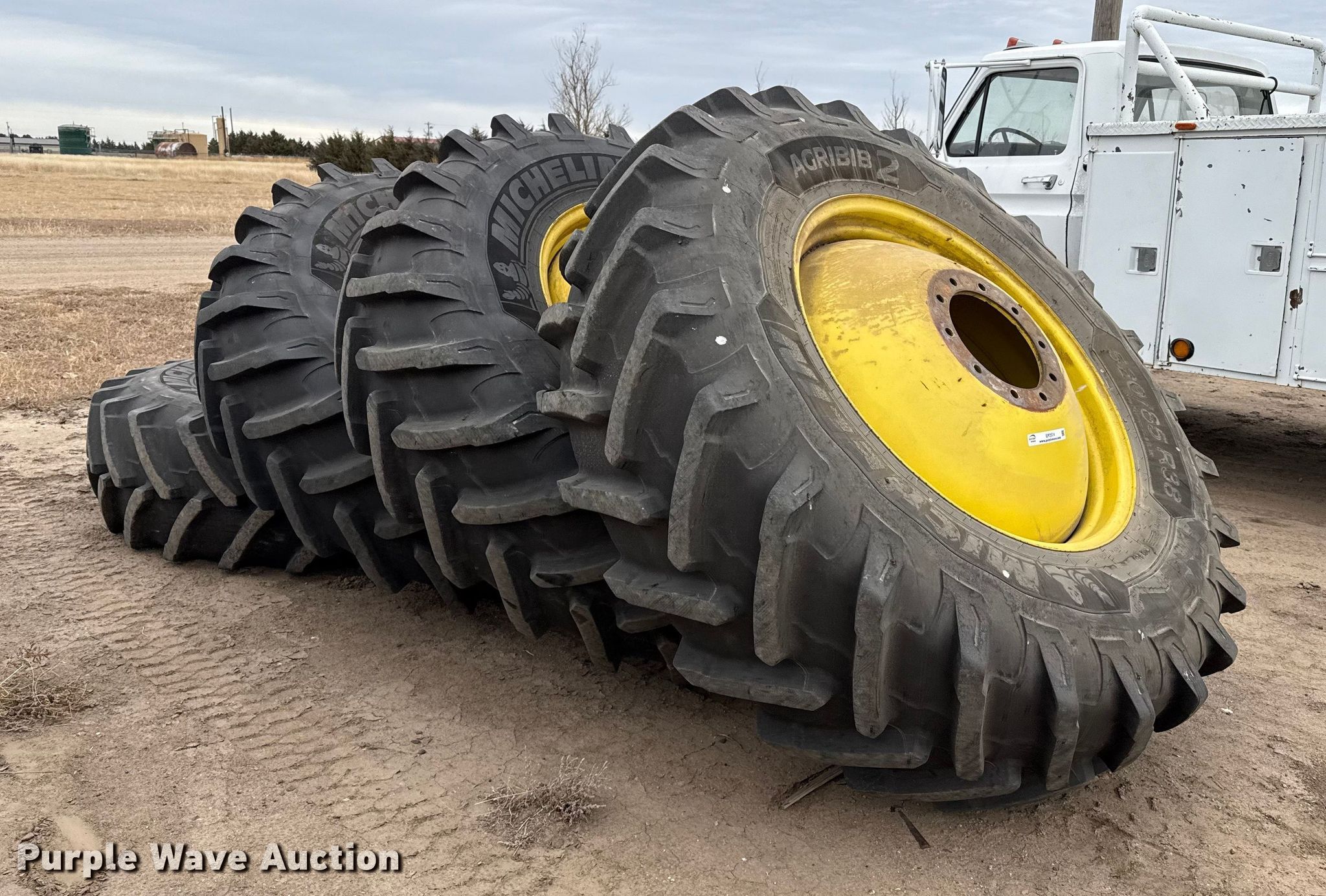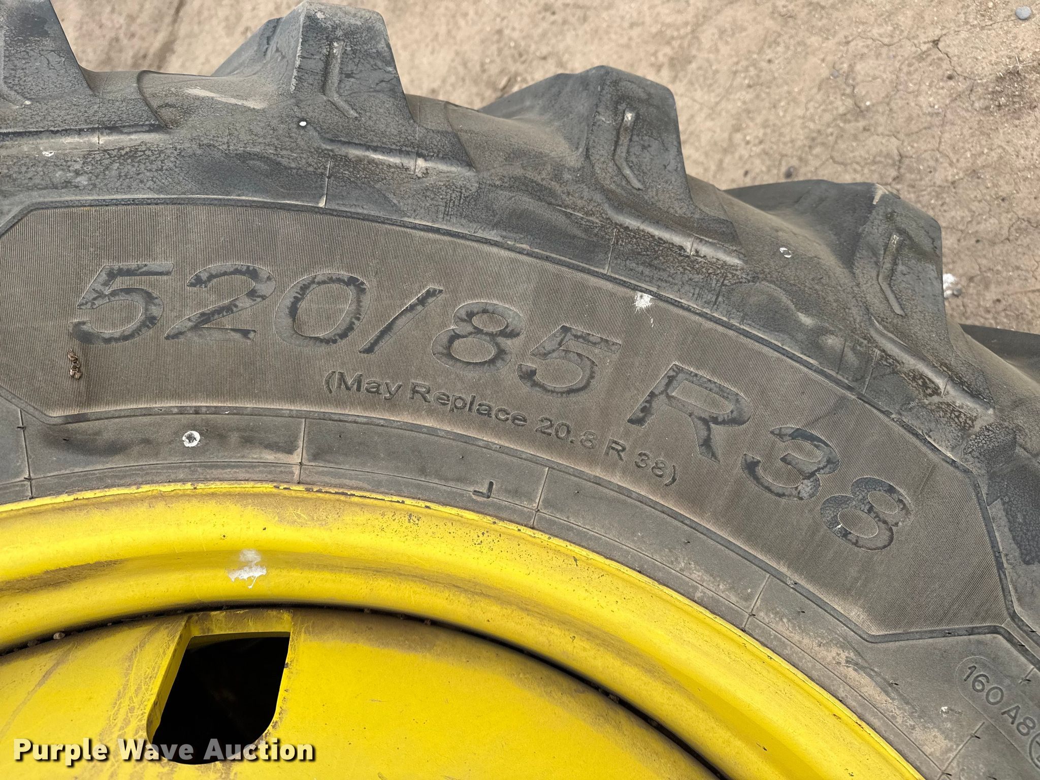 Purple Wave is selling a used Industrial Tires or Tracks in Kansas. This item is a (4) combine wheels and tires with the following: Size: 520/85R38