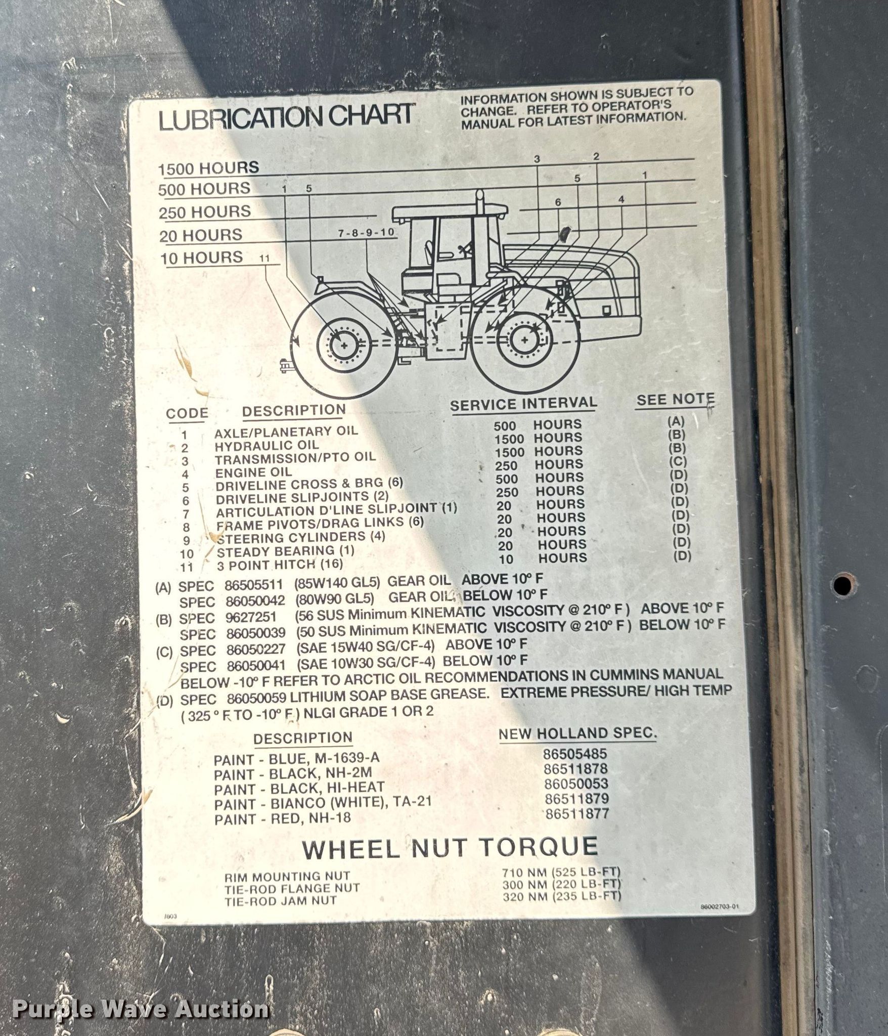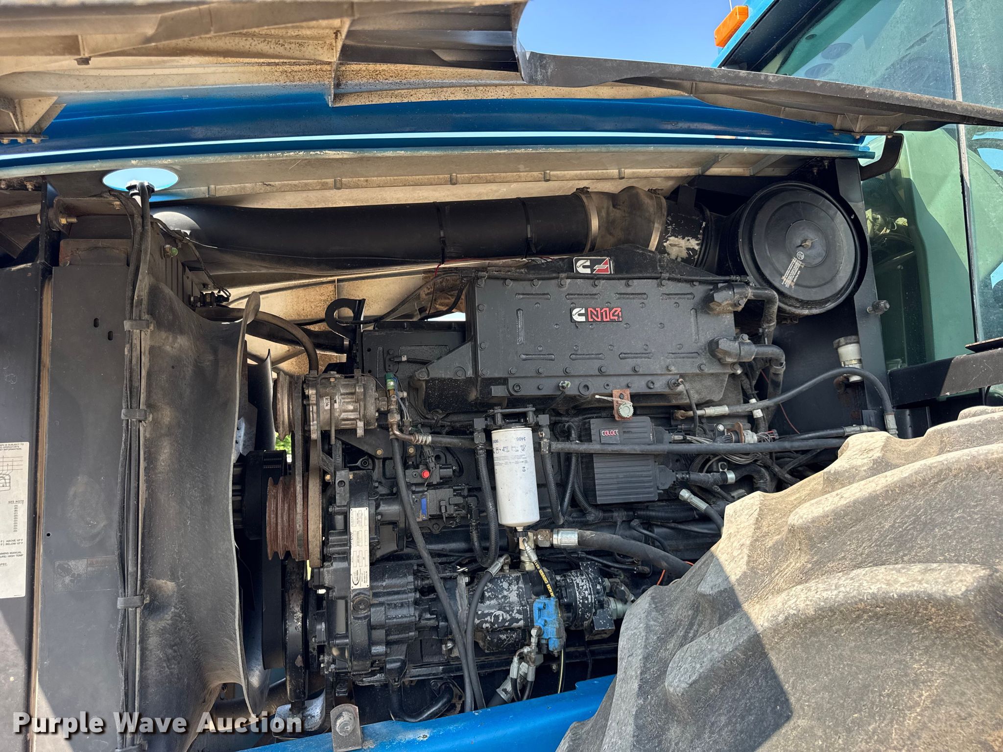 2000 New Holland 9884 4WD tractor. Hours: 7,571 on meter, Serial: 108139. Engine Cummins N14, Cylinders: 6, Fuel type: Diesel, HP: 425. Transmission Synchro, 12F - 4R, Differential lock. Operators station AC, Heat, GPS receiver Trimble, Display Trimble CFX750, Auto steer Trimble Autopilot. Features Seven pin outlet, Hydraulic remote sets Rear: 3, Power beyond (hydraulics). Tires Size: 710/70R38, Duals, Front duals. Notes Remain engine installed at 7,450 hours. View repairs. Buerk Farms. Owaneco, IL 62555