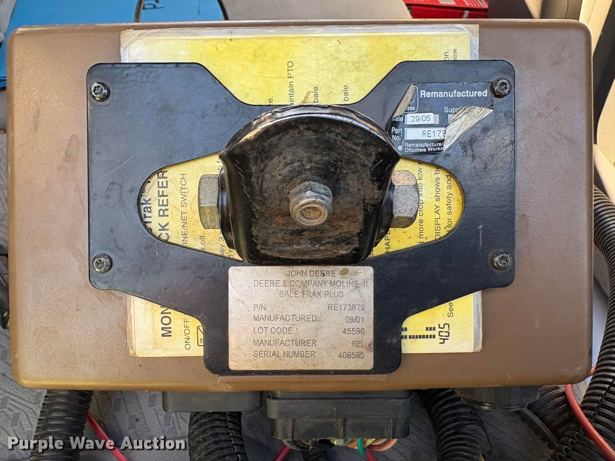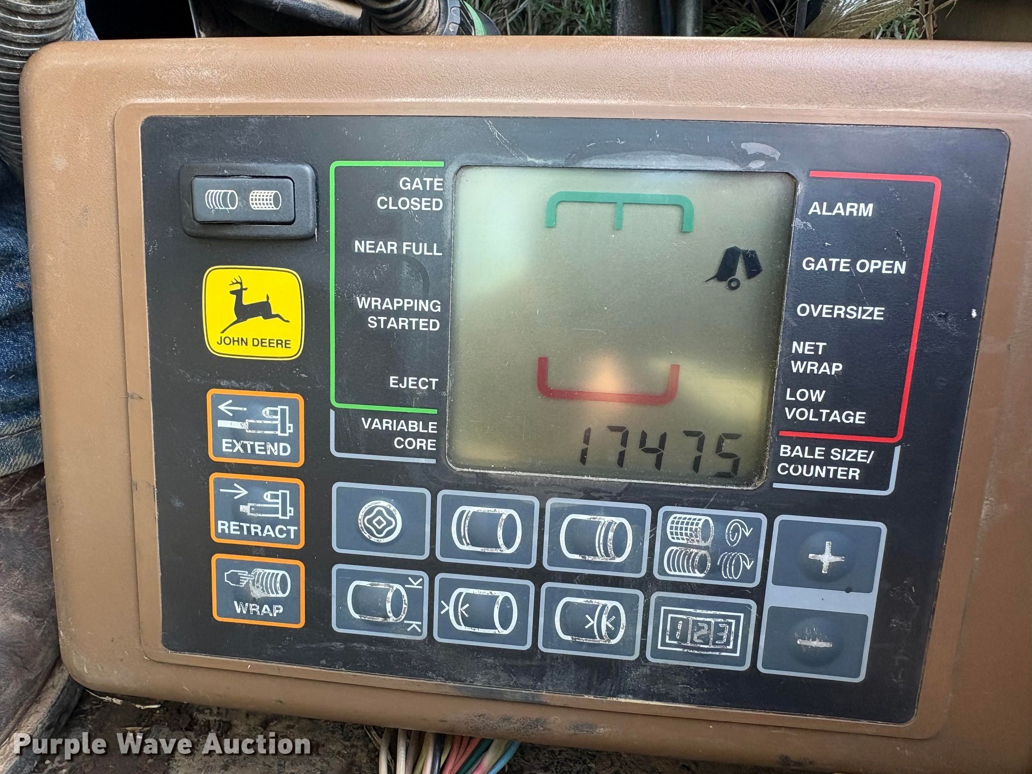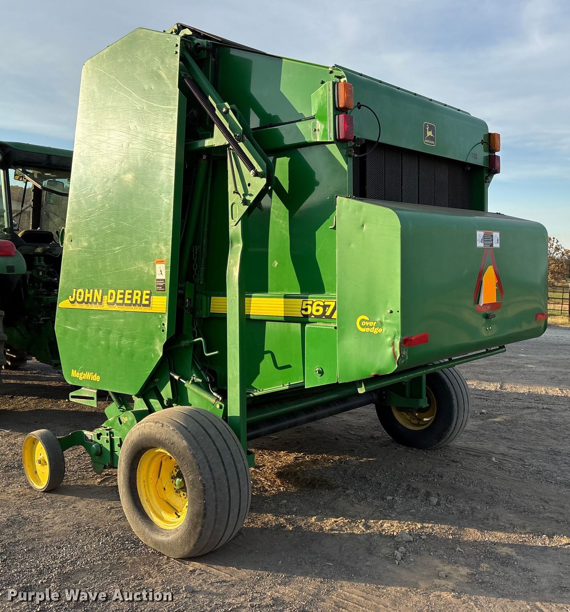2001 John Deere 567 round baler. Bale count: 17,475, Serial: E00567X155492. Features PTO: 540, Monitor John Deere Baletrack, Gauge wheels Size: 15", Pickup width: 76"", Bale size: 5' x 6', Twine tie, Net-wrap, Bale kicker. Tires Size: 31x13.50-15. Notes Tractor not included. Shady Point, OK 74956