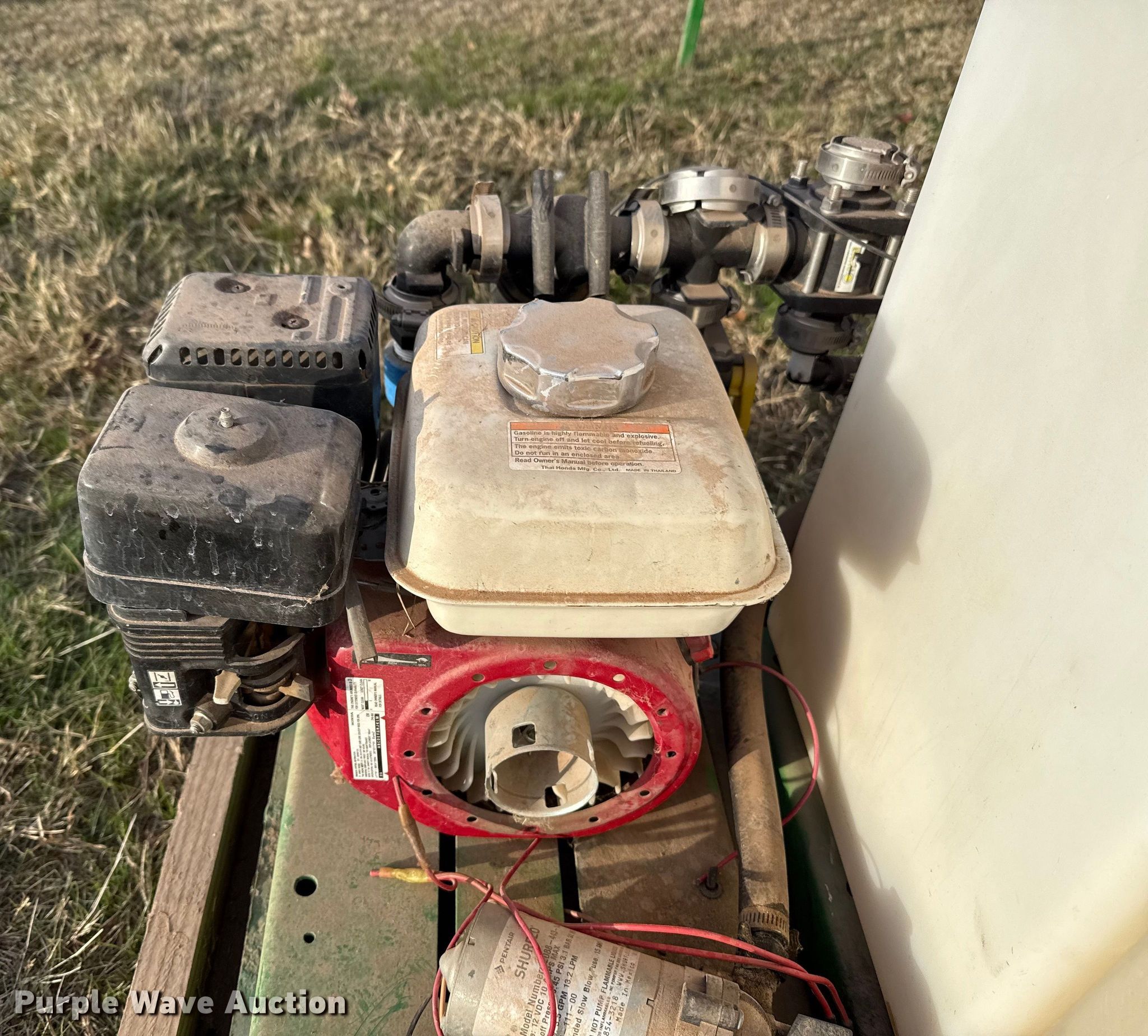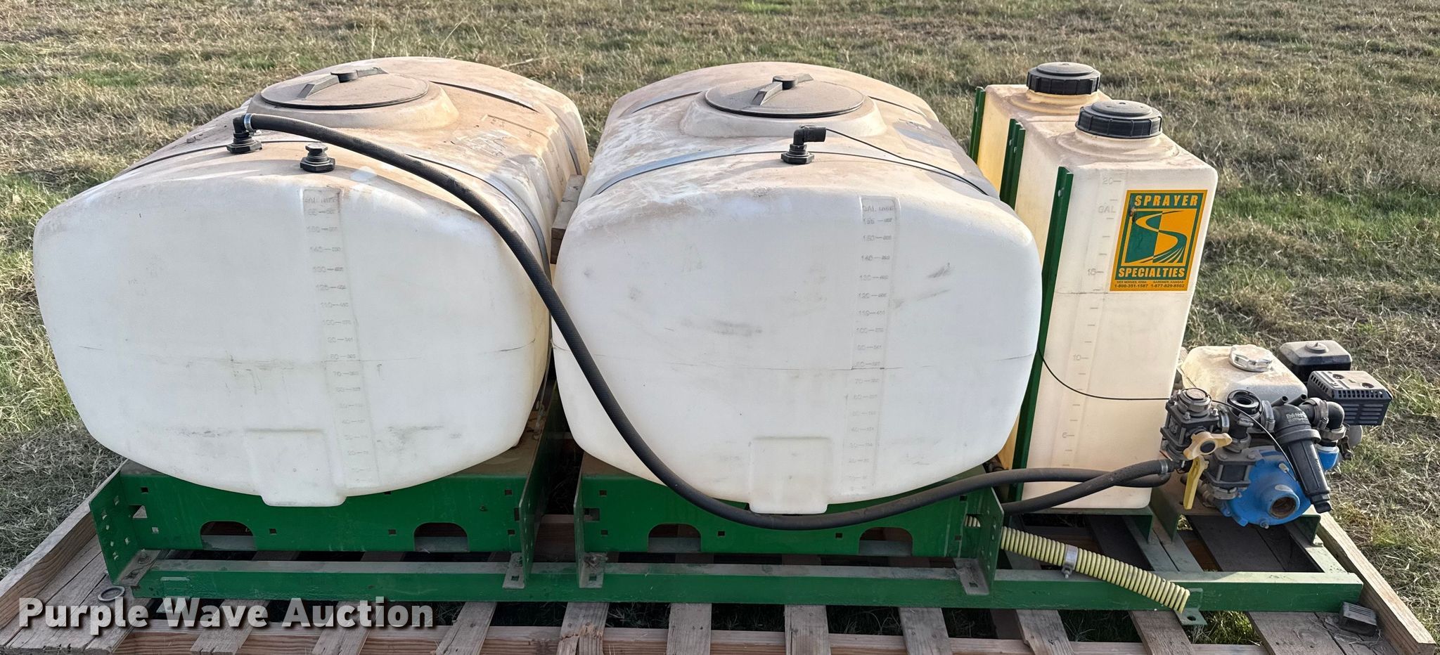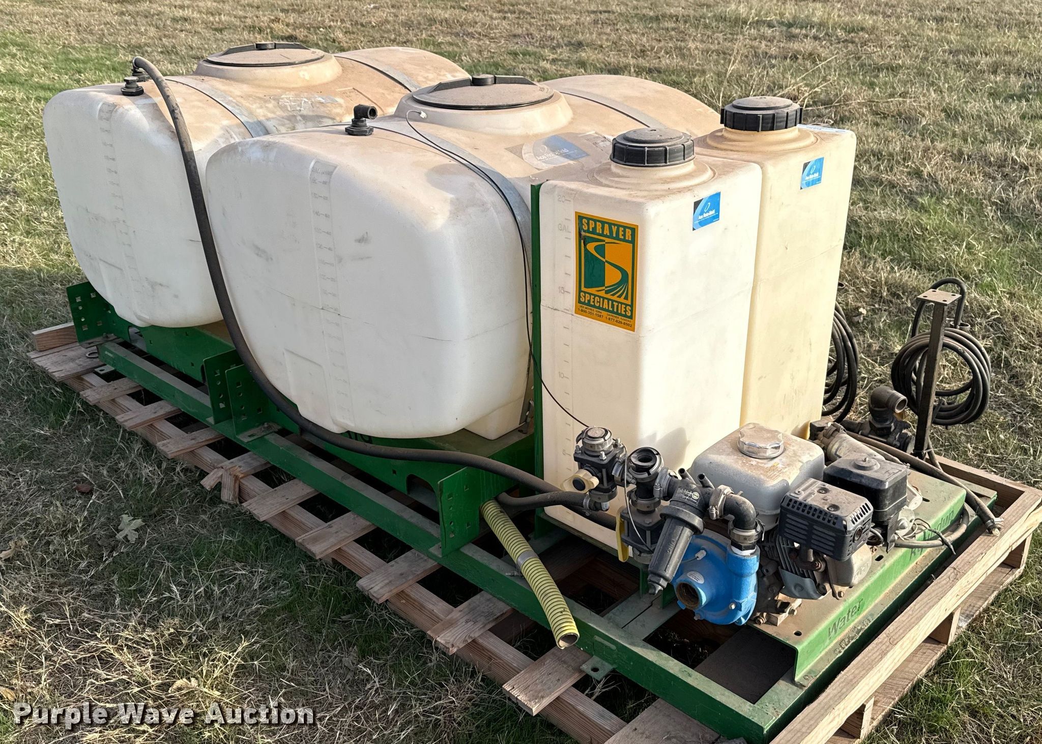 Sprayer Specialties turf sprayer. Dimensions. Overall Length: 8' 7", Width: 46". Engine Honda GX160, Cylinders: 1, Fuel type: Gas. Features (4) tanks (2) capacity: 155 gallons, (2) capacity: 20 gallons, Skid mounted. Notes Unknown operating condition. Westerberg Applications, Inc.. Kingfisher, OK 73750