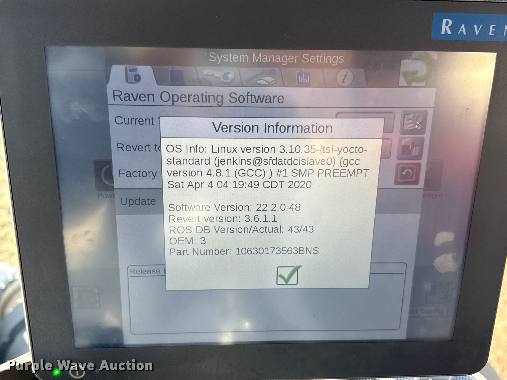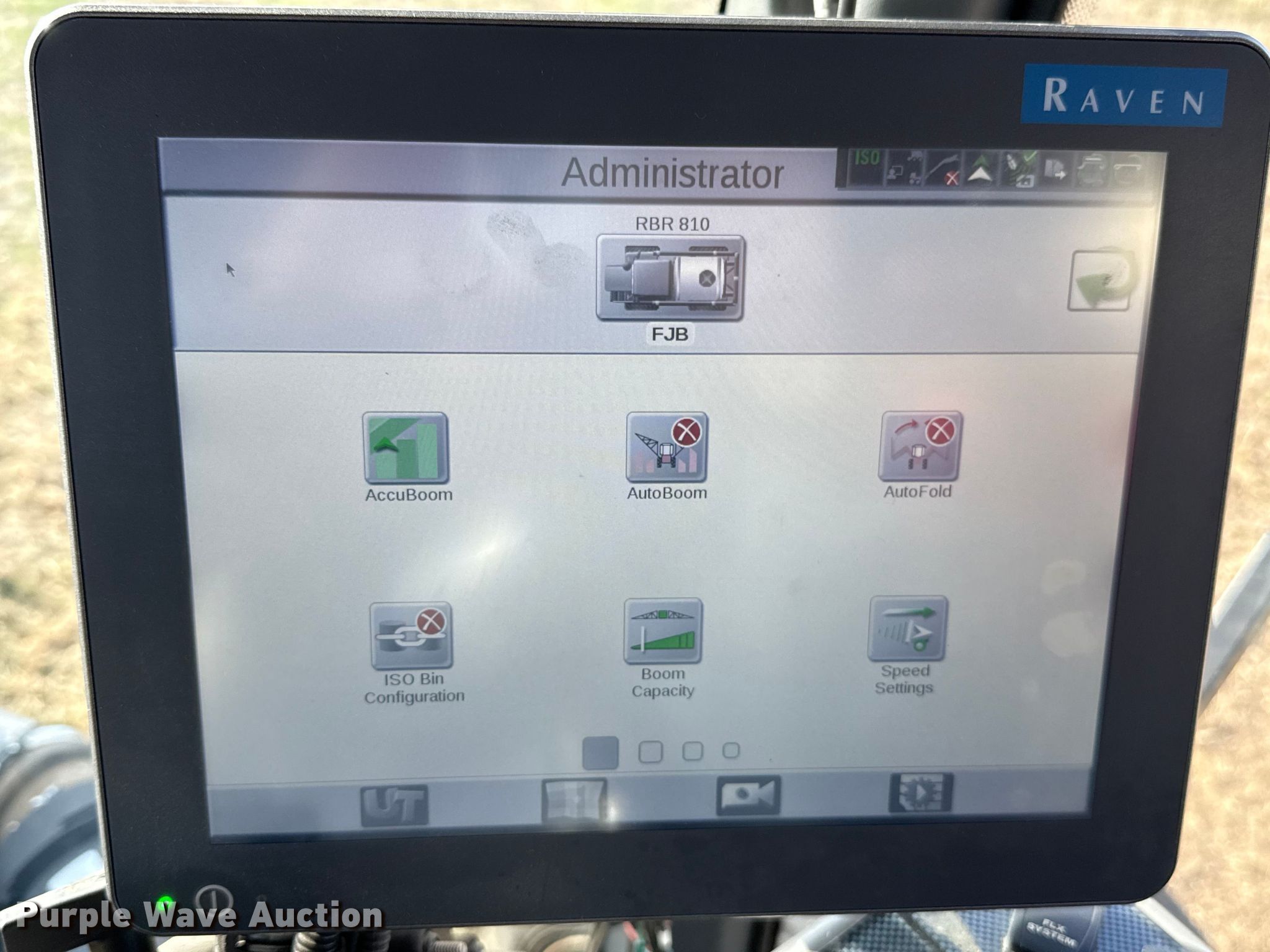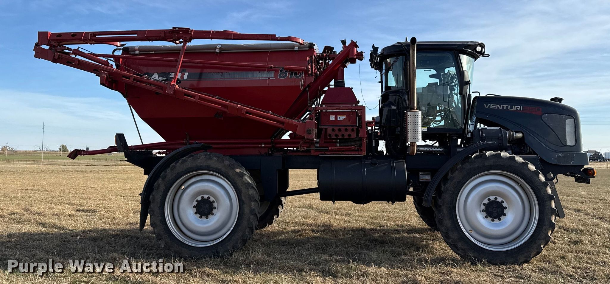 2015 RBR Venturi 350 applicator. Engine hours: 4,288 on meter, Serial: FA1506129. Engine Cummins QSL, Serial: 73711683, Displacement: 8.9L, Cylinders: 6, Fuel type: Diesel. Transmission Allison, Automatic, Four wheel drive. Operators station AC, Heat, Rotary beacon. Features Hydraulic ladder, Boom Width: 70', Sections: 4, Hydraulic boom fold, Dry fertilizer spreader bed Case IH Flex-Air 810, Serial: YET041006, Capacity: 287 cu.ft., Length: 11', Roll tarp, Electronics GPS monitor Raven, GPS receiver Raven, Spray controls Raven Titan 4000.. Tires Size: 380/90R46, Row crop tires. Westerberg Applications, Inc.. Kingfisher, OK 73750