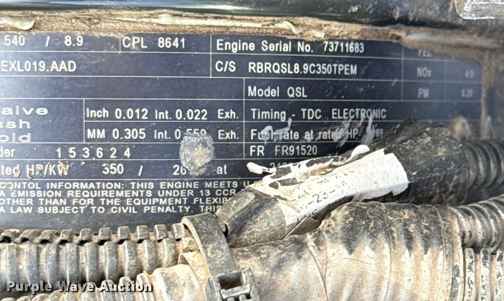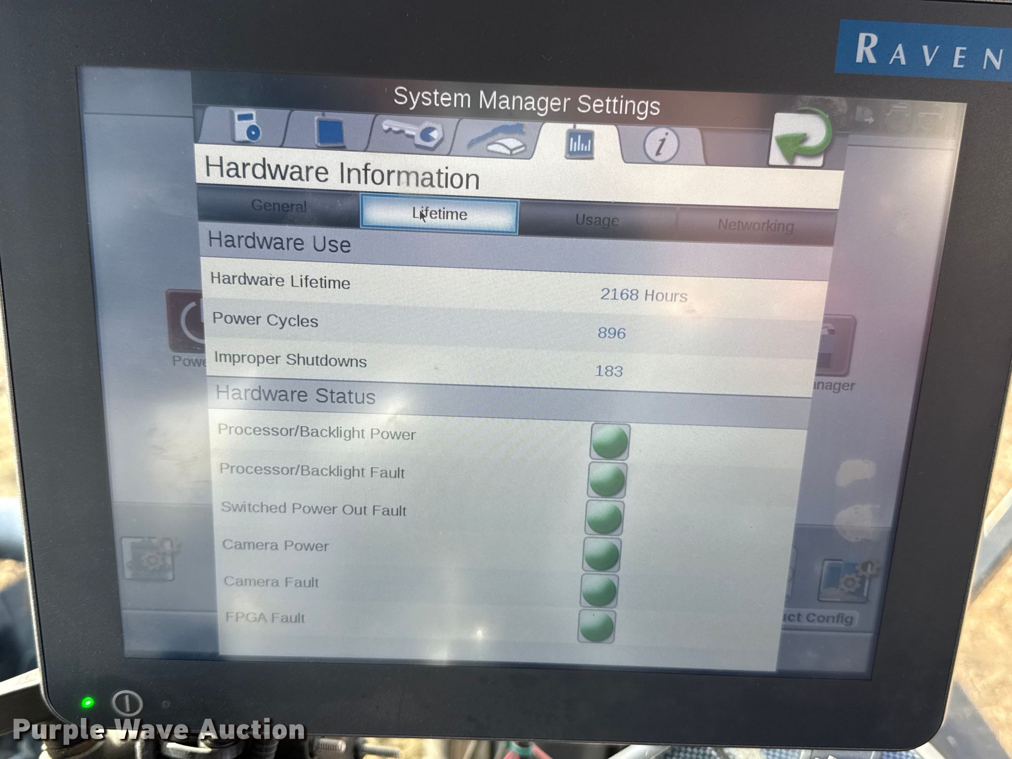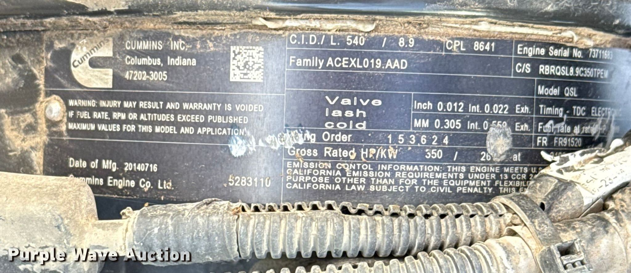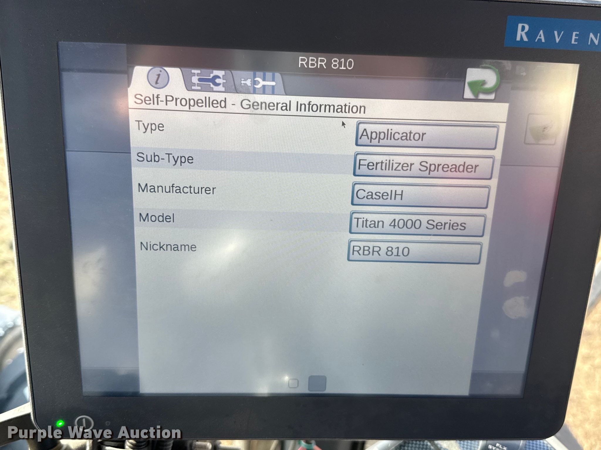 2015 RBR Venturi 350 applicator. Engine hours: 4,288 on meter, Serial: FA1506129. Engine Cummins QSL, Serial: 73711683, Displacement: 8.9L, Cylinders: 6, Fuel type: Diesel. Transmission Allison, Automatic, Four wheel drive. Operators station AC, Heat, Rotary beacon. Features Hydraulic ladder, Boom Width: 70', Sections: 4, Hydraulic boom fold, Dry fertilizer spreader bed Case IH Flex-Air 810, Serial: YET041006, Capacity: 287 cu.ft., Length: 11', Roll tarp, Electronics GPS monitor Raven, GPS receiver Raven, Spray controls Raven Titan 4000.. Tires Size: 380/90R46, Row crop tires. Westerberg Applications, Inc.. Kingfisher, OK 73750