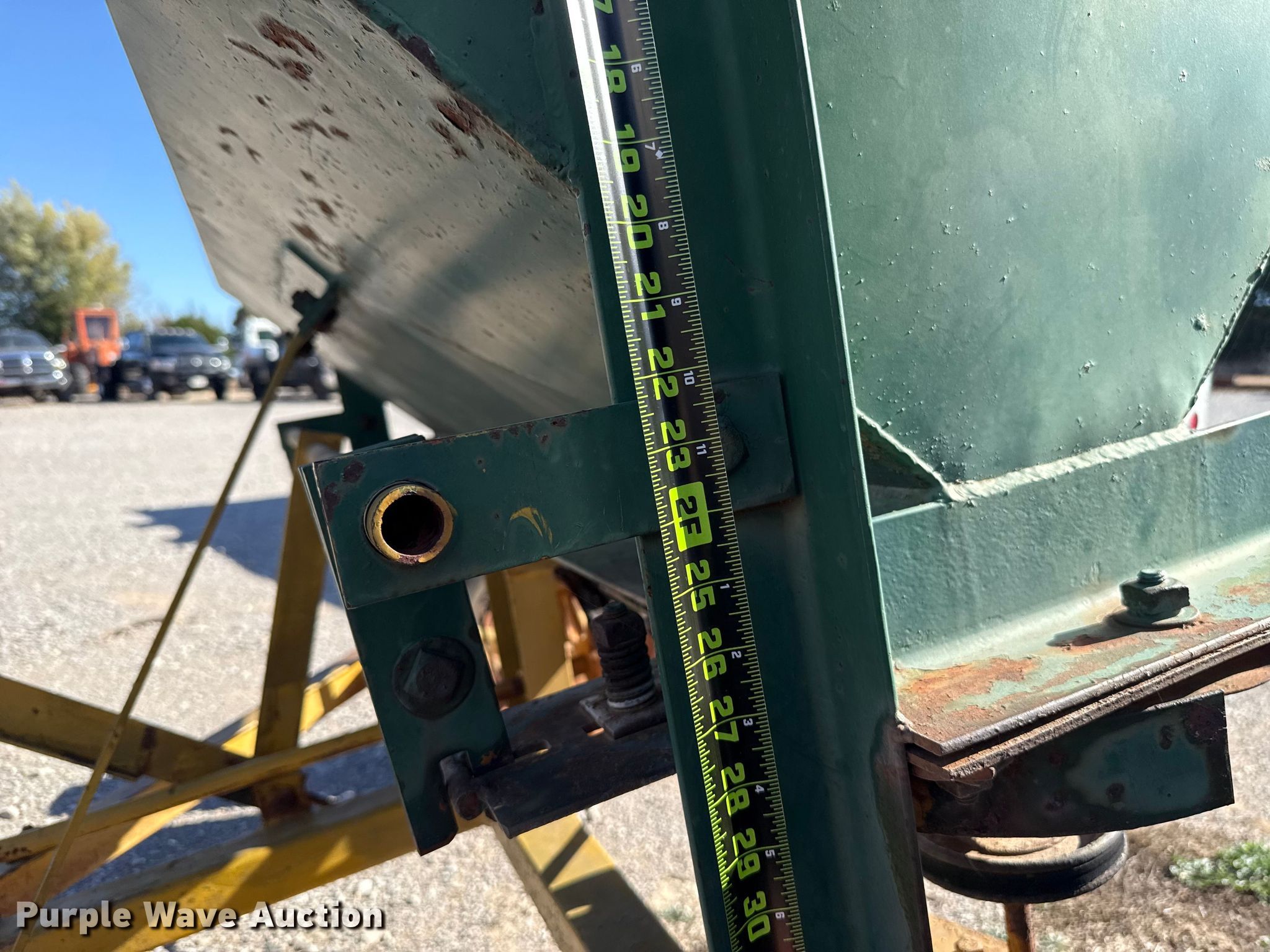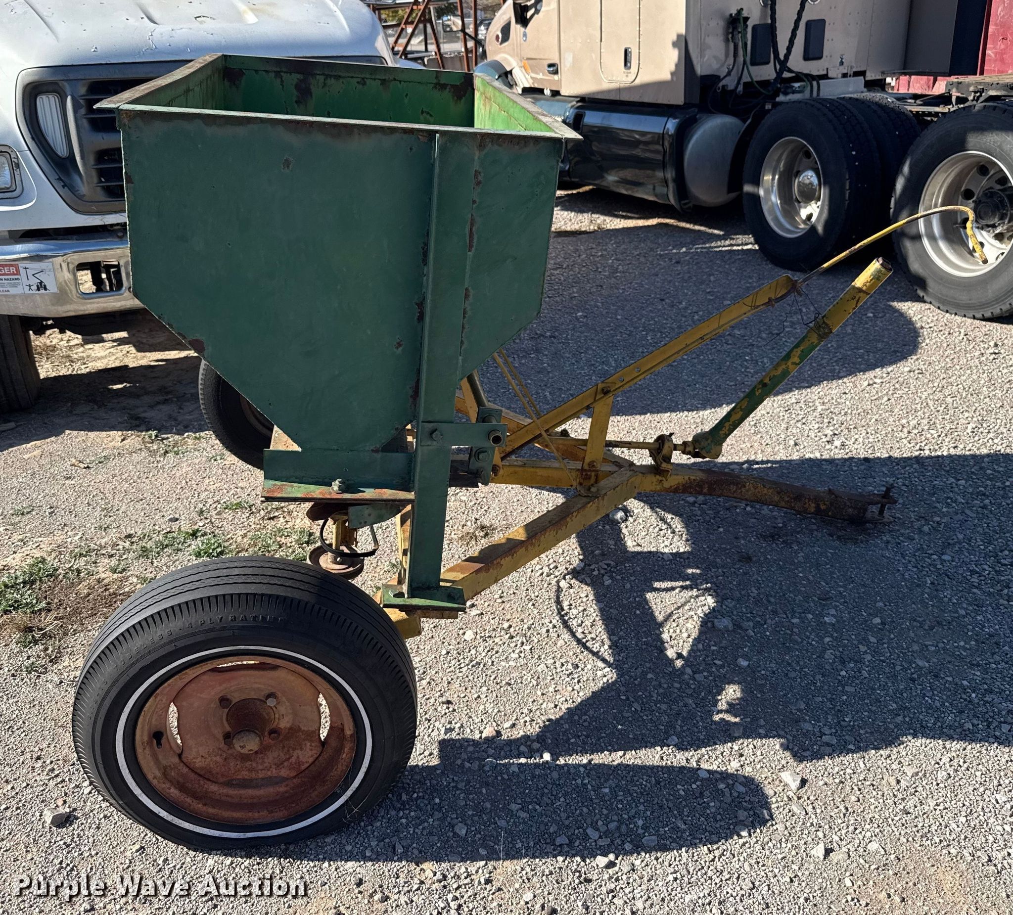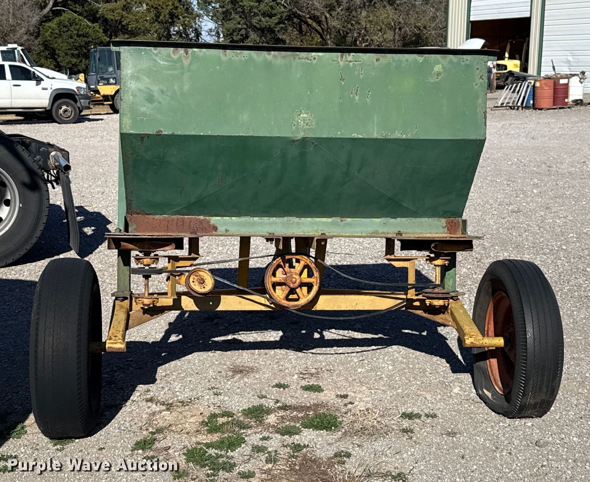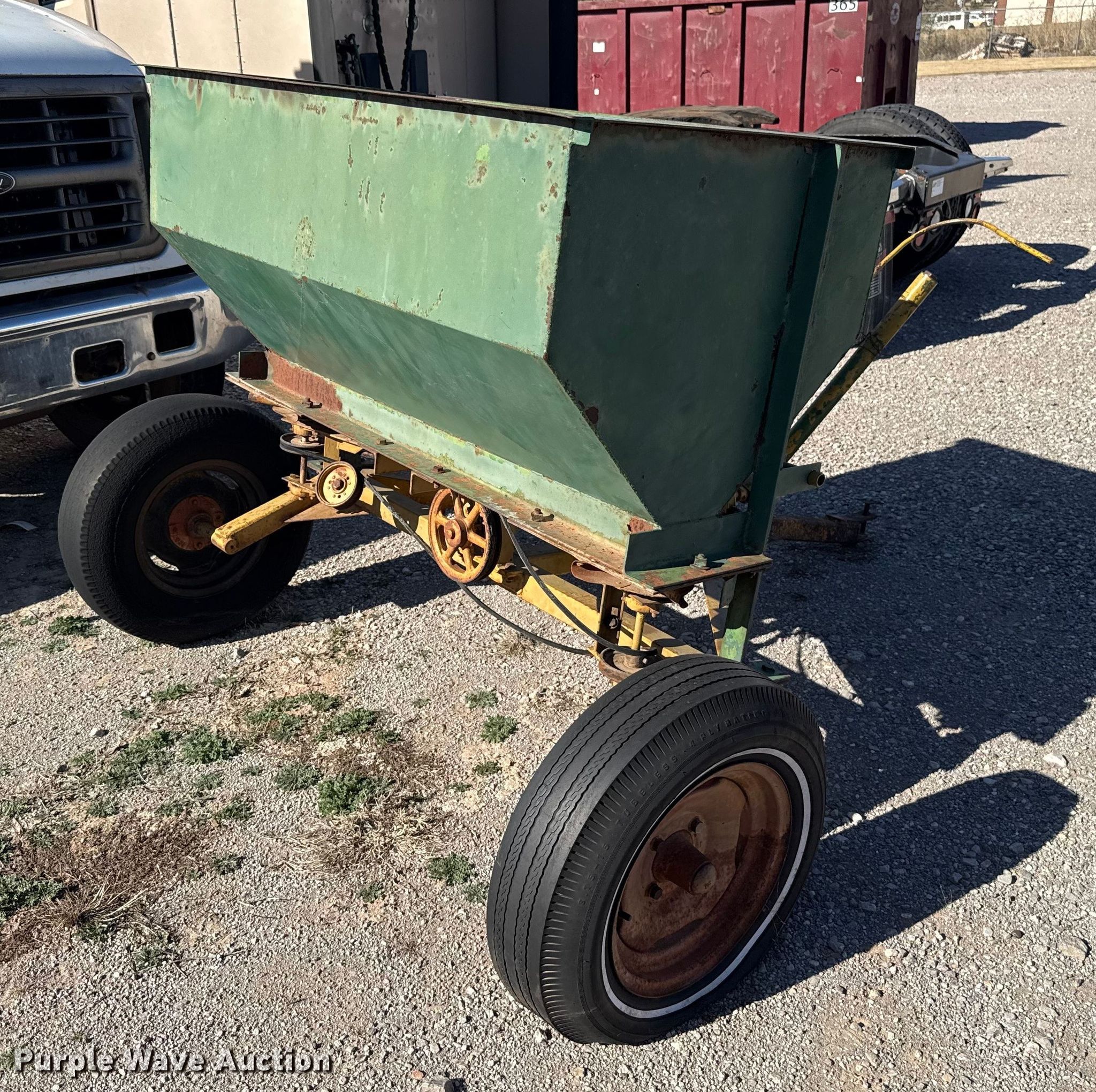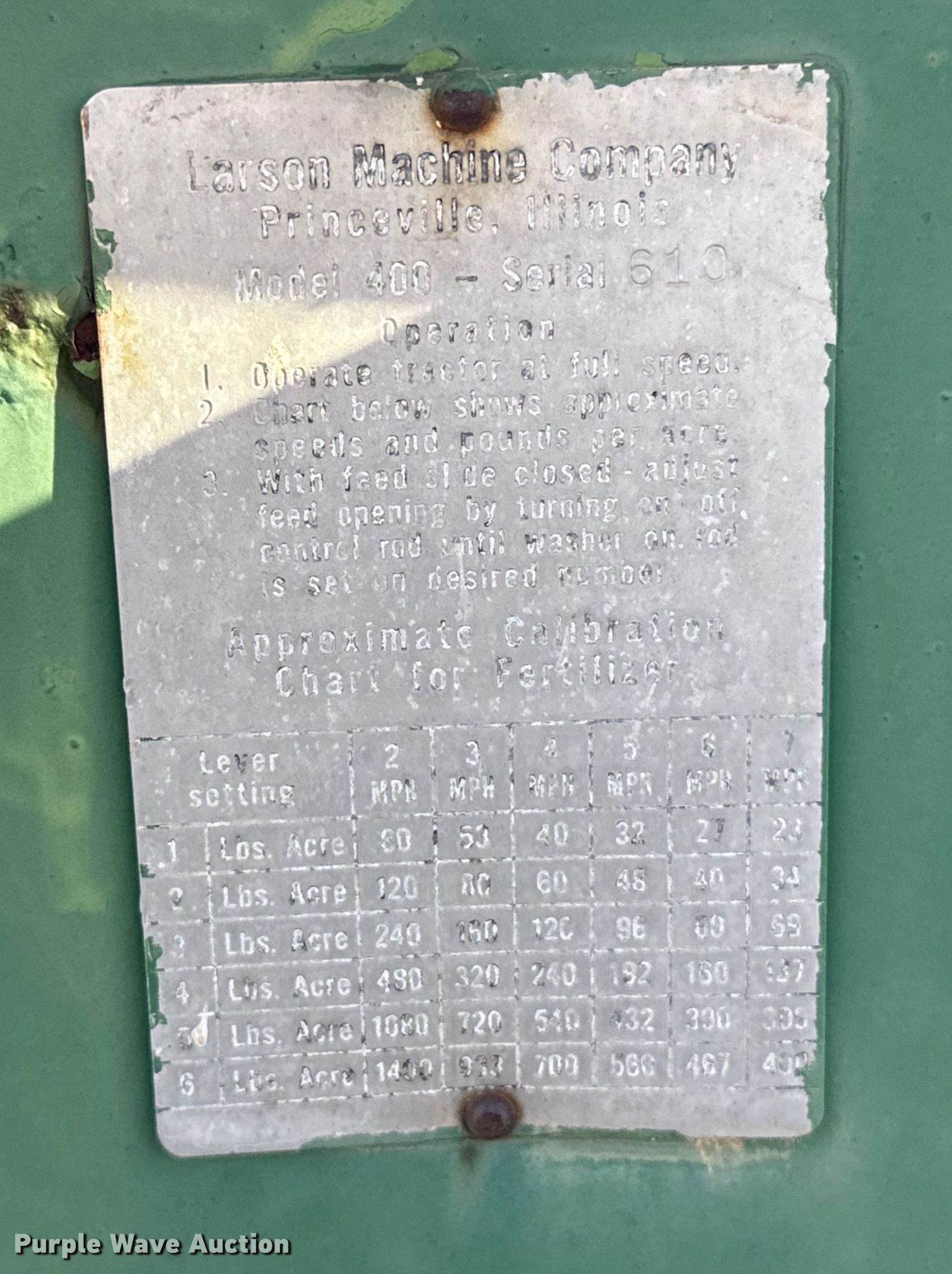 Larson 400 spreader. Serial: 610. Features Shut-off gate: Manual. Tires Size: 8.15-15. Notes Flat tires, PTO half shaft missing, Unknown operating condition. Guthrie, OK 73044
