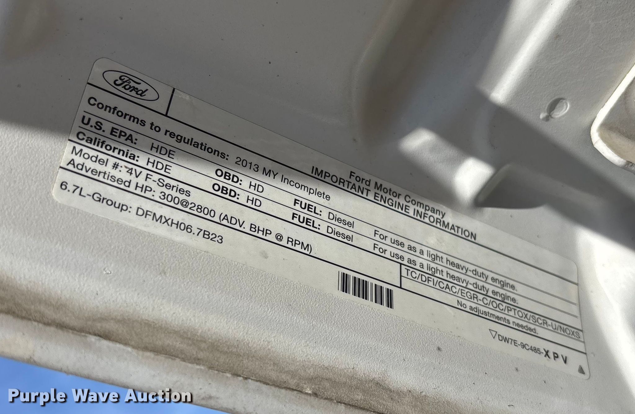2013 Ford F550 flatbed truck. Miles: 255,781 on odometer, VIN: 1FDUF5HT1DEA26302. Engine Ford, Displacement: 6.7L, Cylinders: 8, Fuel type: Diesel, HP: 300. Transmission Automatic. Chassis Four wheel drive, Axles: Single, Suspension: Spring, Brakes: Hydraulic, GVWR: 18,000 lbs, Wheelbase: 165". Interior AC, Heat, Power windows, Power locks, Cruise control, Backup camera, Auxiliary controls, Brake controller. Features Bed Flatbed, Length: 12' 5", Width: 90". Tires Size: 225/70R19.5. Notes Dash warning indicator: Airbag, Windshield chipped or cracked. Michigan title. Title distribution may be delayed up to 14 days from verification of funds. Keystone Cooperative. Hamilton, MI 49419