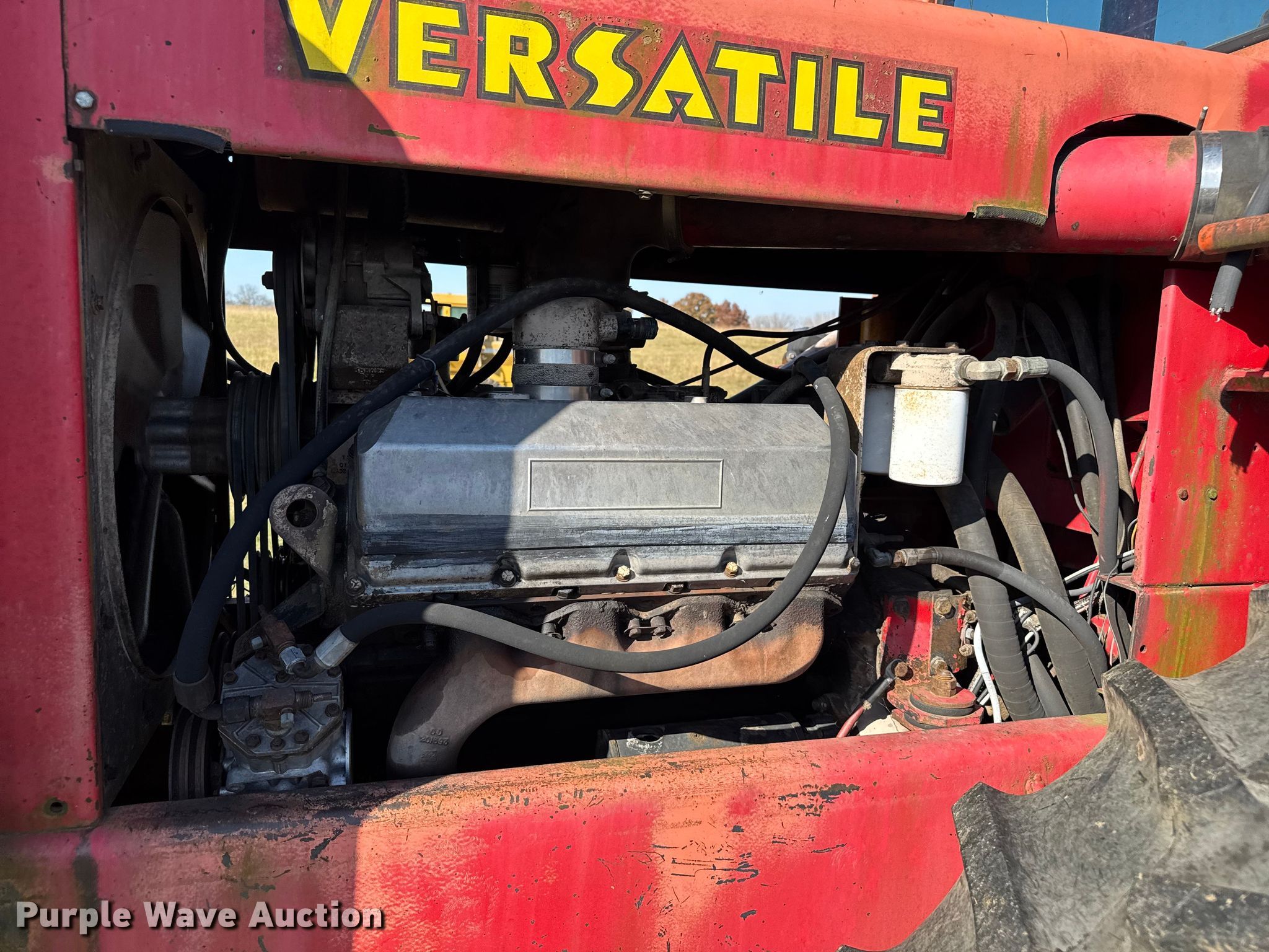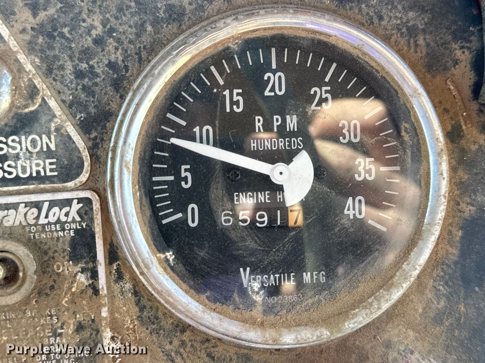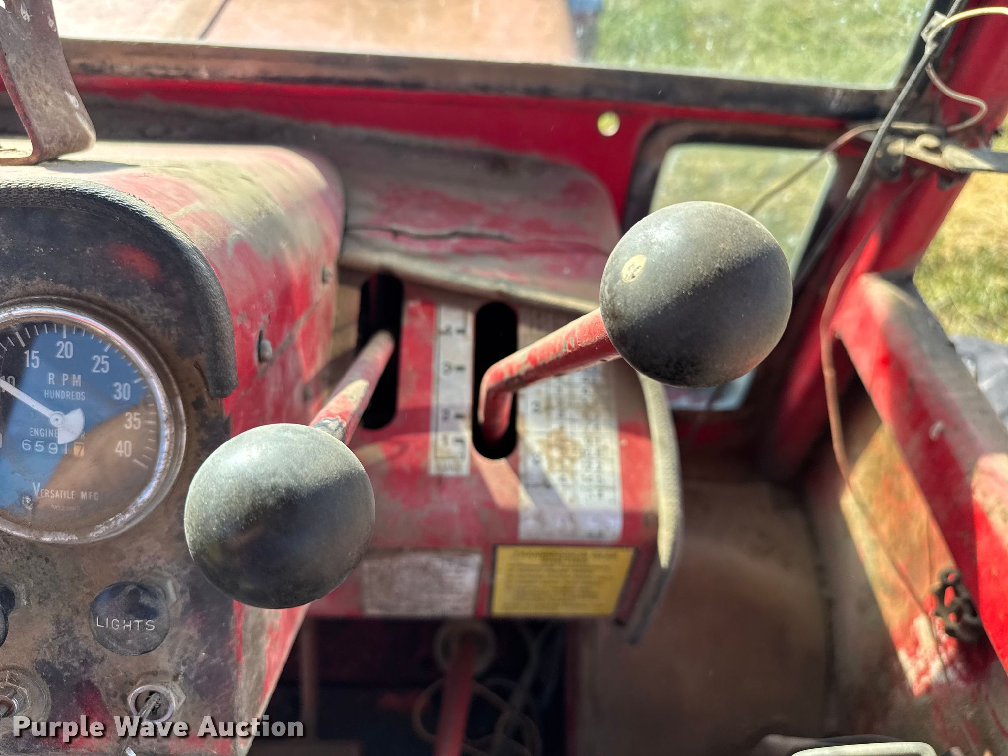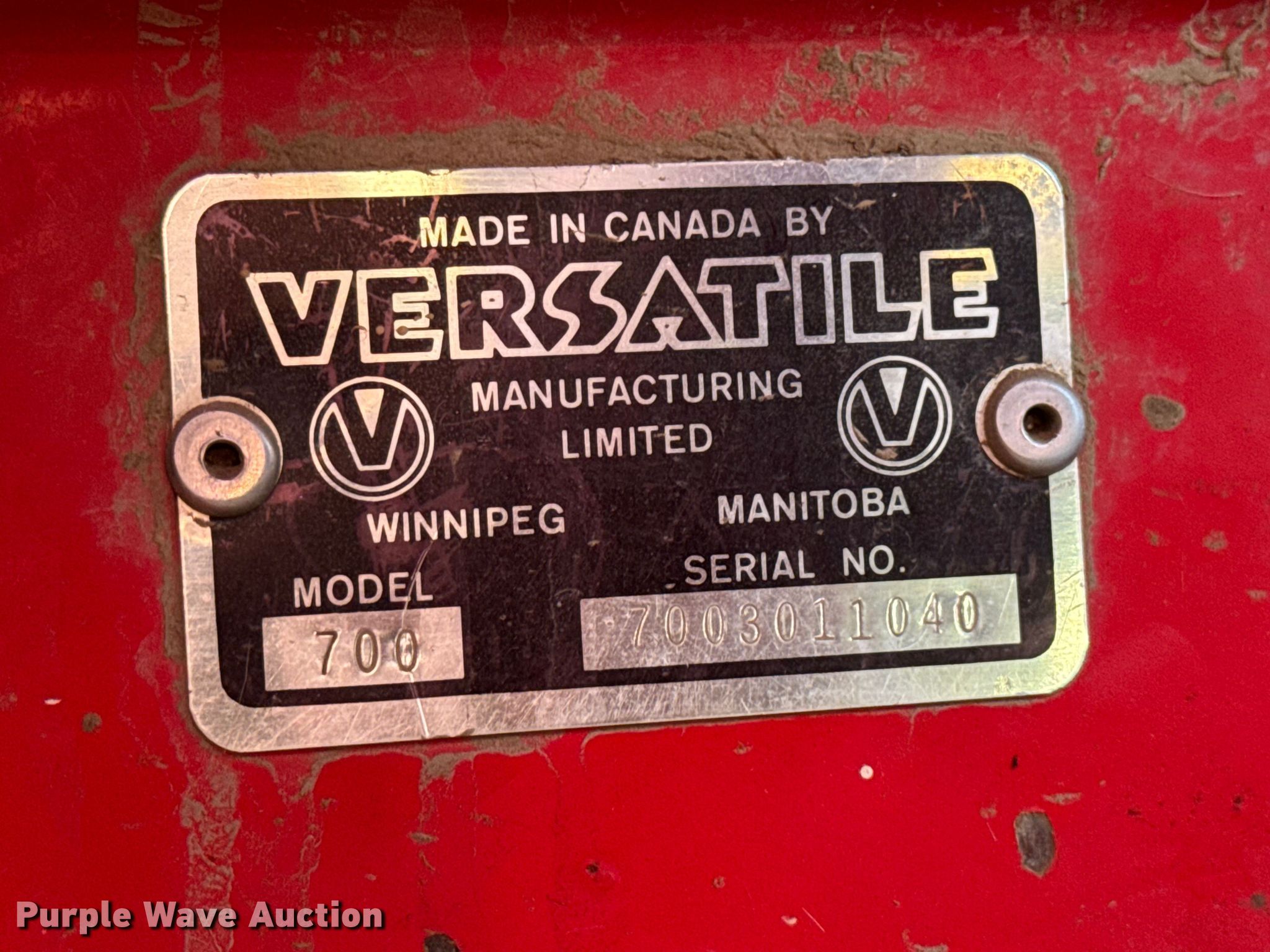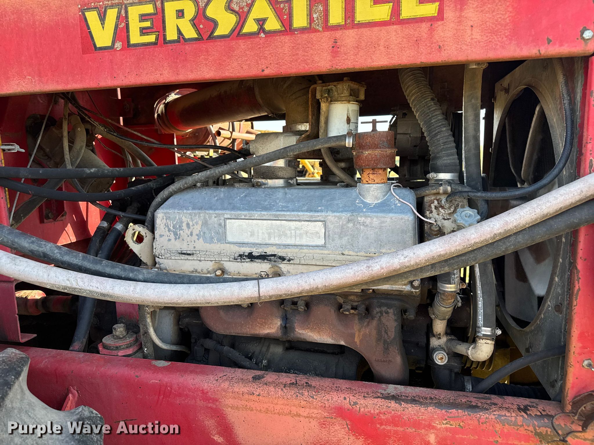1975 Versatile 700 4WD tractor. Hours: 6,592 on meter, Serial: 7003011040. Engine Cummins, Cylinders: 8, Fuel type: Diesel. Transmission Manual, 12F - 4R. Operators station Heat. Features Three point Quick attach, Hydraulic remote sets Rear: 2. Tires Size: 18.4-38. Notes Brake issues, weak. Davies Farms. Dawn, MO 64638