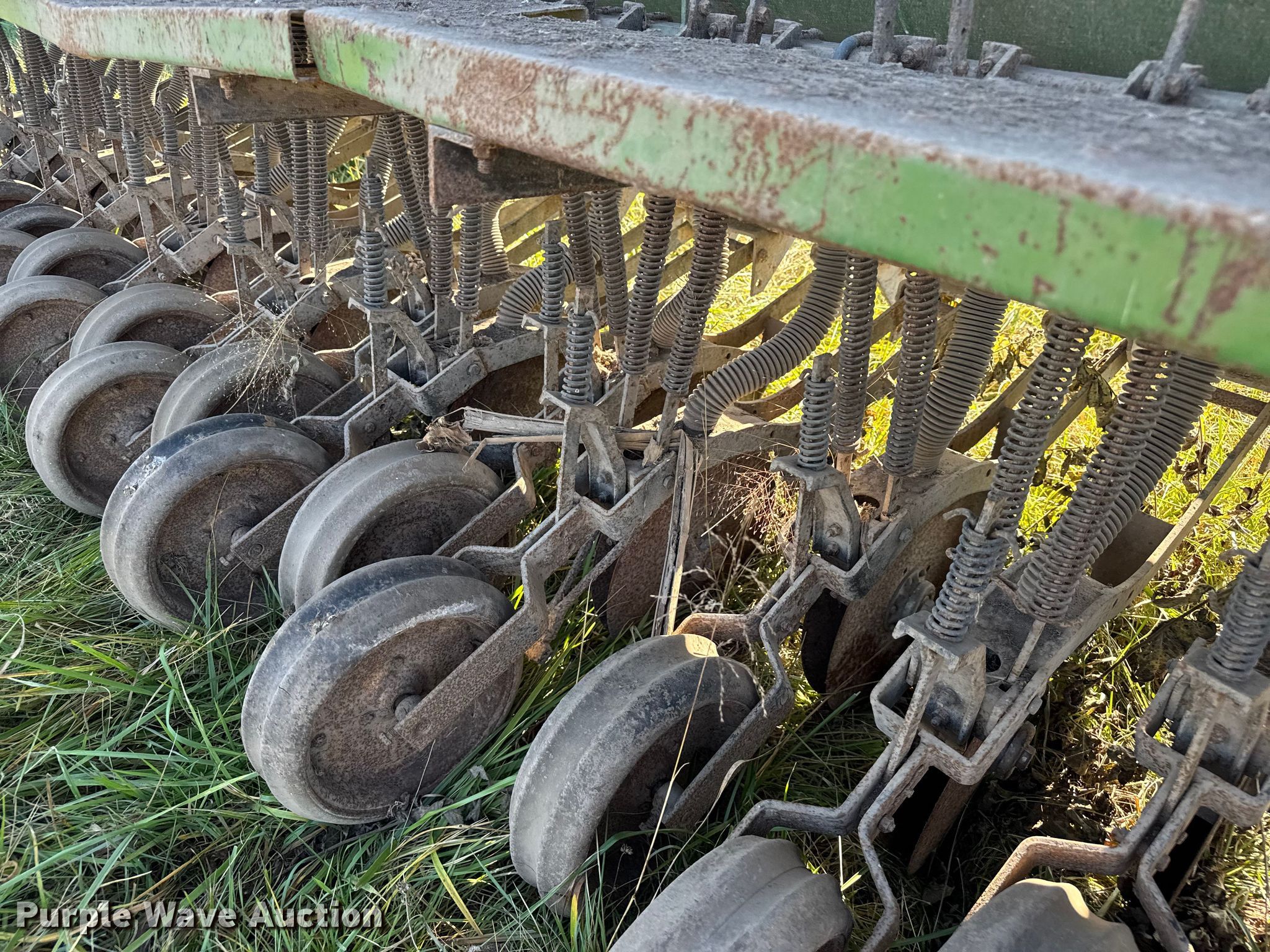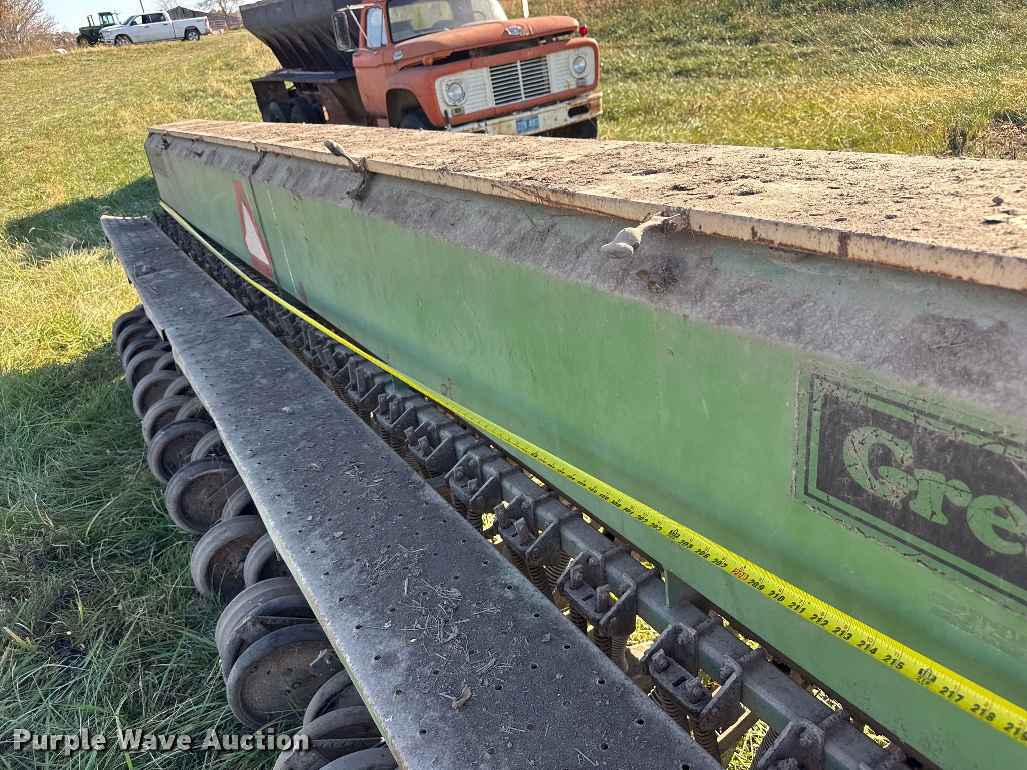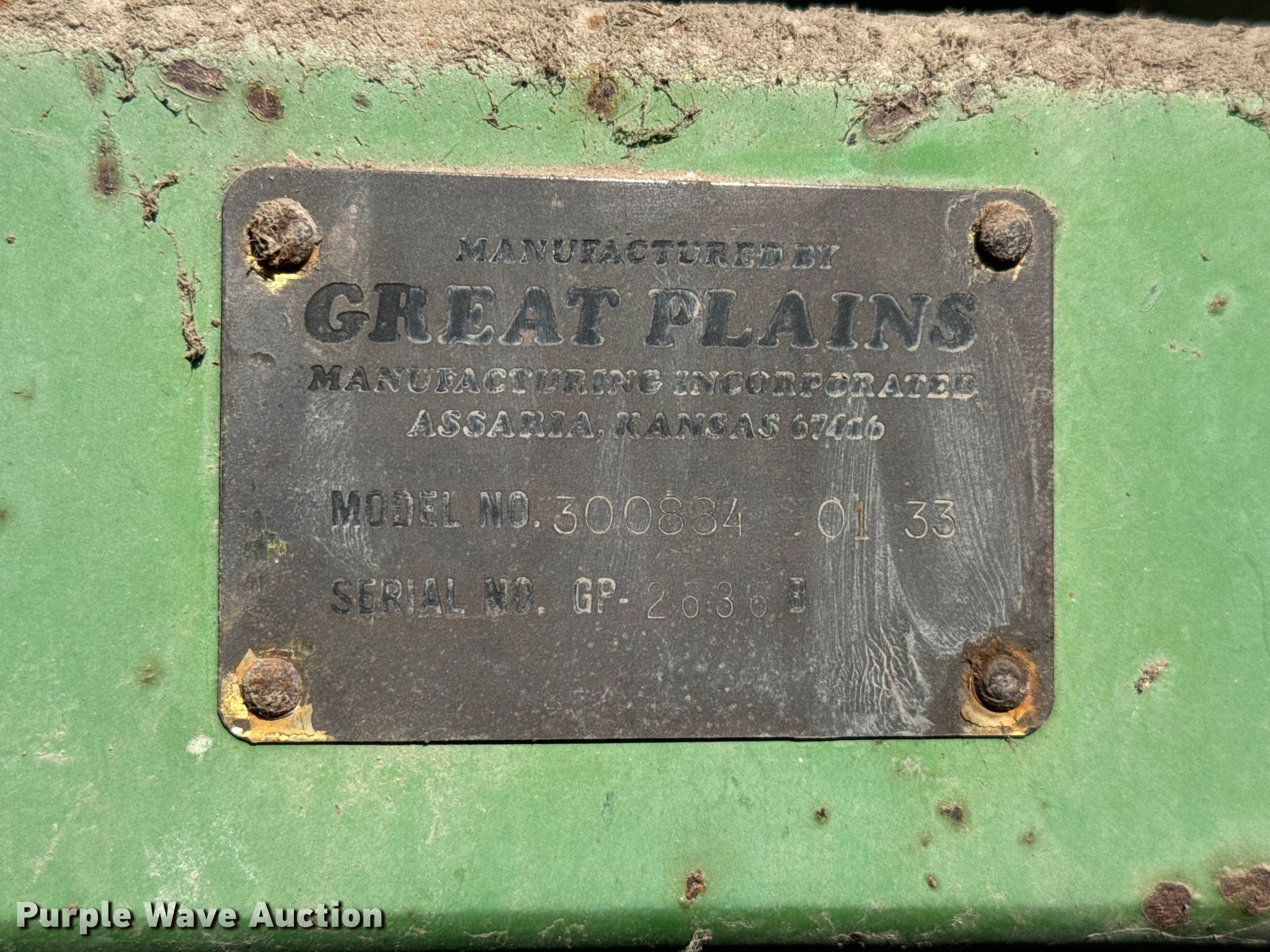 Great Plains 3000884 grain drill. Width: 20', Row units: 30, Row spacing: 10", Serial: 20363B. Features Frame Hitch: Three point, Seed delivery Bulk fill system, Row units Meter drive: Ground, Down pressure: Spring, Disk openers: Double, Closing system: Single Type: Rubber.. Tires Transport tire size: 11L-15. Davies Farms. Dawn, MO 64638