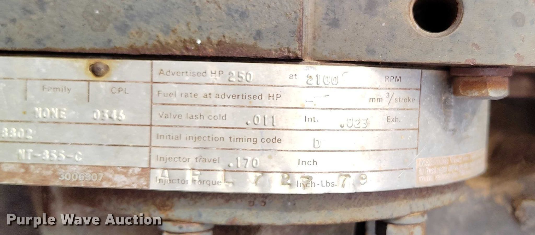 1979 Versatile 855 4WD tractor. Hours: 3,982 on meter, Serial: 151052. Engine Cummins NT-855-C, Displacement: 14.0L, Cylinders: 6, Fuel type: Diesel. Transmission Manual, 12F - 4R. Operators station AC, Heat. Features Rear: 4. Tires Front: 20.8-38, Duals. Notes Dead battery, Electric issues, wires may need replaced, Non-operational AC Compressor disconnected, Unknown operating condition. Tribune, KS 67879