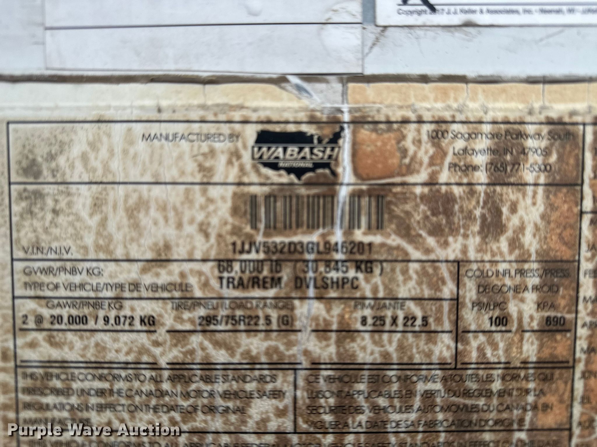2016 Wabash DVLSHPC dry van trailer. VIN: 1JJV532D3GL946201, Unit #: 46201. Dimensions Overall Length: 53', Width: 102". Features Deck type: Wood. Chassis Landing gear: Dual, Suspension: Air, Brakes: Air, Axles: Tandem Sliding, GVWR: 68,000 lbs, GAWR: 20,000 lbs. Tires Steel wheels, Size: 275/80R22.5. Oklahoma title. Title distribution may be delayed up to 30 days from verification of funds. Voyager Express Inc. Denver, CO 80221