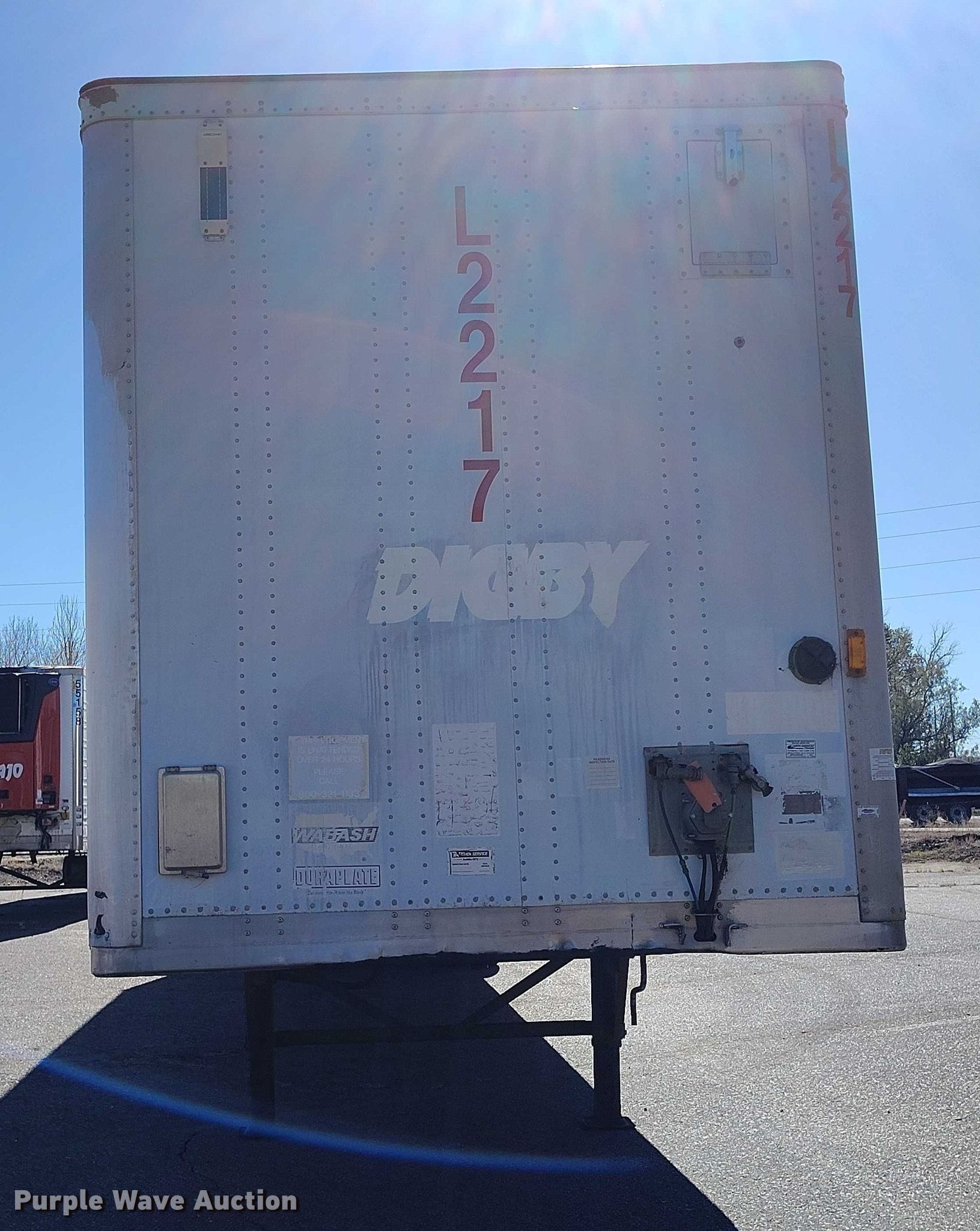 2002 Wabash dry van trailer. VIN: 1JJV532W82L793566, Unit #: L2217. Dimensions Overall Length: 53', Width: 102". Features Deck type: Wood. Chassis Landing gear: Dual, Suspension: Air, Brakes: Air, Axles: Tandem Sliding. Tires Steel wheels, Size: 295/75R22.5. Notes Decals will be removed prior to auction. Oklahoma title. Title distribution may be delayed up to 30 days from verification of funds. Navajo Express. Denver, CO 80221