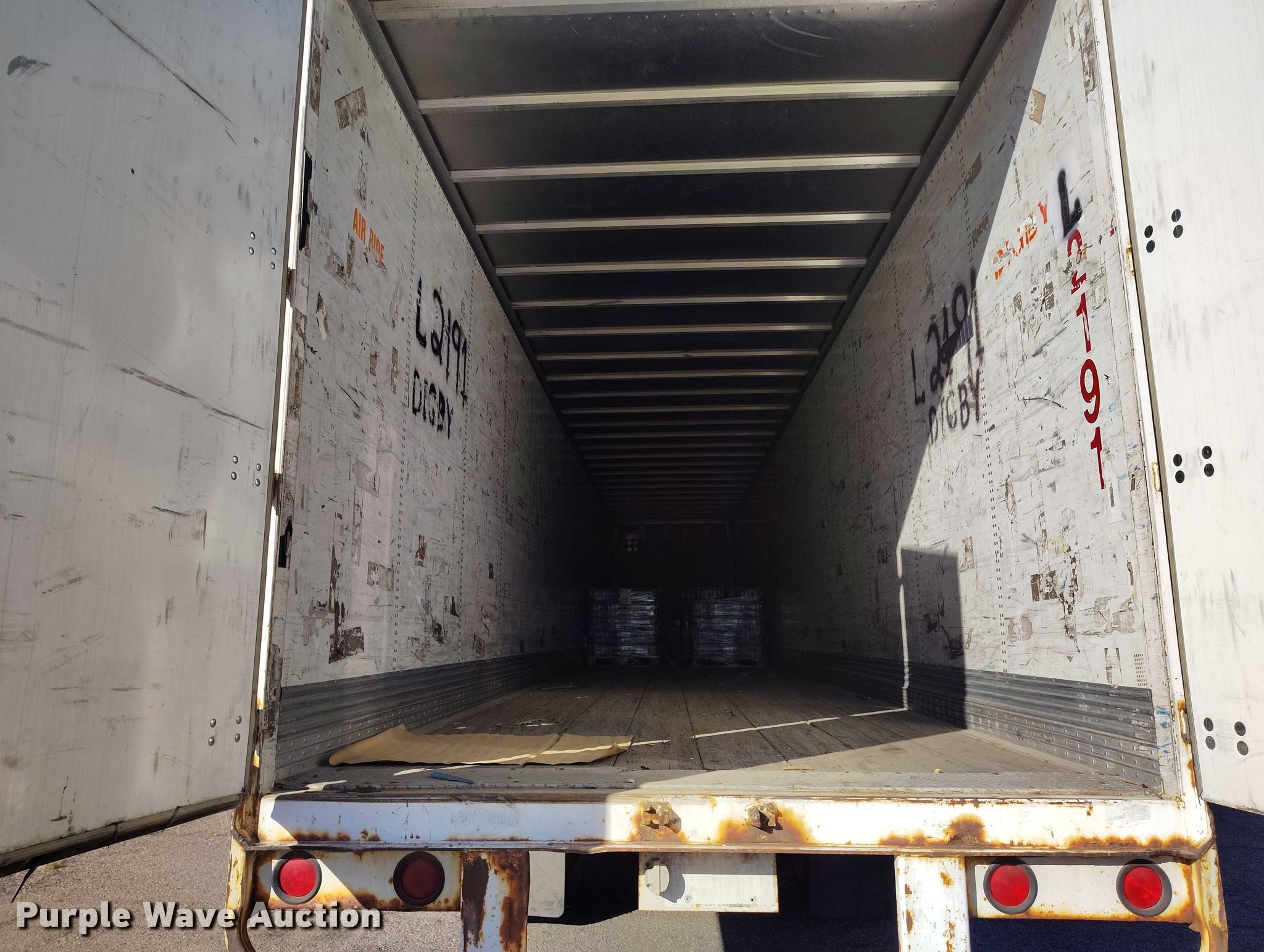 2002 Wabash dry van trailer. VIN: 1JJV532W12L793540, Unit #: L2191. Dimensions Overall Length: 53', Width: 102". Features Deck type: Wood. Chassis Landing gear: Dual, Suspension: Air, Brakes: Air, Axles: Tandem Sliding. Tires Steel wheels, Size: 295/75R22.5. Notes Contents not included, Right rear door damaged. Oklahoma title. Title distribution may be delayed up to 30 days from verification of funds. Navajo Express. Denver, CO 80221