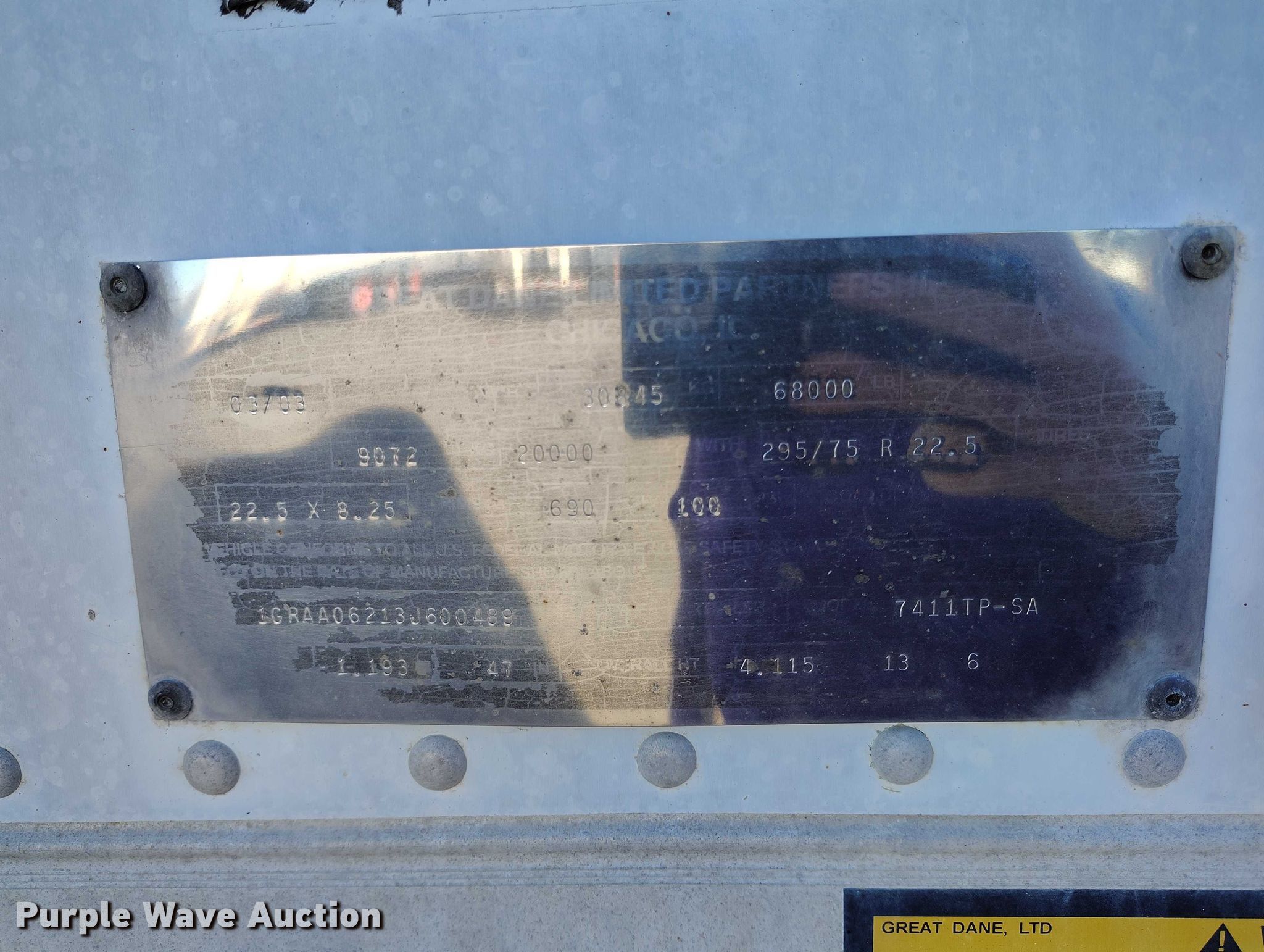 2003 Great Dane 7411TP-SA dry van trailer. VIN: 1GRAA06213J600489, Unit #: 225493. Dimensions Overall Length: 53', Width: 102". Features Deck type: Wood. Chassis Landing gear: Dual, Suspension: Spring, Brakes: Air, Axles: Tandem Sliding, GVWR: 68,000 lbs, GAWR: 20,000 lbs. Tires Steel wheels, Size: 295/75R22.5. Notes Decals will be removed prior to auction. Utah title. Title distribution may be delayed up to 30 days from verification of funds. Navajo Express. Denver, CO 80221