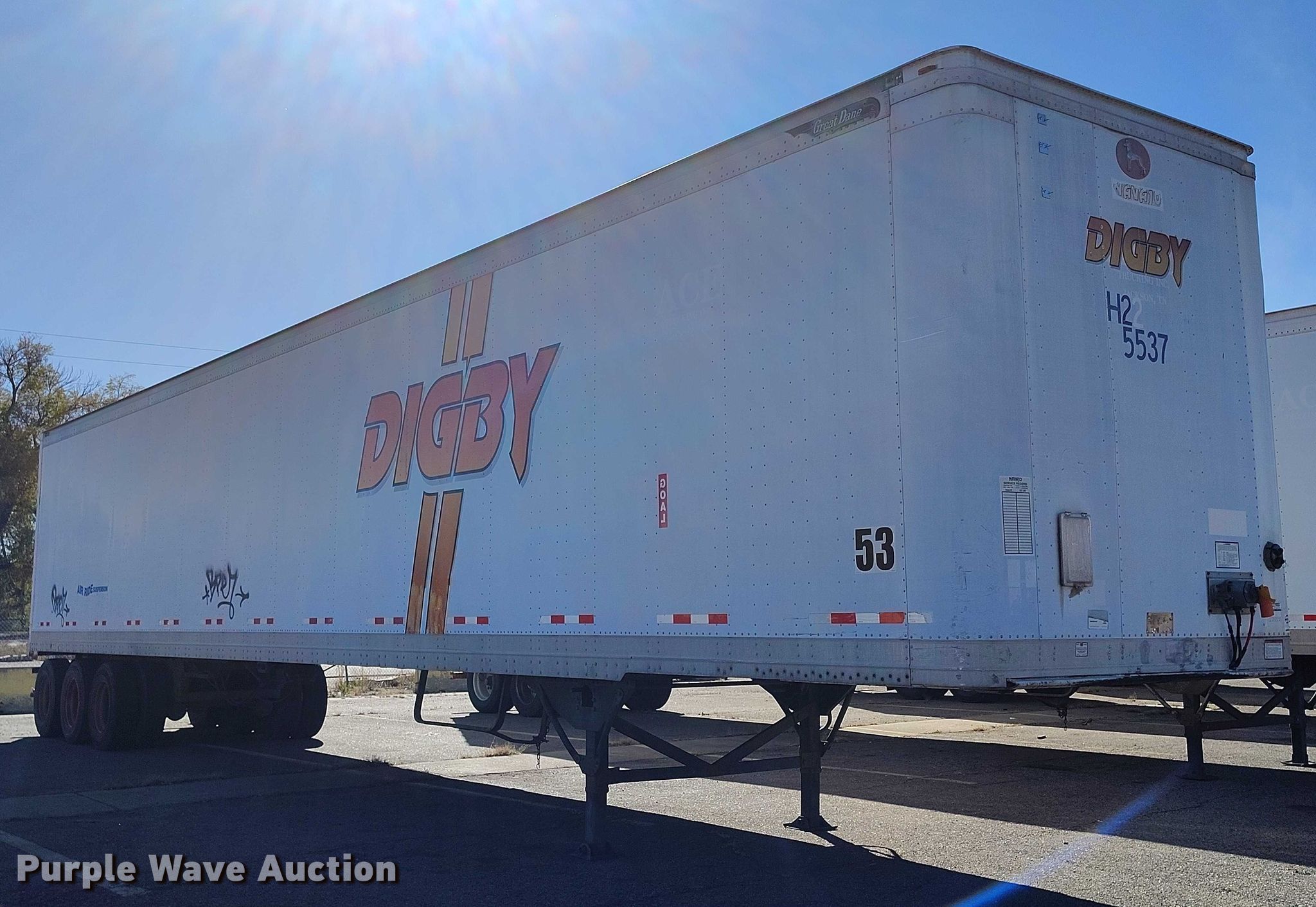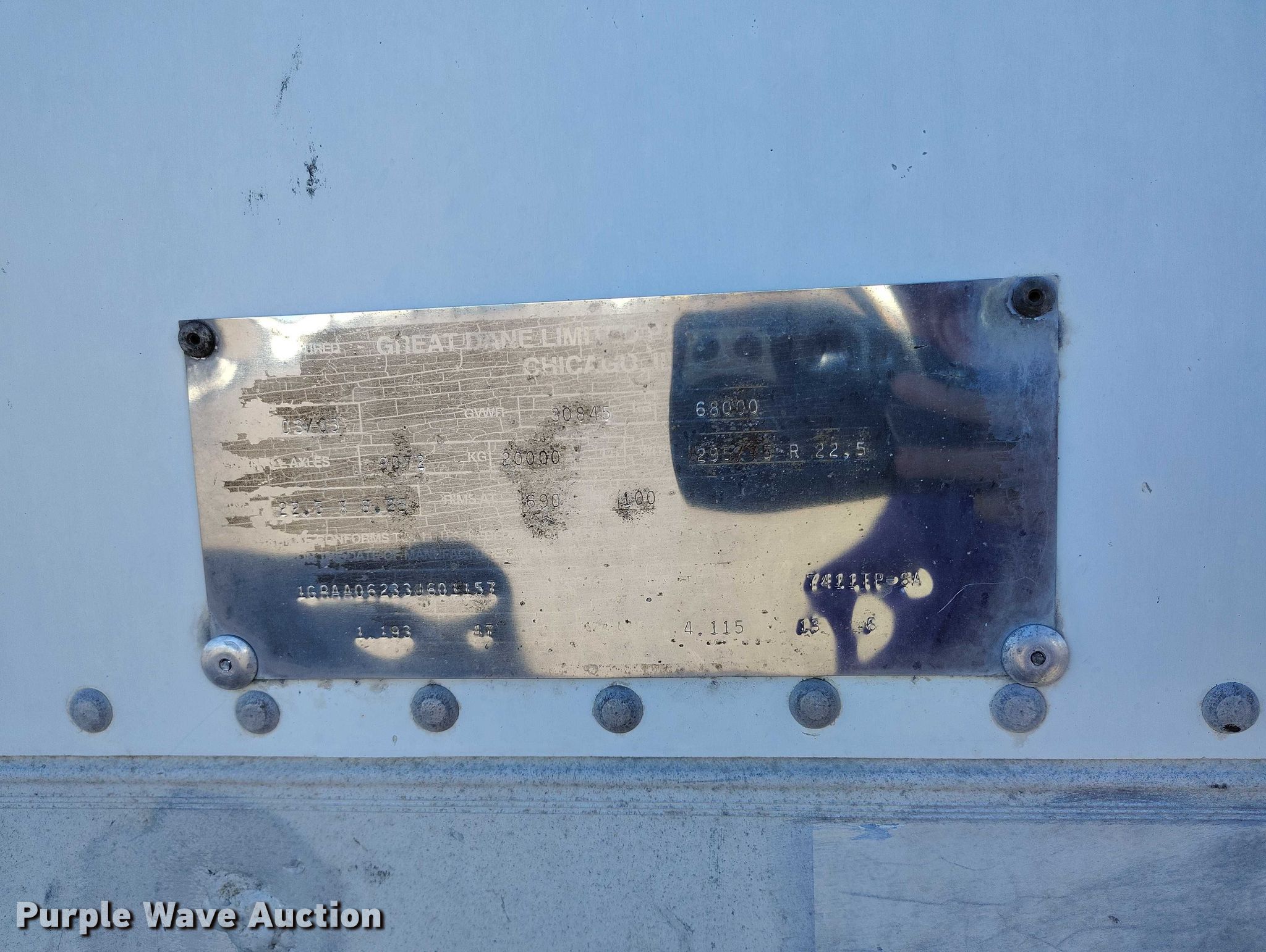 2003 Great Dane 7411TP-SA dry van trailer. VIN: 1GRAA06233J601157, Unit #: H225537. Dimensions Overall Length: 53', Width: 102". Features Deck type: Wood. Chassis Landing gear: Dual, Suspension: Air, Axles: Triple Sliding, GVWR: 68,000 lbs, GAWR: 20,000 lbs. Tires Steel wheels, Size: 275/80R22.5. Notes Decals will be removed prior to auction. Utah title. Title distribution may be delayed up to 30 days from verification of funds. Navajo Express. Denver, CO 80221