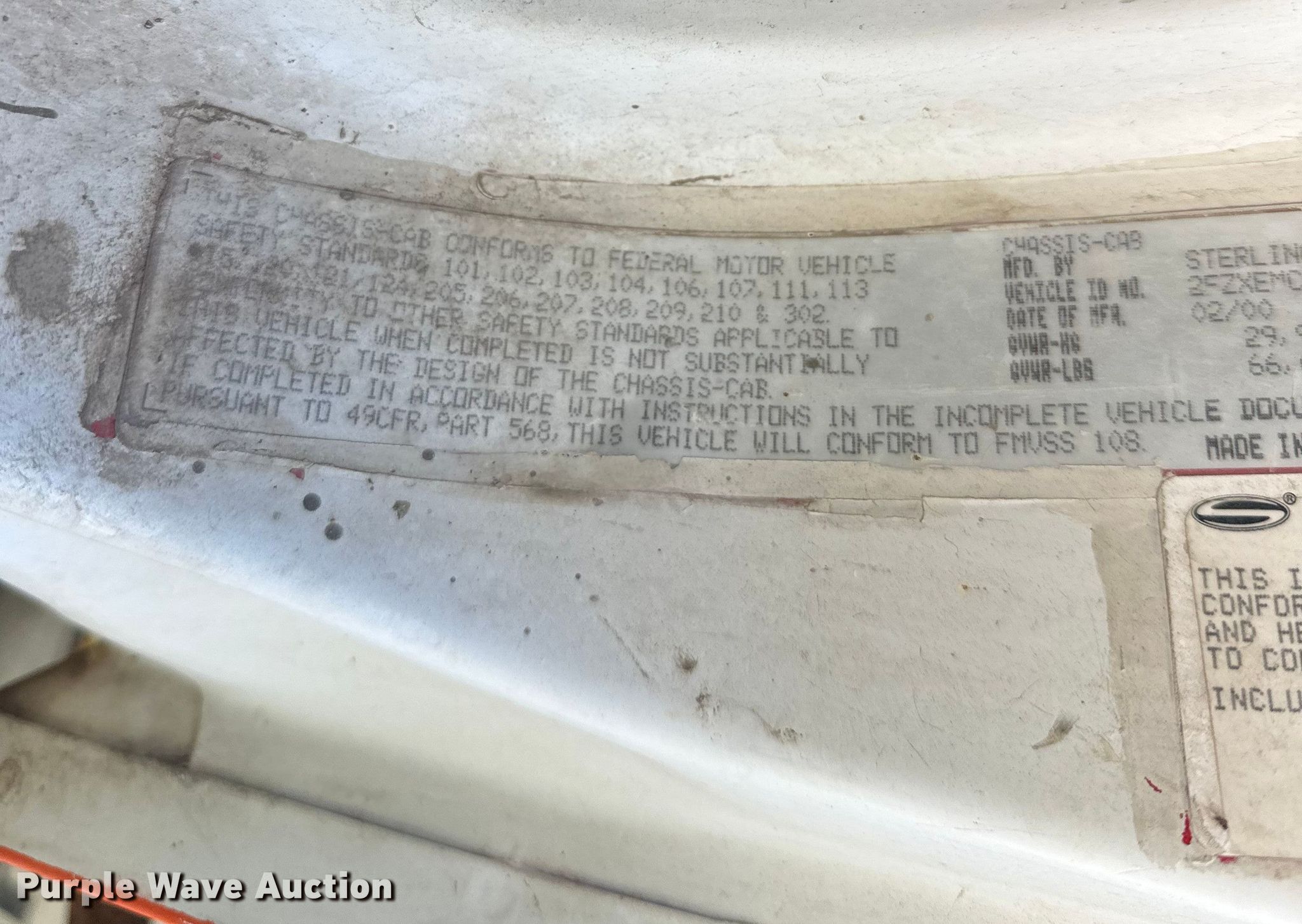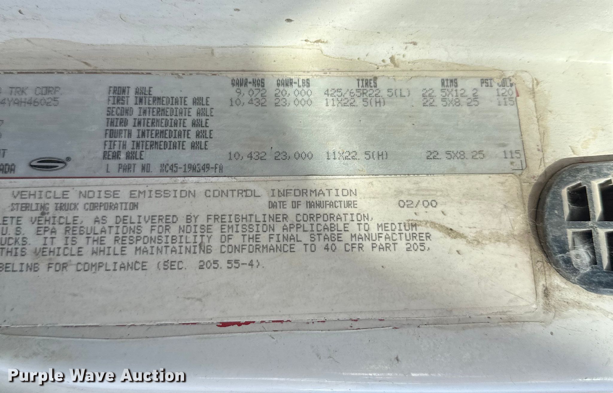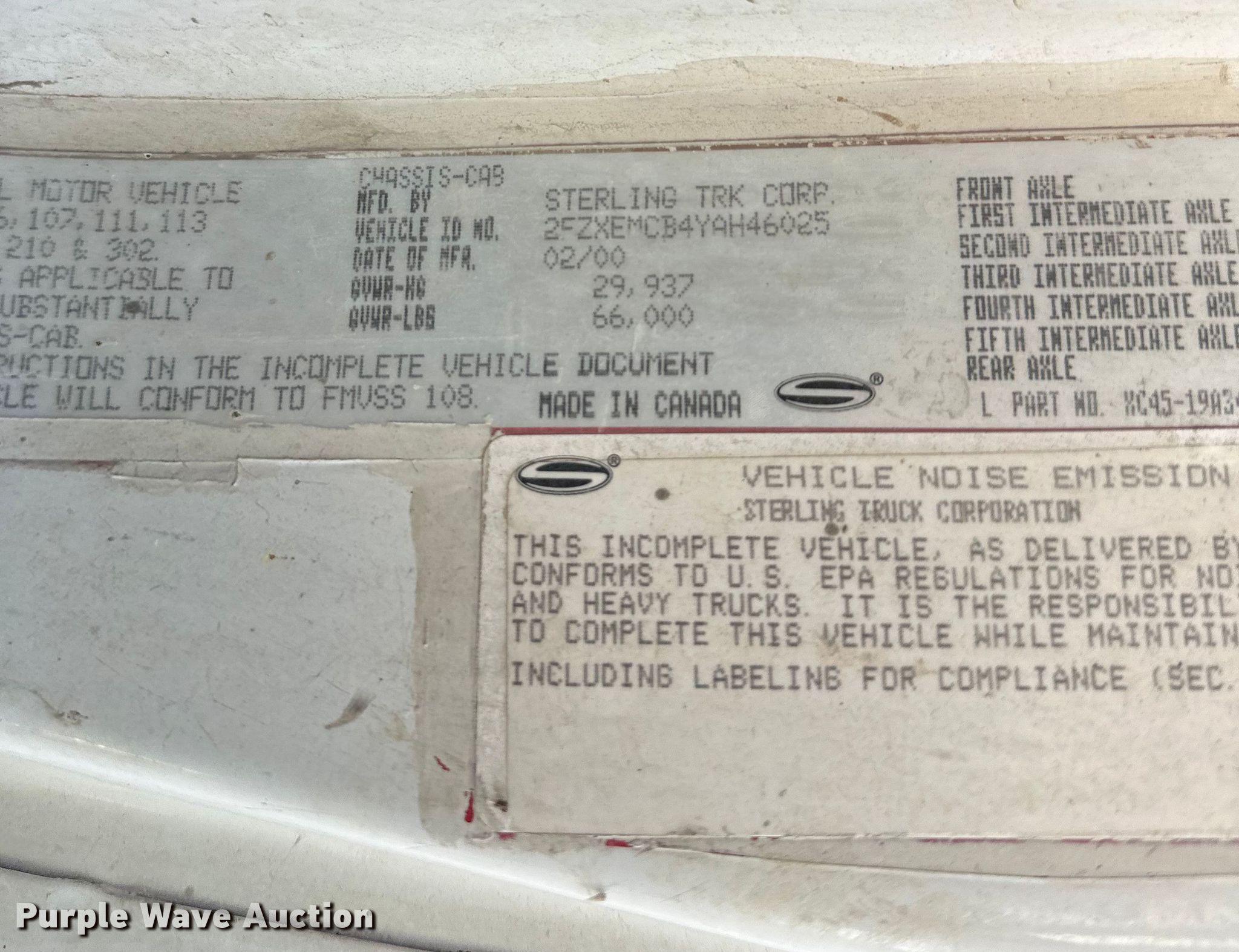 2000 Sterling L-Line ready mix truck. Miles: 301,108 on odometer, Hours: 20,620 on meter, VIN: 2FZXEMCB4YAH46025, Unit #: 21055. Engine Cummins ISM, Displacement: 10.8L, Cylinders: 6, Fuel type: Diesel. Transmission Automatic. Chassis Axles: 4, Pusher axle Steerable, Tag axle Steerable, Differential lock: Inter-axle, Suspension: Spring over walking beam, Brakes: Air, PTO, GVWR: 66,000 lbs FAWR: 20,000 lbs, RAWR: 23,000 lbs. Interior AC, Heat, Heated mirrors, Cruise control. Features Mixer McNelius, Serial: 56560, Capacity: 8.5 cu.yd., Discharge: Rear, In-cab controls, Rear drum controls, Water tank capacity: 150 gallons, Chute Extensions: 3, Chute type: Steel, Boom Theam, Approximately 37'. Tires Size: 425/65R22.5, Front: 425/65R22.5, Rear: 11R22.5. Notes Dash warning indicator: ABS, Brake, Windshield chipped or cracked, Dead battery, Jump start required during on-site data collection. Minnesota title. Title distribution may be delayed up to 14 days from verification of funds. Knife River. St. Cloud, MN 56304