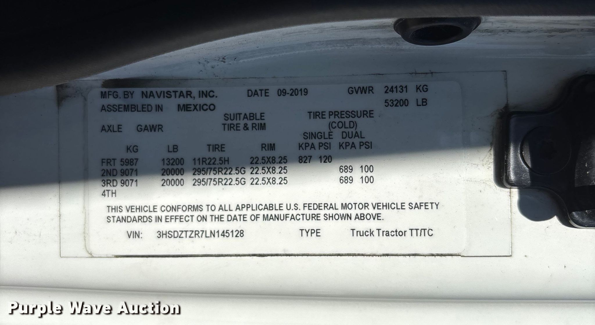 2020 International LT625 semi truck. Miles: 449,328 on odometer, Hours: 20,822 on meter, VIN: 3HSDZTZR7LN145128. Engine International A26, Displacement: 12.4L, Cylinders: 6, Fuel type: Diesel, Engine brake. Transmission Automated manual. Chassis Axles: Tandem, Differential lock: Inter-axle, Suspension: Air Dump valves, Brakes: Air, GVWR: 53,200 lbs FAWR: 13,200 lbs, IAWR: 20,000 lbs, RAWR: 20,000 lbs, Wheelbase: 228". Interior AC, Heat, Heated mirrors, Power windows, Power locks, Cruise control, Air ride cab, Sleeper Sleeper length: 68", Beds: Single, Rear climate control. Features Deck plate: Aluminum, Fifth wheel type: Air operated, Sliding, Fuel tank: Dual. Tires Front: 285/75R22.5, Rear: 275/80R22.5. Notes Mattress not included, Warranties valid until March 25, 2026 Platinum max coverage, Transmission and rear axle, Climate plus package, Towing and downtime. Pennsylvania title. Title distribution may be delayed up to 14 days from verification of funds. Oasis Logistics. York, SC 29745