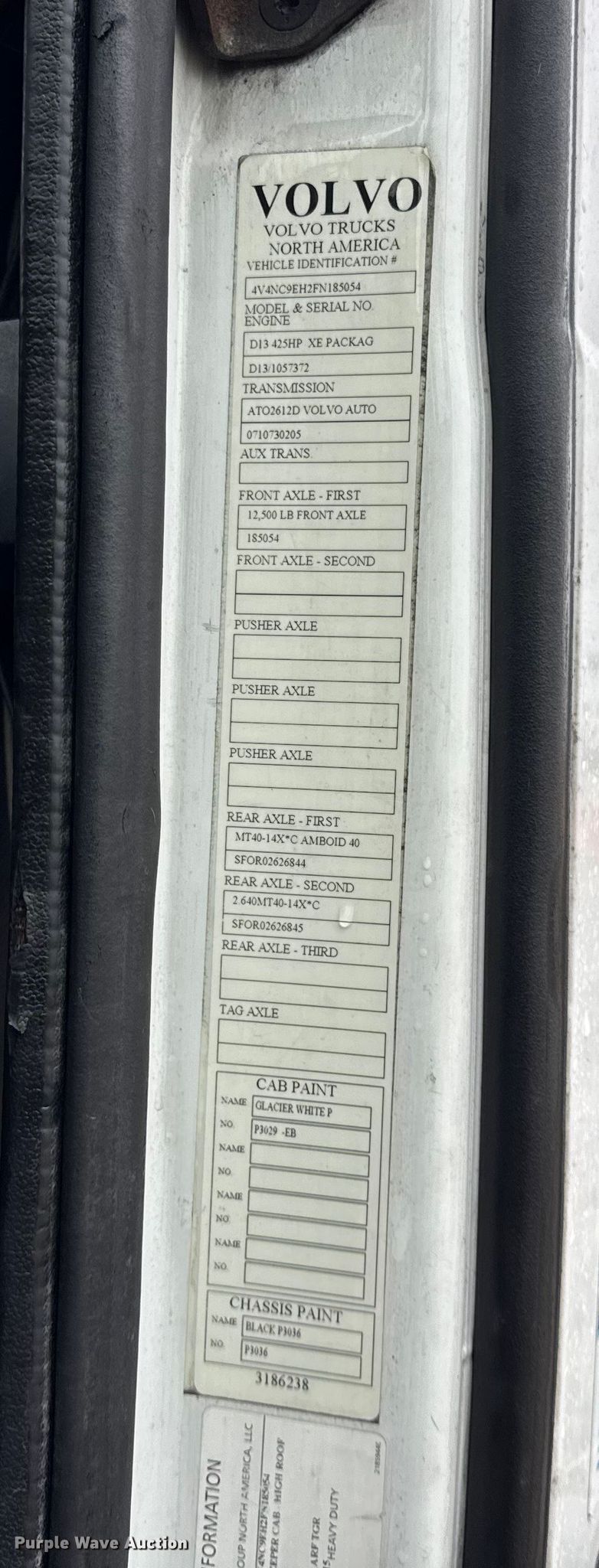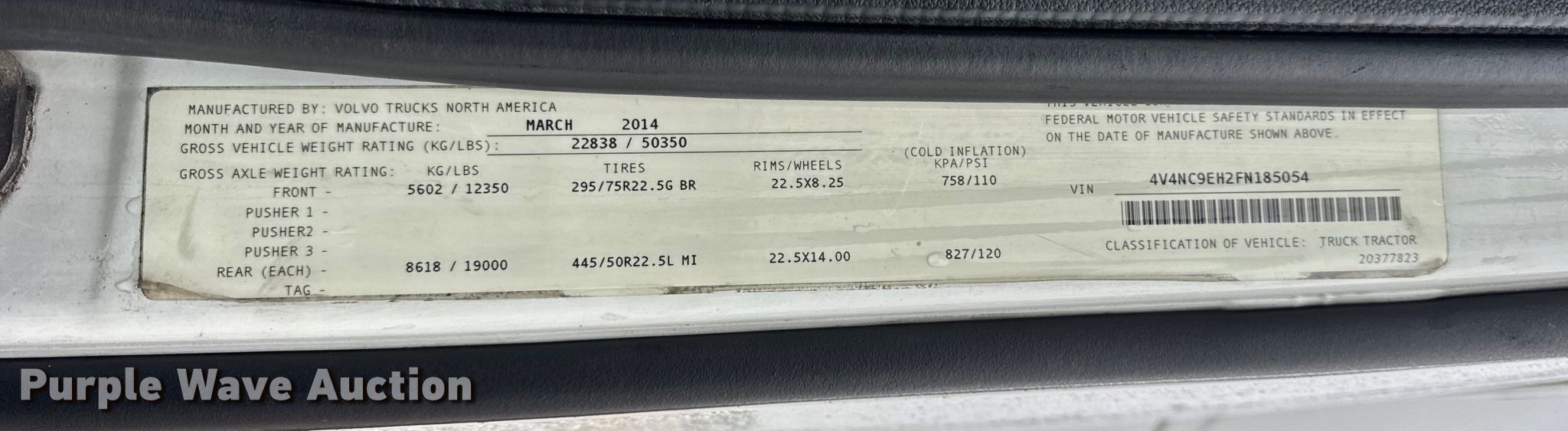 2015 Volvo VNL semi truck. Miles: 1,131,037 on odometer, Hours: 9,351 on meter, VIN: 4V4NC9EH2FN185054, Unit #: 2015. Engine Volvo D13, Displacement: 12.8L, Cylinders: 6, Fuel type: Diesel, HP: 425, Engine brake. Transmission Automated manual. Chassis Axles: Tandem, Differential lock: Inter-axle, Suspension: Air Dump valves, Brakes: Air, GVWR: 50,350 lbs FAWR: 12,350 lbs, IAWR: 19,000 lbs, RAWR: 19,000 lbs. Interior AC, Heat, Heated mirrors, Cruise control, Air ride cab, Sleeper Sleeper length: 60", Beds: Double bunk, Refrigerator. Features Deck plate: Aluminum, Fifth wheel type: Air operated, Sliding, Fuel tank: Dual. Tires Size: 295/75R22.5. Notes Dash warning indicator: Check engine, Possible engine issues, smokes. Illinois title. Title distribution may be delayed up to 14 days from verification of funds. White City Logistics. East Dundee, IL 60118