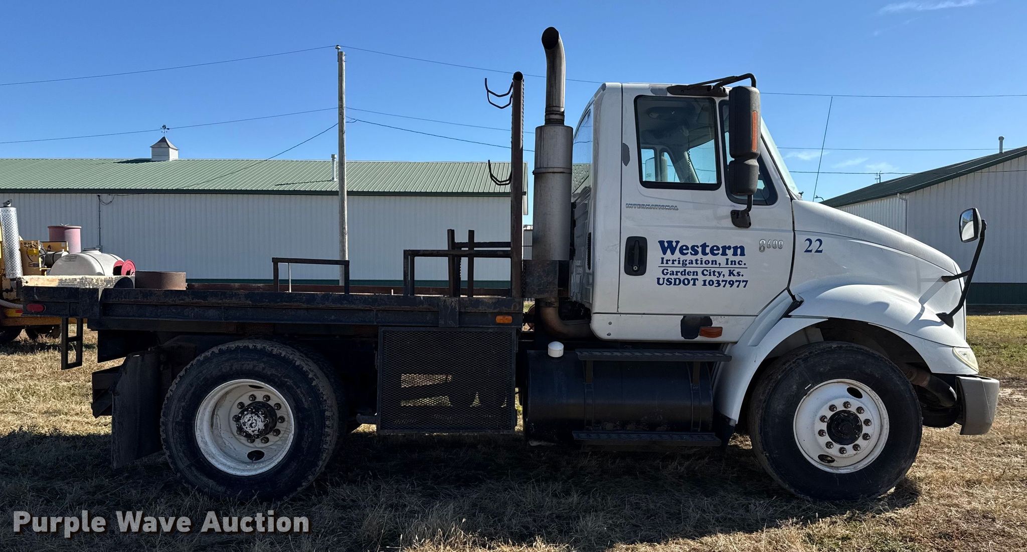 2005 International 8600 flatbed truck. Miles: 517,462 on odometer, VIN: 1HSHWAHN65J163834. Engine Cummins, Displacement: 10.8L, Cylinders: 6, Fuel type: Diesel. Transmission Eaton Fuller, Manual, Speed: 10. Chassis Axles: Single, Suspension: Air, Brakes: Air, GVWR: 32,000 lbs, Wheelbase: 146". Interior AC, Heat, Heated mirrors, Power windows, Power locks, Cruise control. Features Bed Flatbed, Length: 10', Width: 96". Tires Size: 11R22.5. Kansas title. Title distribution may be delayed up to 14 days from verification of funds. Western Irrigation. Garden City, KS 67846