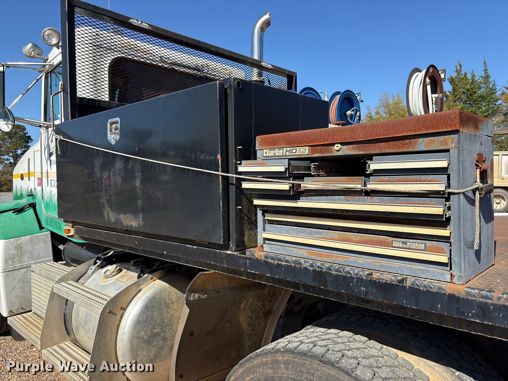 2002 Peterbilt 385 flatbed truck. Miles: 408,618 on odometer, Miles or hours may vary, unit still in use, VIN: 1XPGD09X12D585913, Unit #: 13. Engine Cummins ISM, Displacement: 10.8L, Cylinders: 6, Fuel type: Diesel, HP: 280, Engine brake. Transmission Eaton Fuller, Manual, Speed: 10. Chassis Axles: Tandem, Suspension: Spring, Brakes: Air, GVWR: 50,000 lbs. Interior AC, Heat, Heated mirrors. Features Bed Flatbed, Utility bed, UTB, Serial: 19901, Length: 14', Width: 8', Toolboxes, (2) auxiliary fuel tanks. Tires Size: 295/75R22.5, Size: 11R22.5. Notes Dash warning indicator: ABS, Windshield chipped or cracked. Arkansas title. Title distribution may be delayed up to 14 days from verification of funds. Williamson Rock Hauling. Horatio, AR 71842