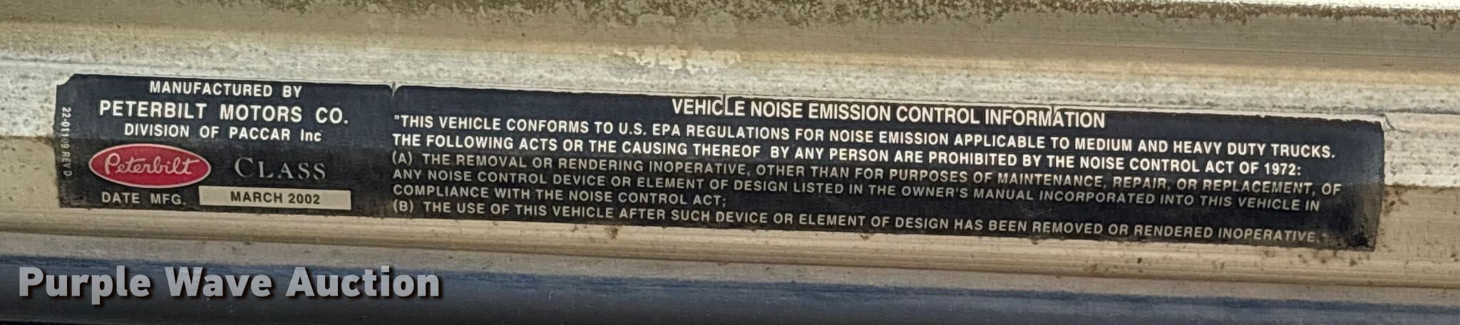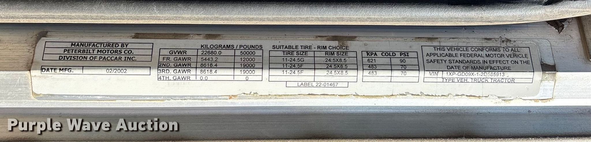 Purple Wave is selling a used Flat Bed Truck in Arkansas. This item is a 2002 Peterbilt 385 flatbed truck with the following: Miles: 408,618 on odometer, Miles or hours may vary, unit still in use, VIN: 1XPGD09X12D585913, Unit #: 13