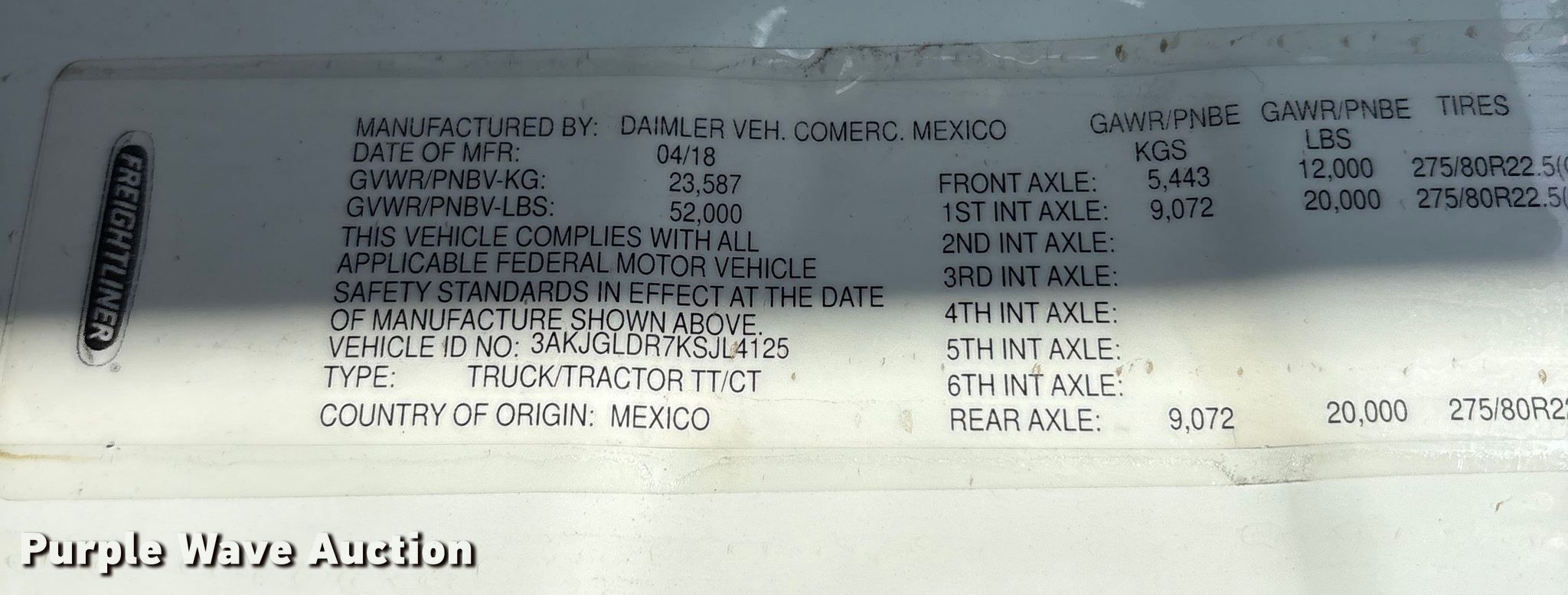 Take a look at this used 2019 Freightliner Cascadia semi truck being sold on December 11th, 2025 in the Thursday December 11 Truck and Trailer Auction made by Freightliner. Take a look at all of the item information below or take a look at similar auctions for Trucks.