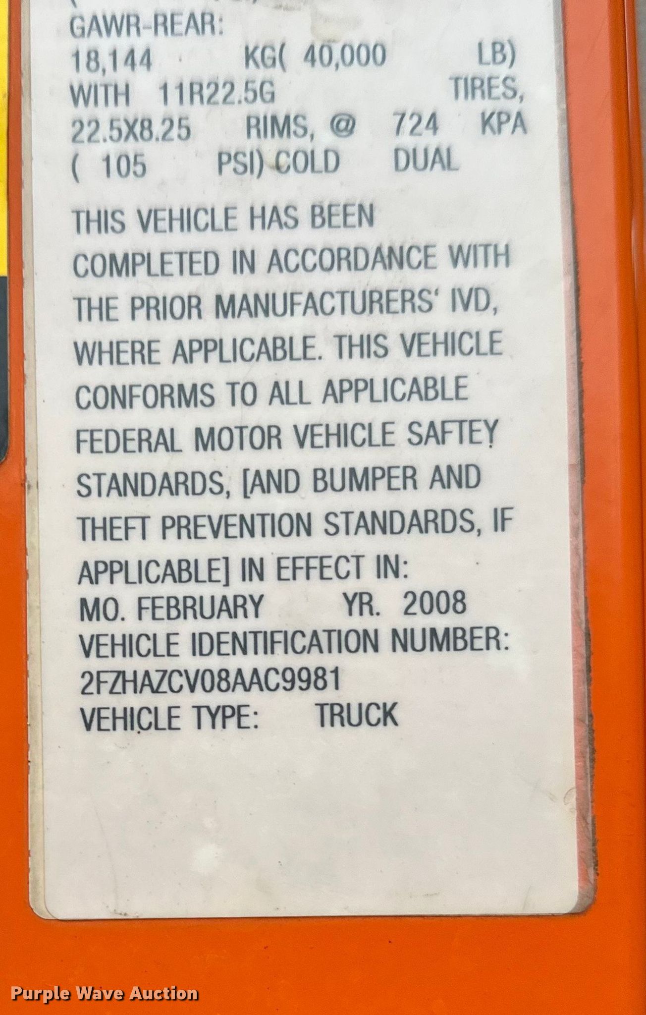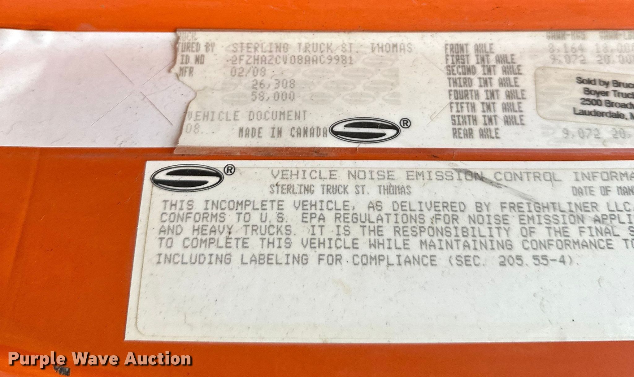 2008 Sterling LT9500 Series dump truck. Miles: 189,343 on odometer, VIN: 2FZHAZCV08AAC9981. Engine Mercedes-Benz MBE4000, Displacement: 12.8L, Cylinders: 6, Fuel type: Diesel, Engine brake. Transmission Eaton Fuller, Manual, Speed: 13. Chassis Axles: Tandem, Differential lock: Full, Suspension: Spring over walking beam, Brakes: Air, PTO, GVWR: 58,000 lbs FAWR: 18,000 lbs, RAWR: 20,000 lbs. Interior AC, Heat, Heated mirrors, Power windows, Cruise control, Brake controller. Features Bed Dump bed, J Craft, Length: 13', Width: 8', Side height: 46", Bed type: Steel, Ram: Single, Spreader Falls, Plow Falls, Width: 144", Wing plow Falls, Width: 132", Mid-mount plow Falls, Width: 144". Tires Front: 315/80R22.5, Rear: 11R22.5. Minnesota title. Seller is a government entity who will be assigning and distributing the title. Please contact the seller for distribution questions. Title distribution may be delayed up to 14 days from verification of funds. Beltrami County. Bemidji, MN 56601
