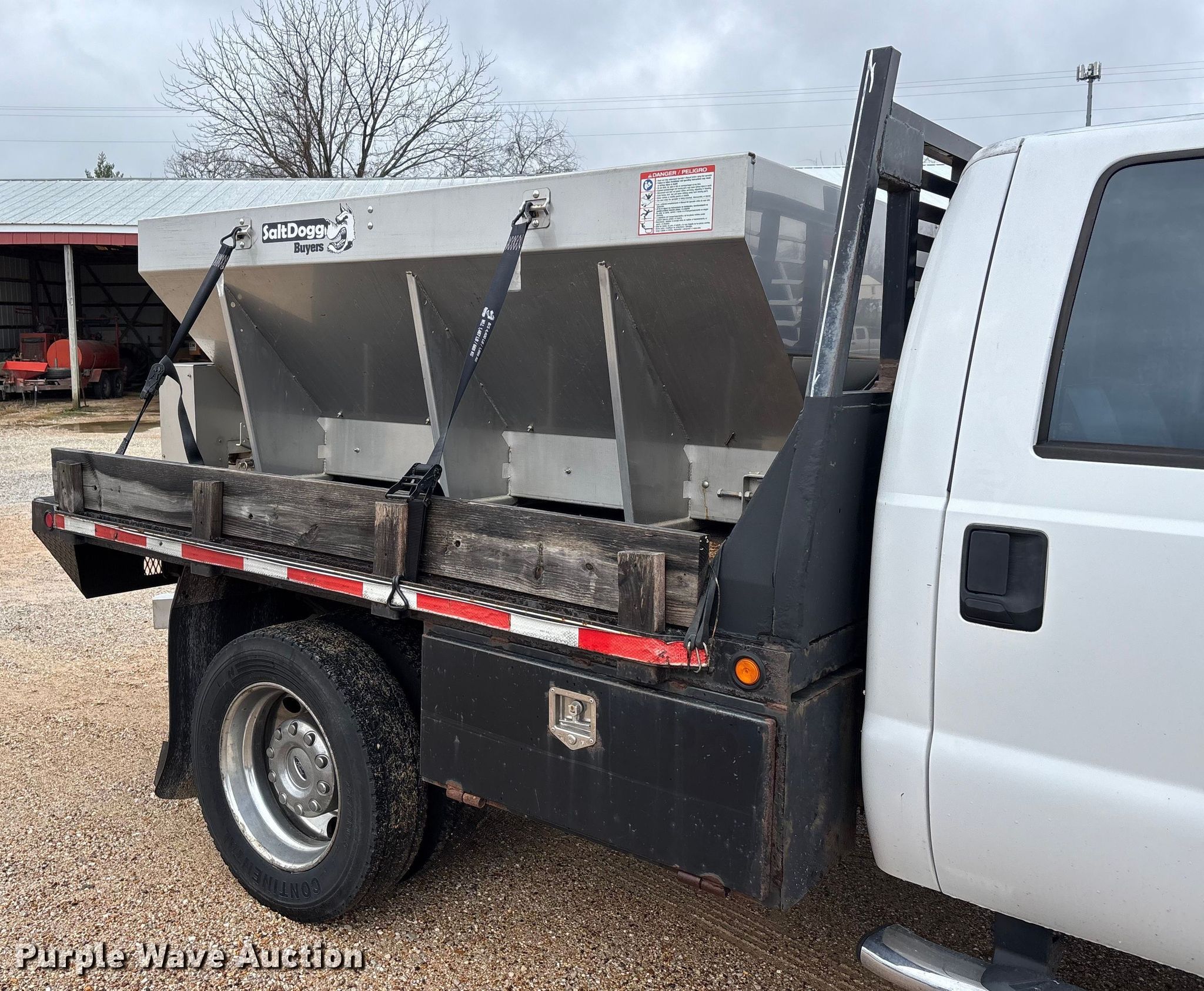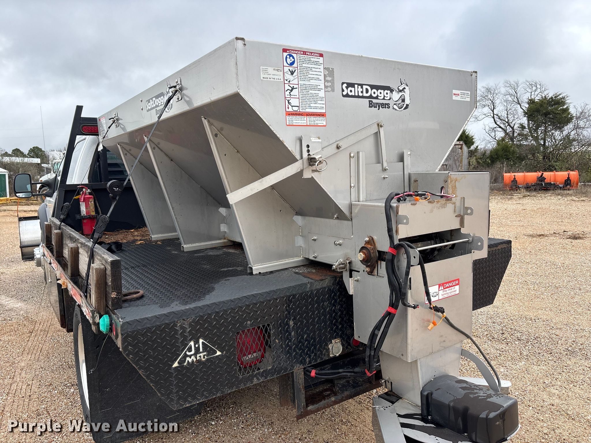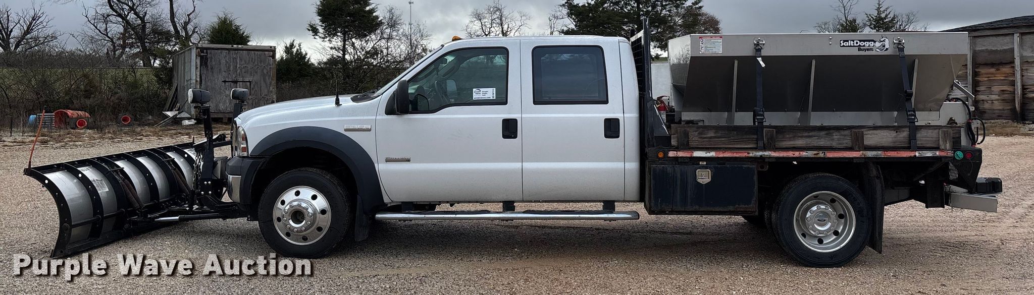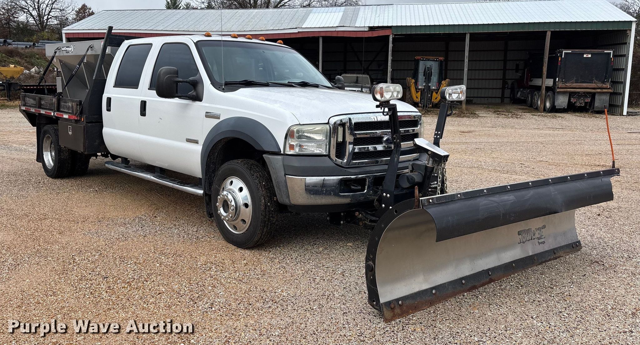 2006 Ford F450 Super Duty flatbed truck. Miles: 235,015 on odometer, VIN: 1FDXW47P56EA36149. Engine Displacement: 6.0L, Cylinders: 8, Fuel type: Diesel. Transmission Automatic. Chassis Four wheel drive, Axles: Single, Suspension: Spring, Brakes: Hydraulic, GVWR: 16,000 lbs, Wheelbase: 176". Interior AC, Heat, Cruise control, Auxiliary controls, Brake controller. Features Bed Flatbed, Length: 9', Width: 8', Snow plow SnowDogg EX85, Serial: M063002201, Spreader SaltDogg, Serial: 0009845. Tires Size: 225/70R19.5. Notes Dash warning indicator: ABS, Windshield chipped or cracked. Missouri title. Title distribution may be delayed up to 14 days from verification of funds. Dent Co. Road Dept.. Salem, MO 65560