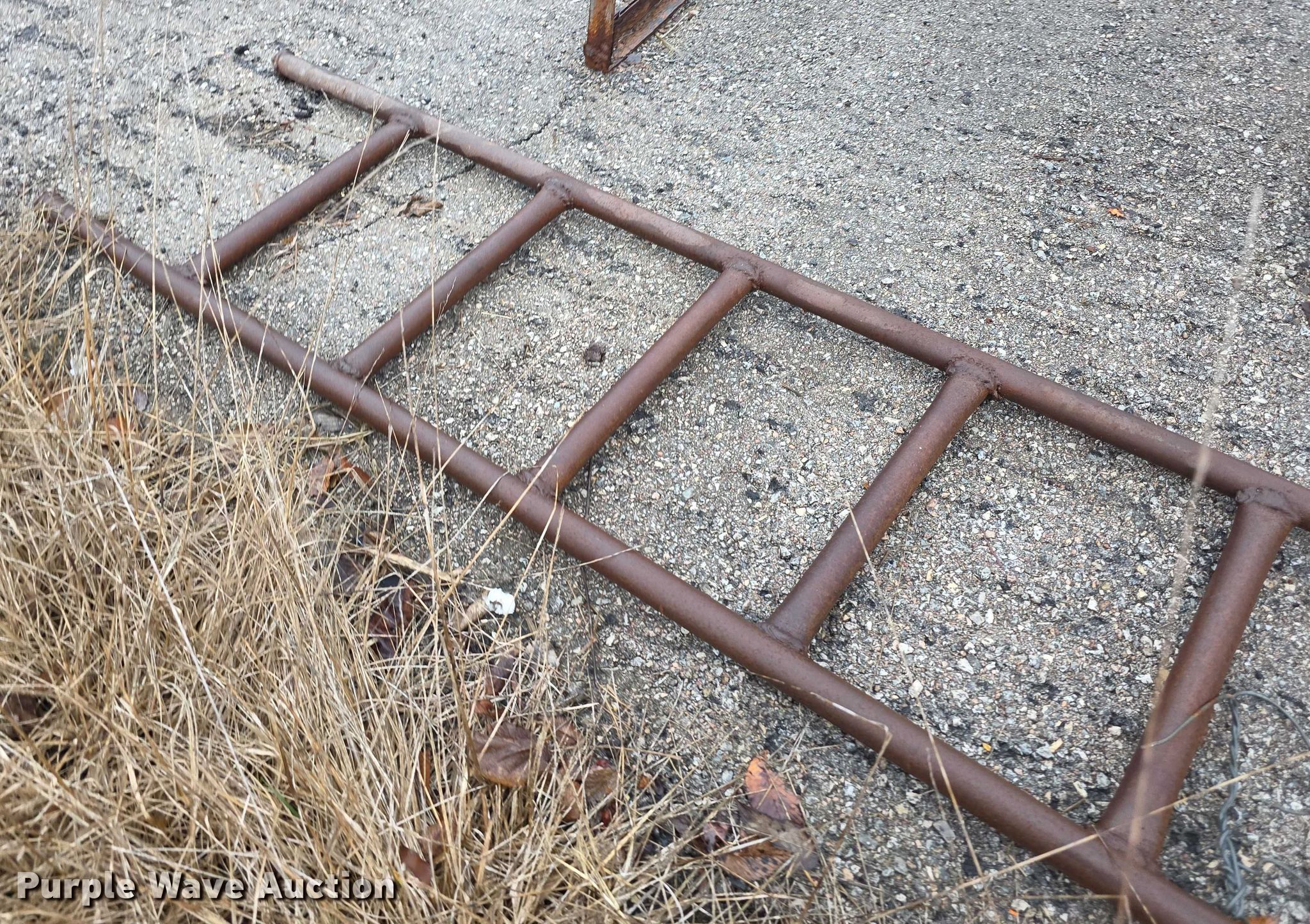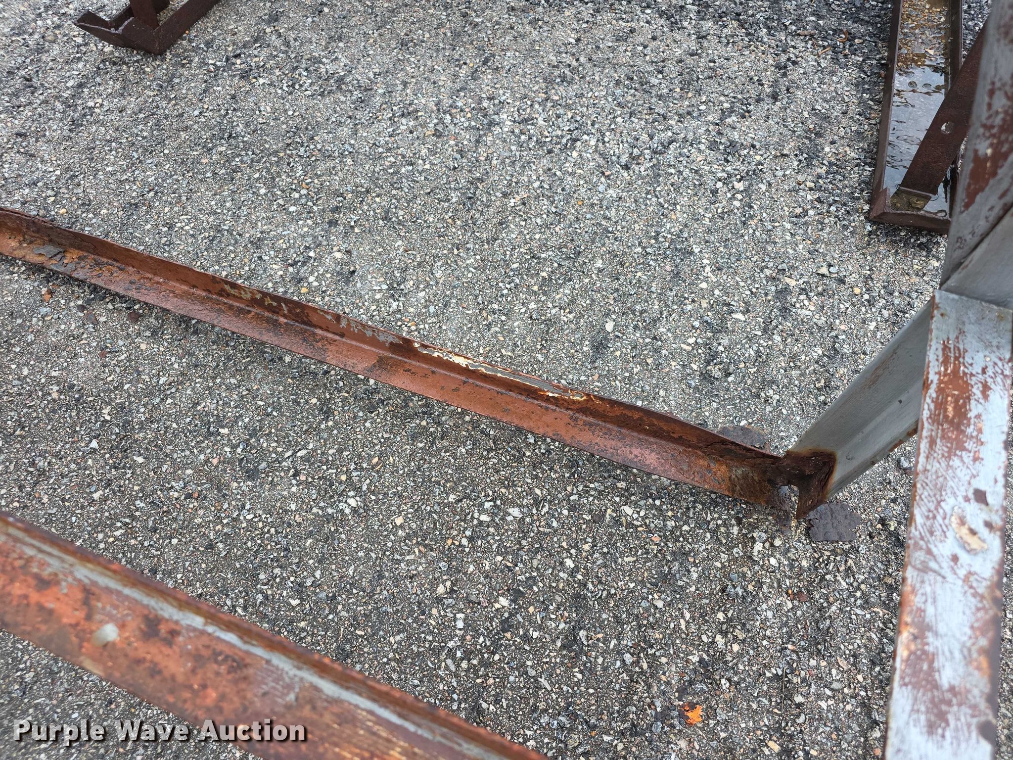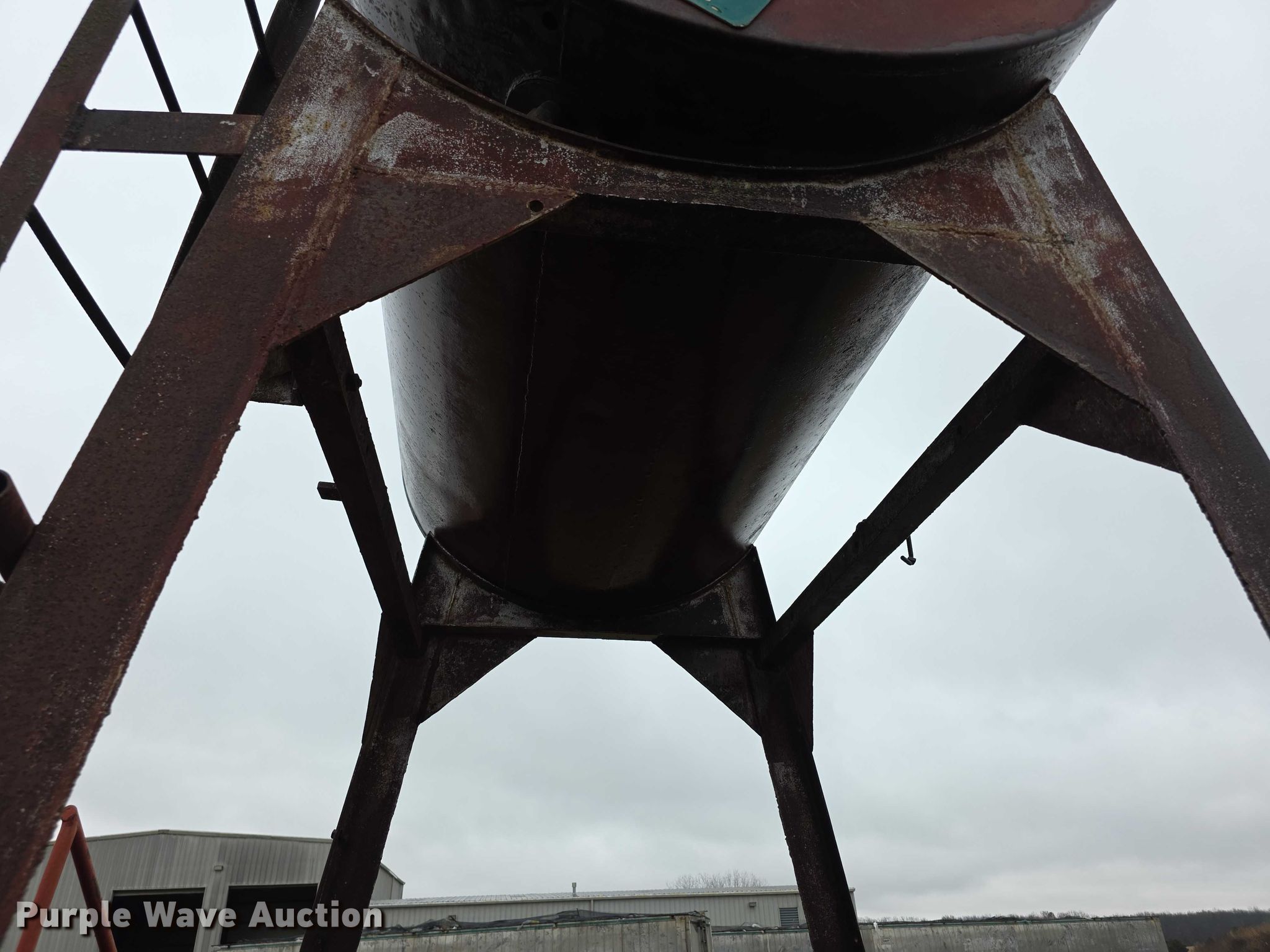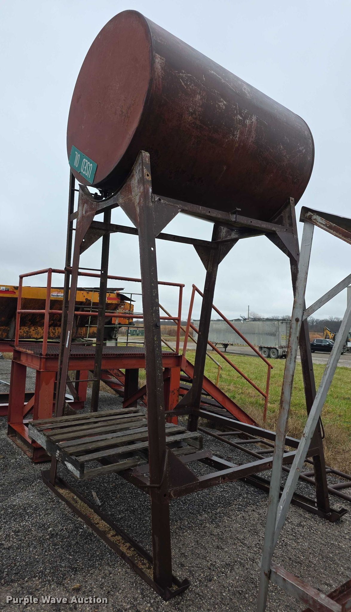 Purple Wave is selling a used Fuel and Lube in Kansas. This item is a Used oil tank with the following: Capacity: 500 gallons, Dimensions: 7' x 7' x 9', Stand, Dimensions: 5' x 50" x 7', Base rusted, Ladder