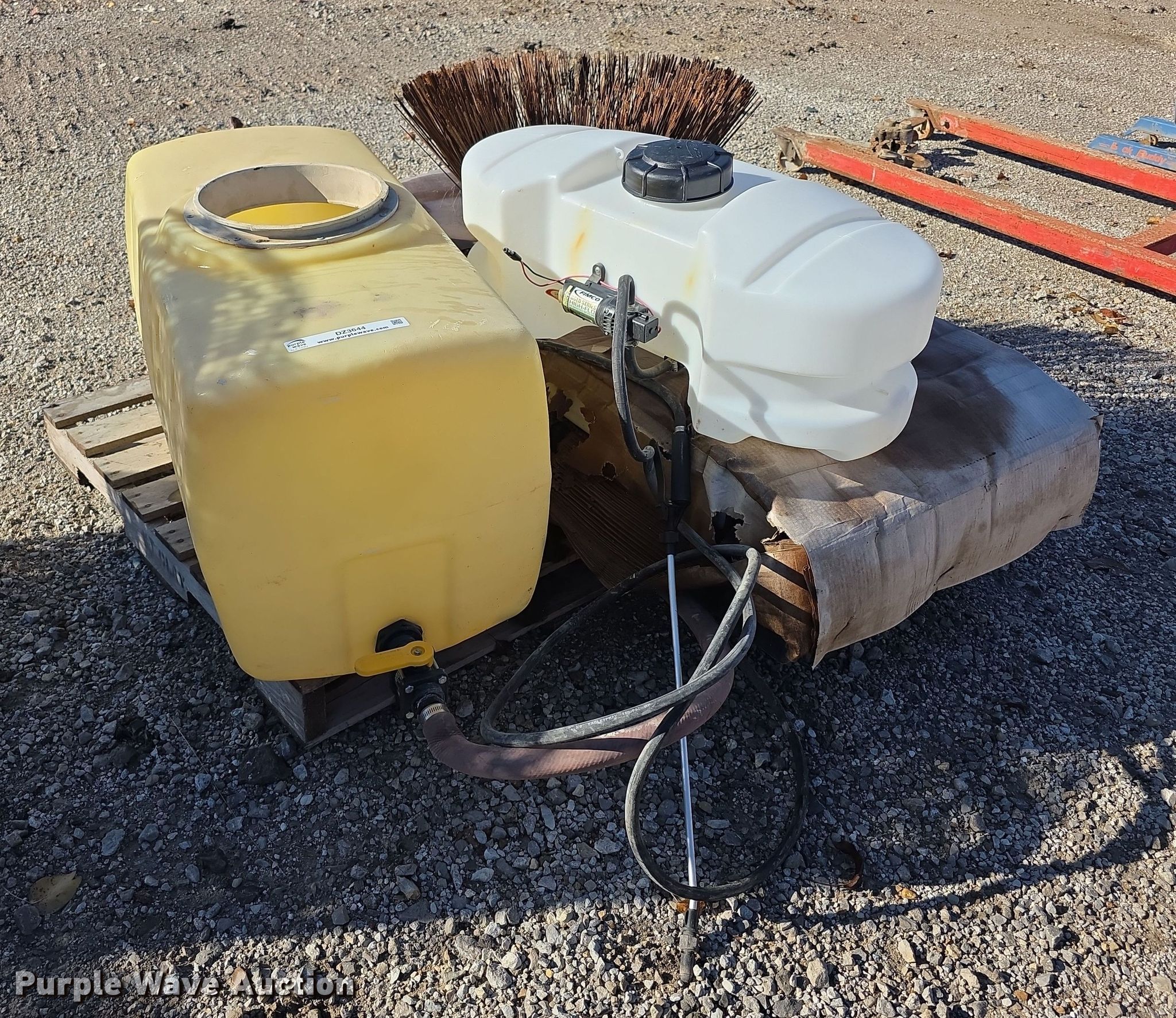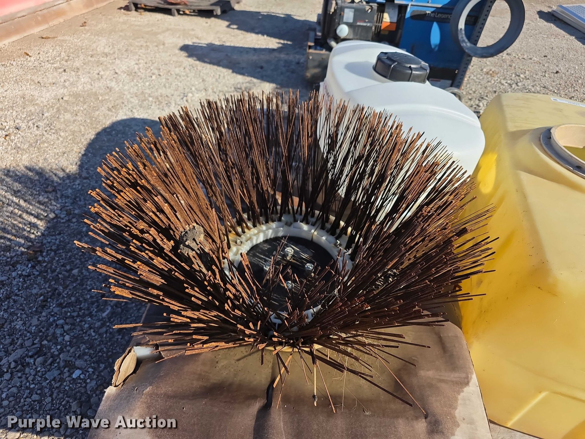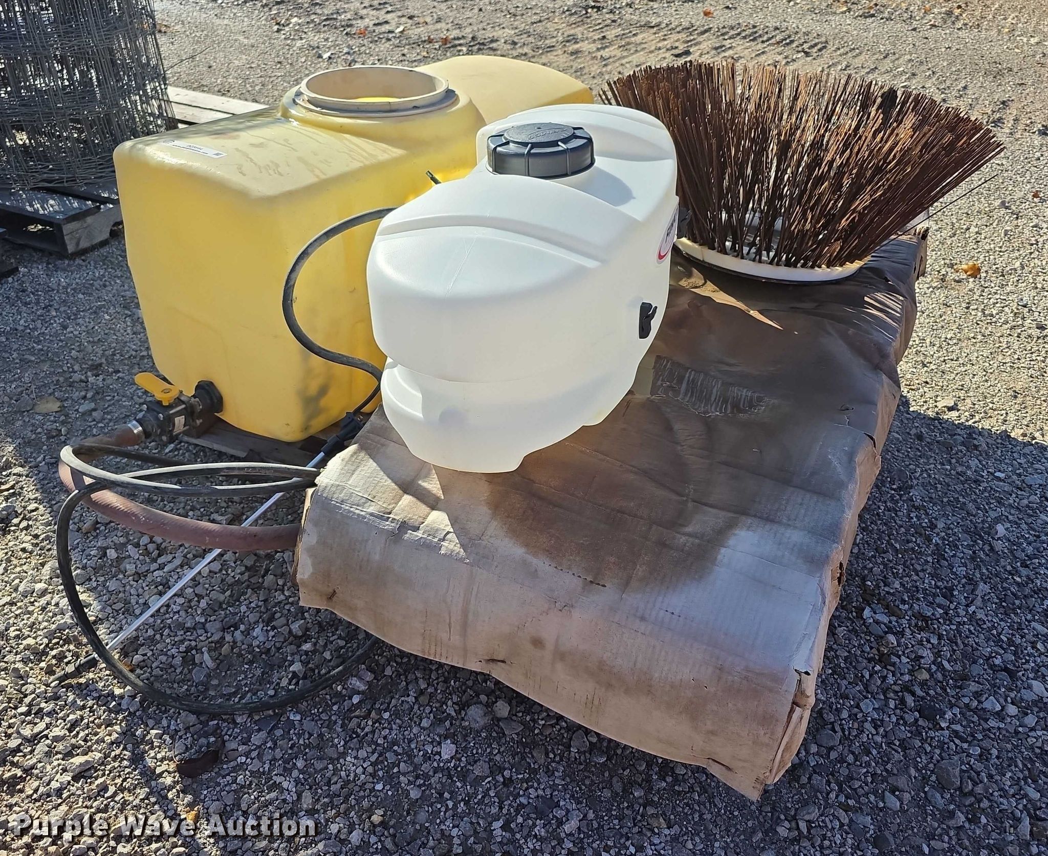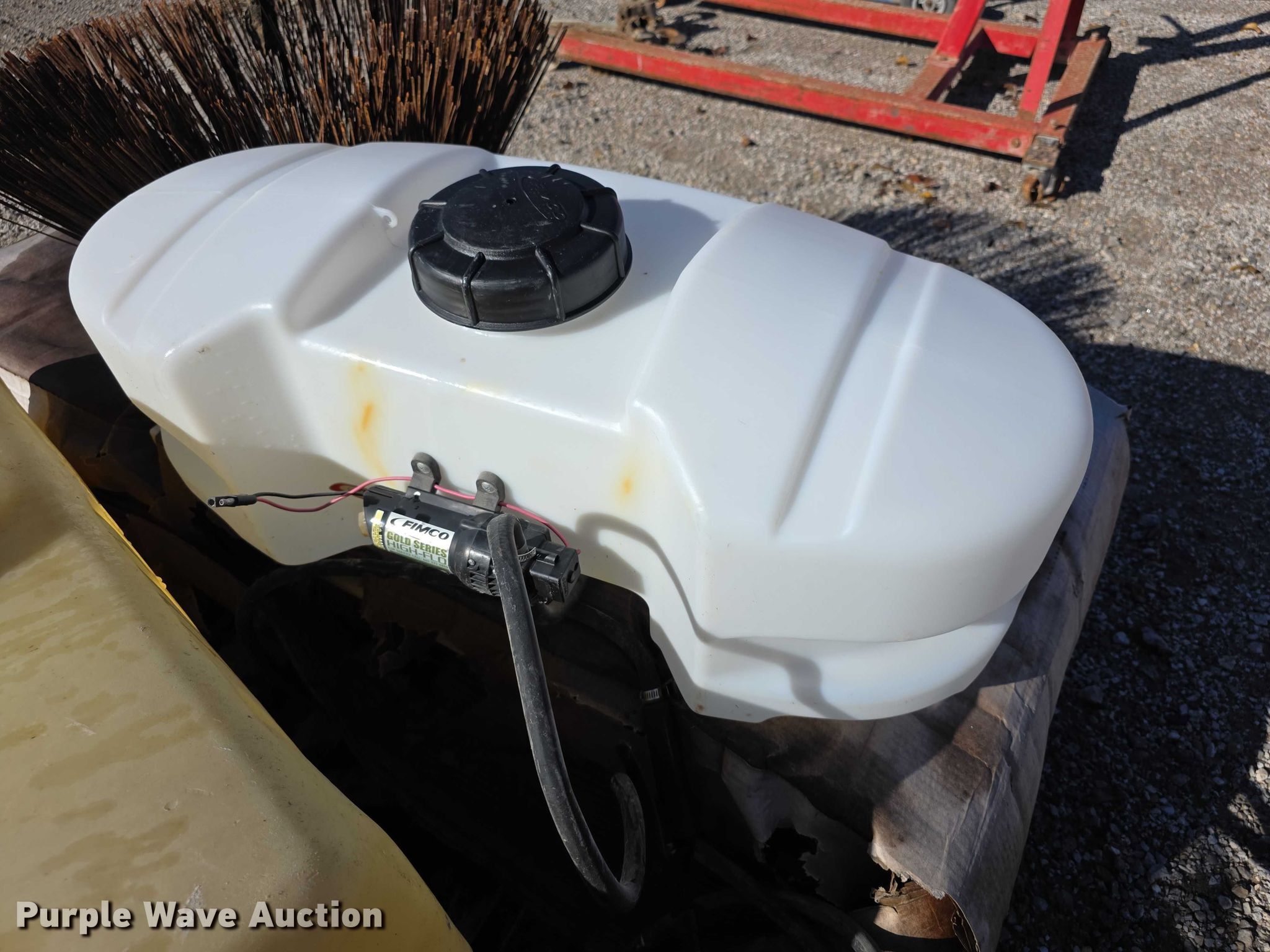 Purple Wave is selling a used Tools in Kansas. This item is a Tools with the following: Poly tank, Capacity: 50 gallons, Lid missing, Fimco sprayer tank, Hose, Spray wand, Width: 28", Sweeper gutter broom, Safety-Kleen containment tank