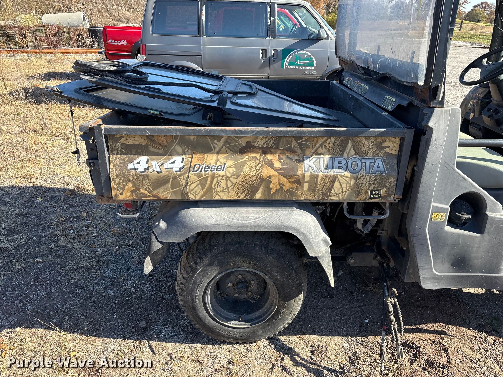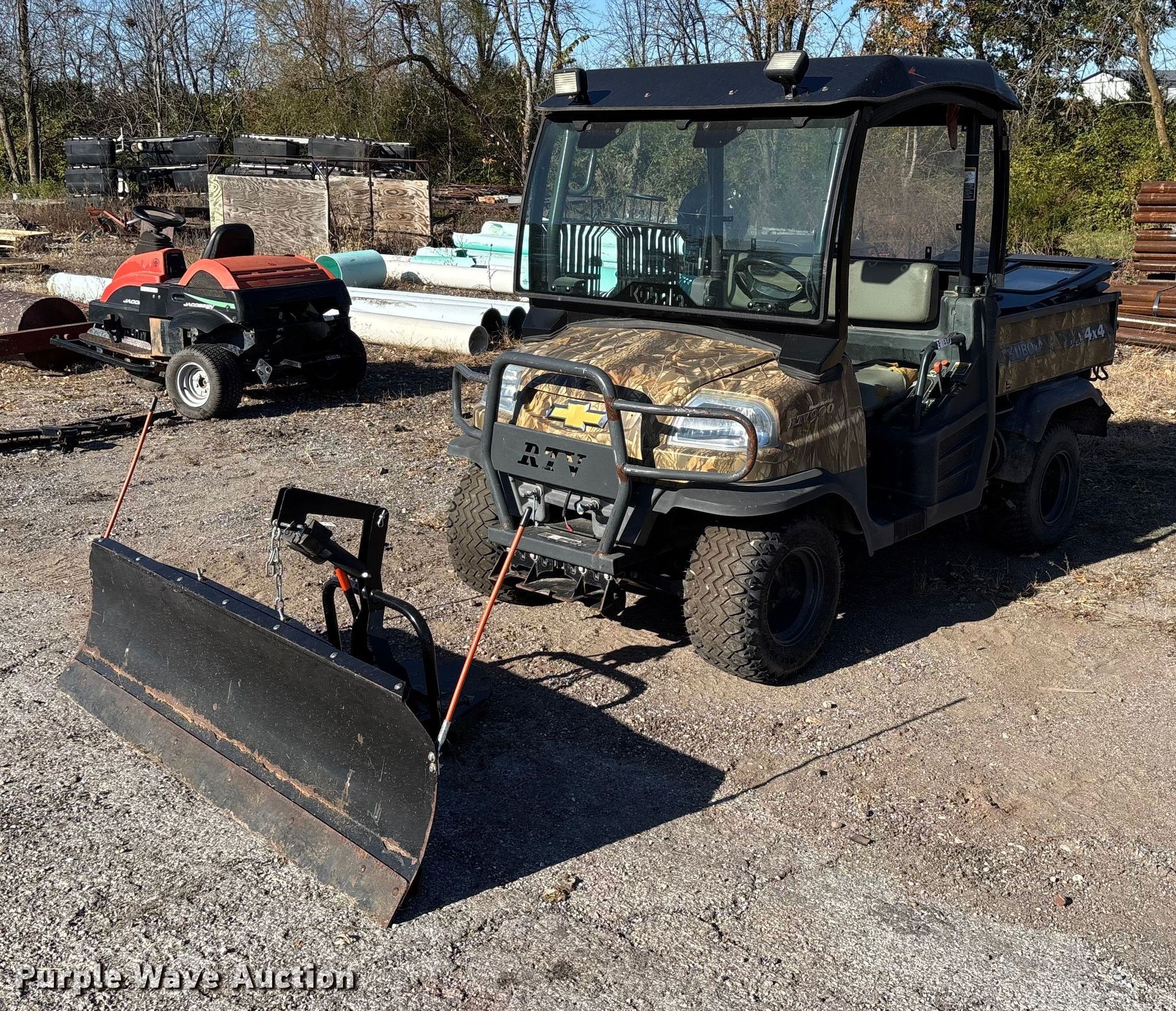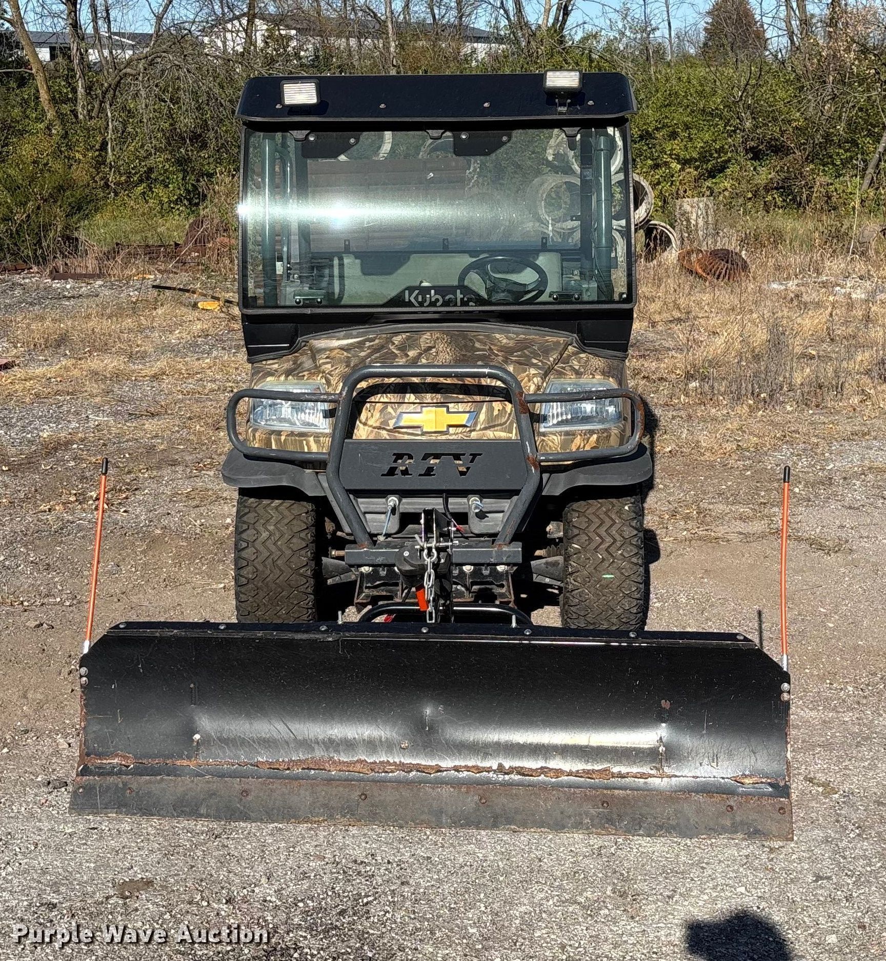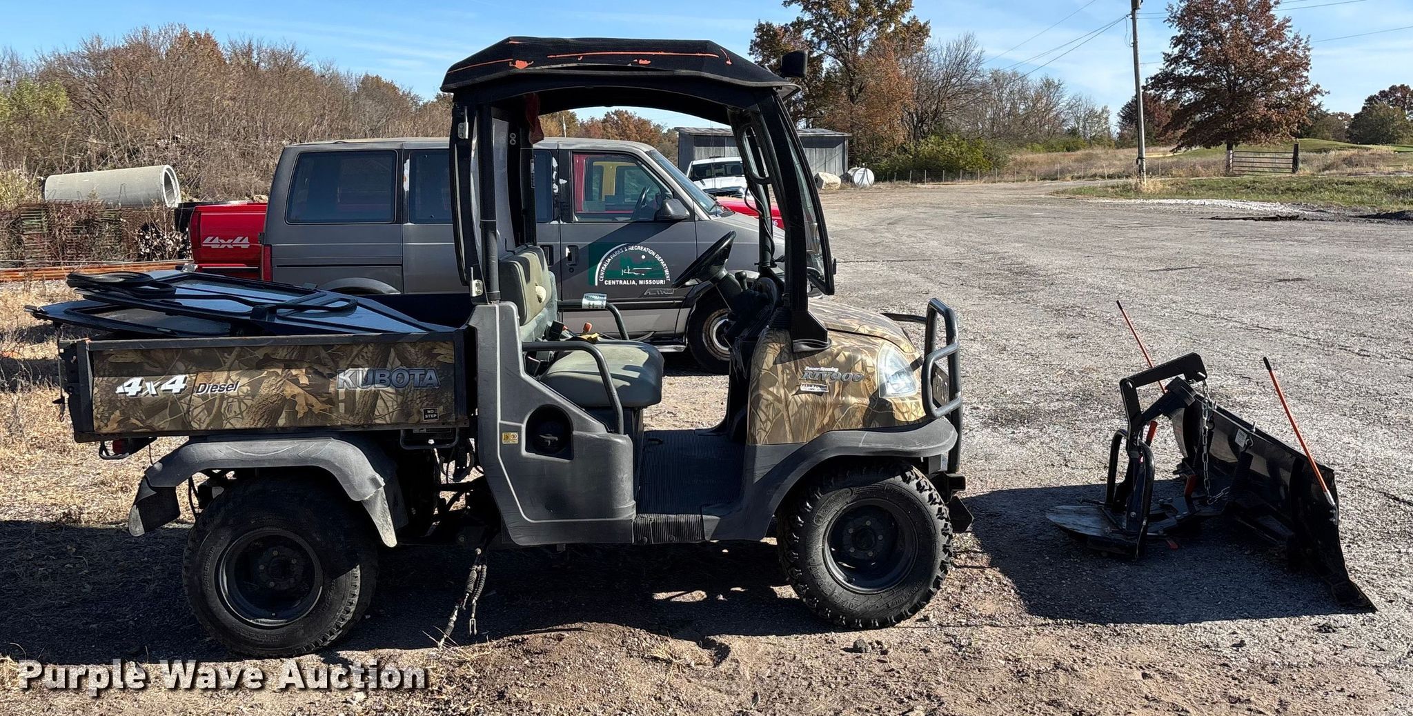 2007 Kubota RTV900 utility vehicle. Hours: 2,423 on meter, VIN: KRTV900A61070817, Serial: 70817. Transmission Automatic. Chassis Four wheel drive/ All wheel drive. Operators station OROPS, Canopy. Features Grille guard, Dump bed 49" L x 54" W, Dump bed type: Electric/ Hydraulic, Attachment Kubota, Description: Snow plow, Width: 72", Serial: 227073. Tires Size: 25x10.00-12NHS. Notes Battery missing, Parts may be missing, No engine, Non-operational unit. Transfer of ownership documentation will be a bill of sale. City of Centralia, MO. Centralia, MO 65240
