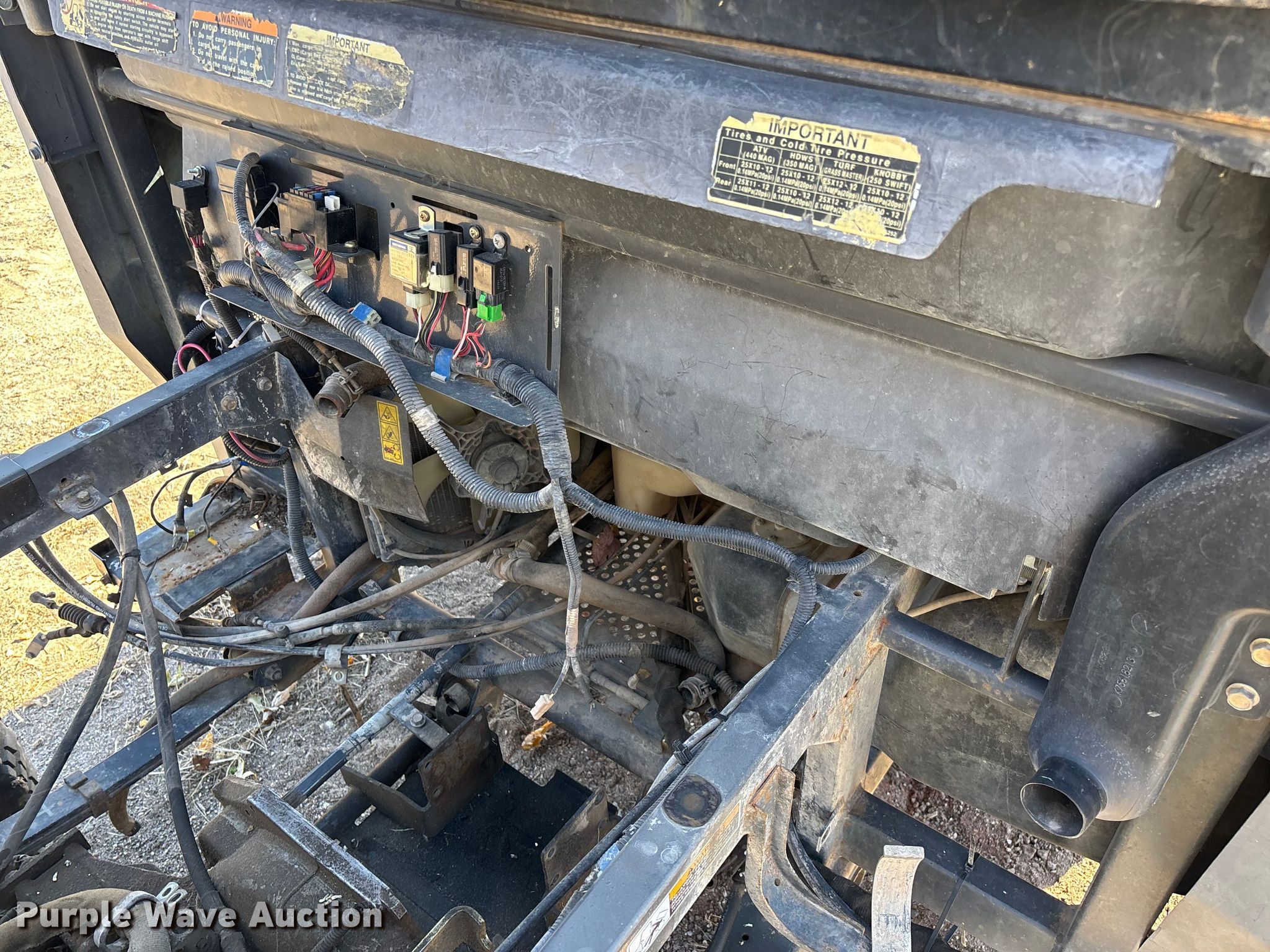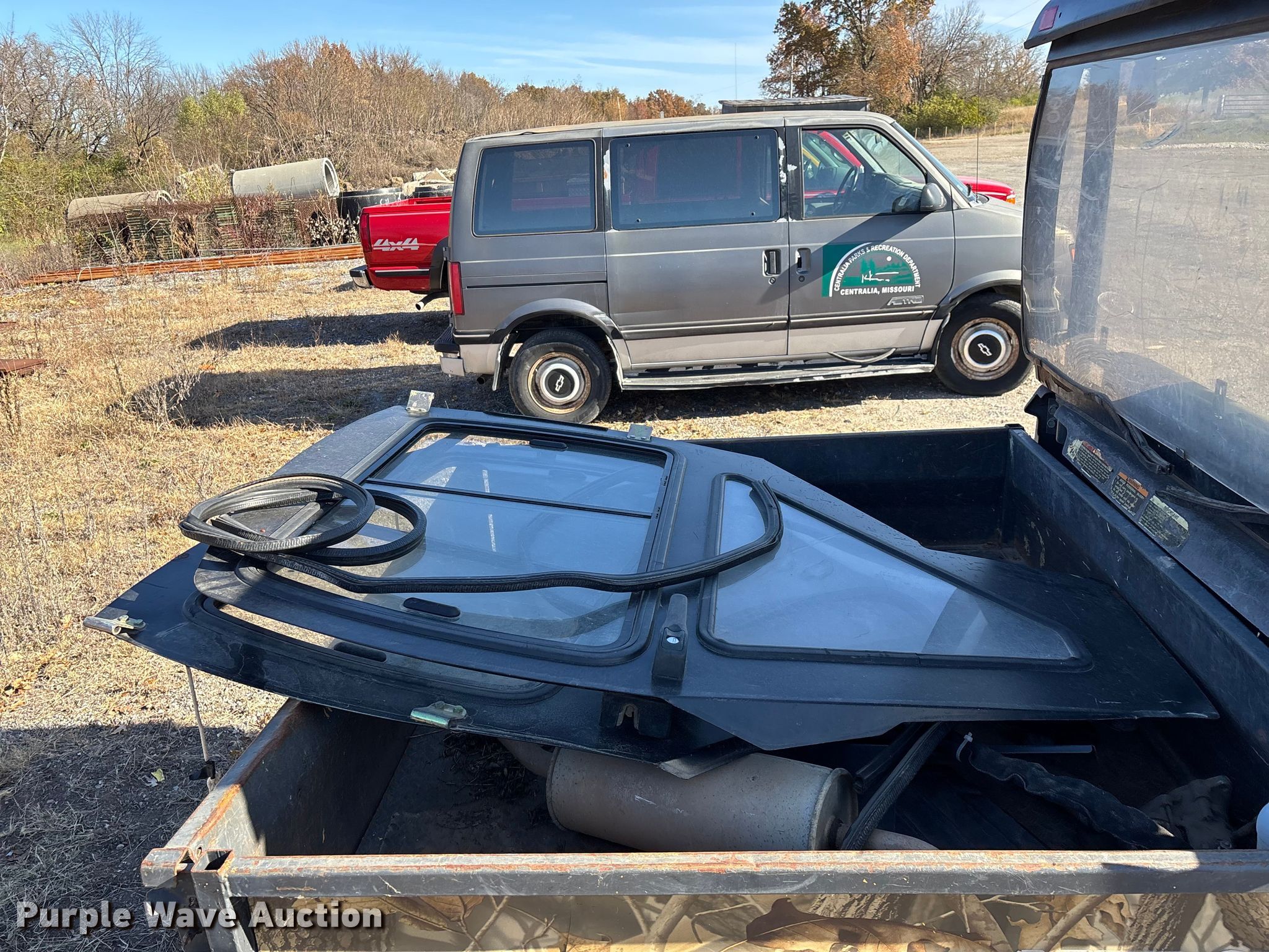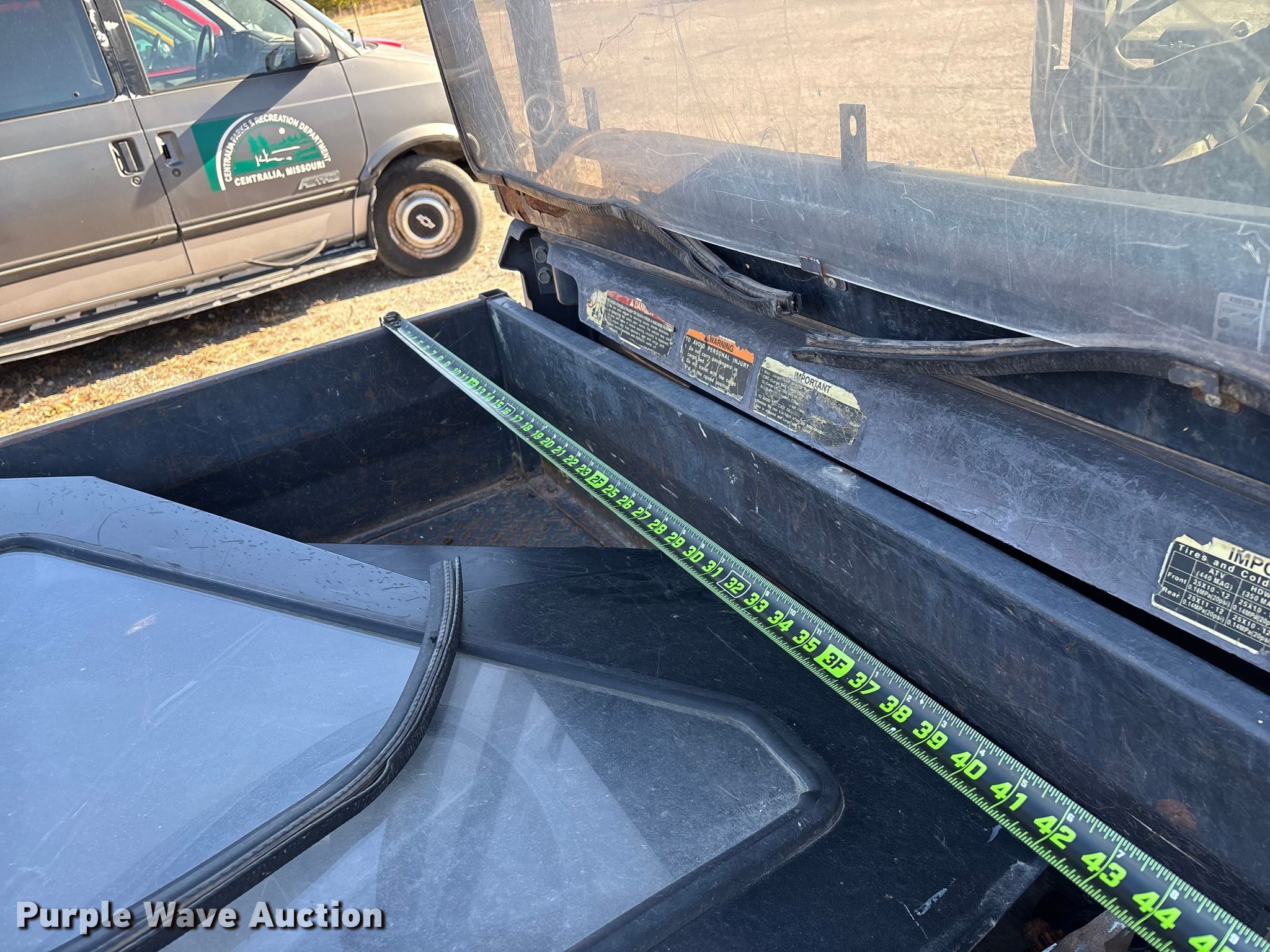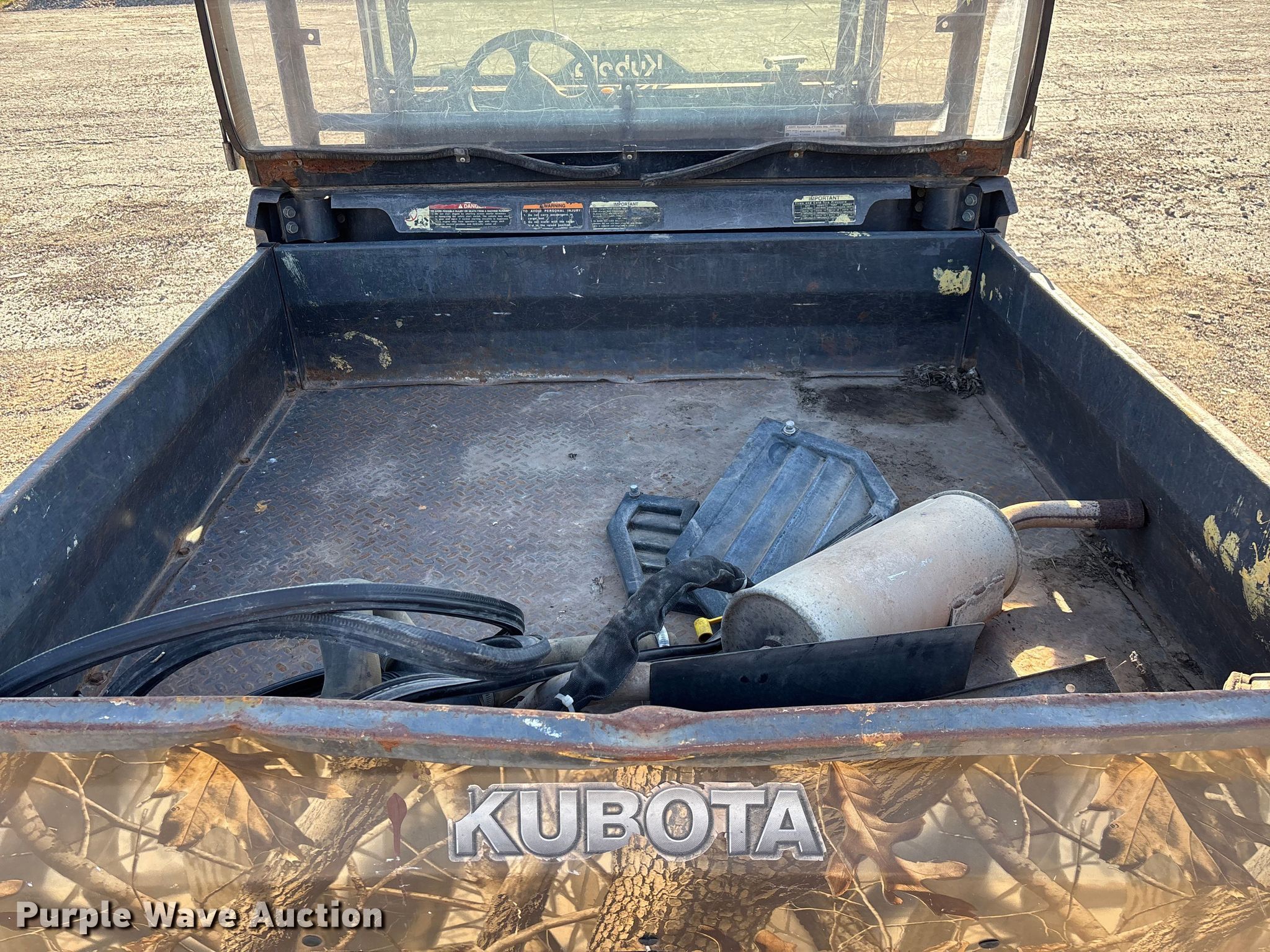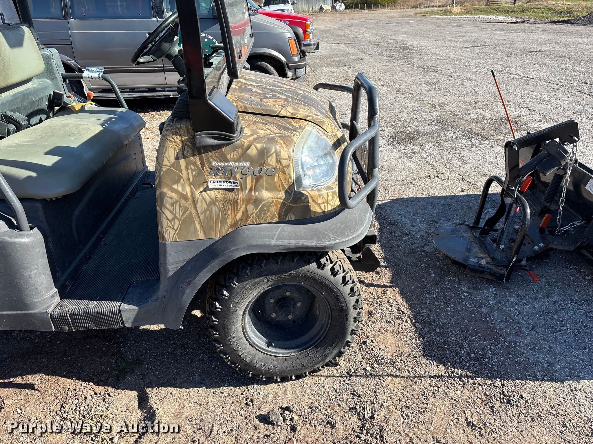 2007 Kubota RTV900 utility vehicle. Hours: 2,423 on meter, VIN: KRTV900A61070817, Serial: 70817. Transmission Automatic. Chassis Four wheel drive/ All wheel drive. Operators station OROPS, Canopy. Features Grille guard, Dump bed 49" L x 54" W, Dump bed type: Electric/ Hydraulic, Attachment Kubota, Description: Snow plow, Width: 72", Serial: 227073. Tires Size: 25x10.00-12NHS. Notes Battery missing, Parts may be missing, No engine, Non-operational unit. Transfer of ownership documentation will be a bill of sale. City of Centralia, MO. Centralia, MO 65240