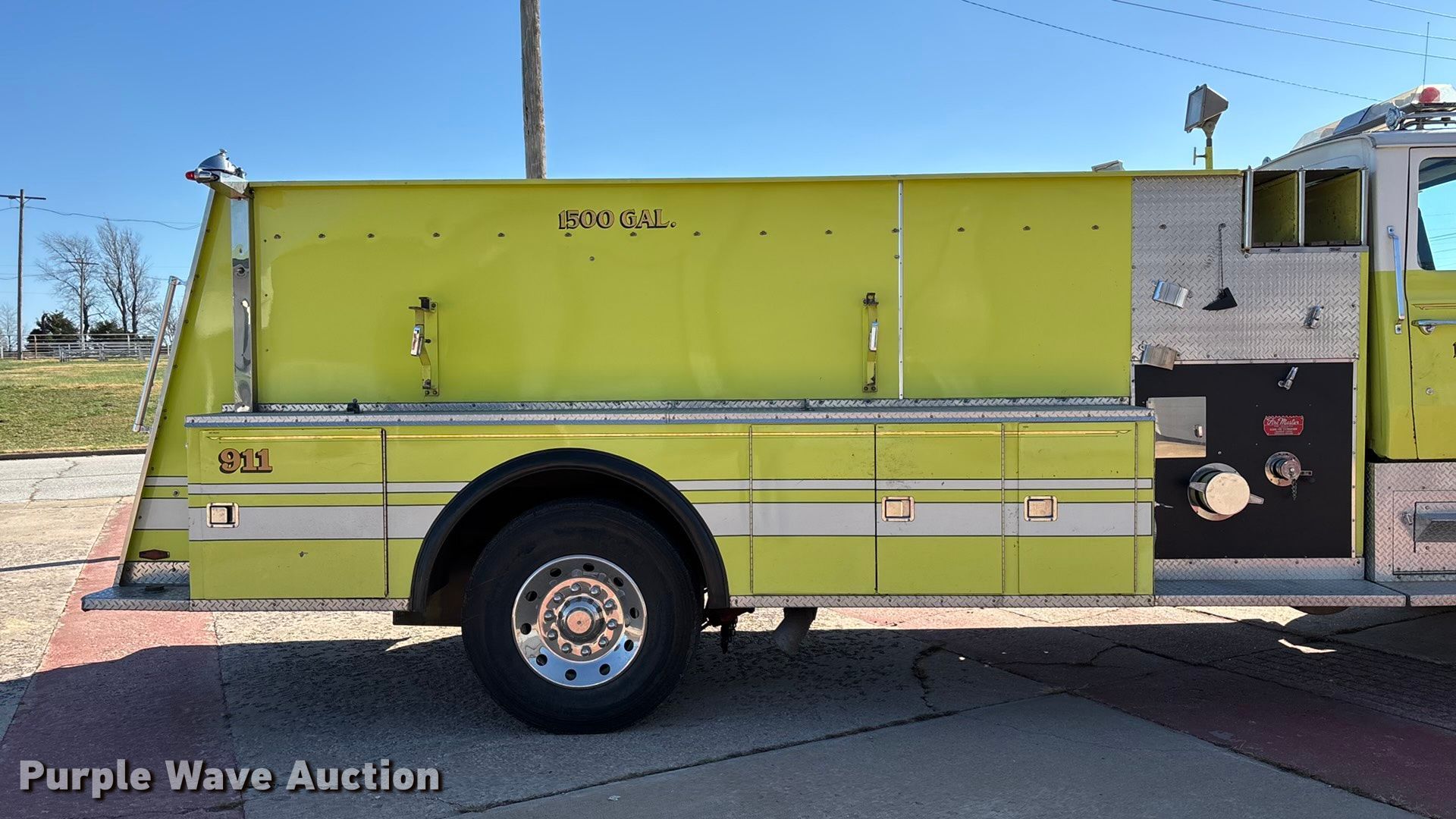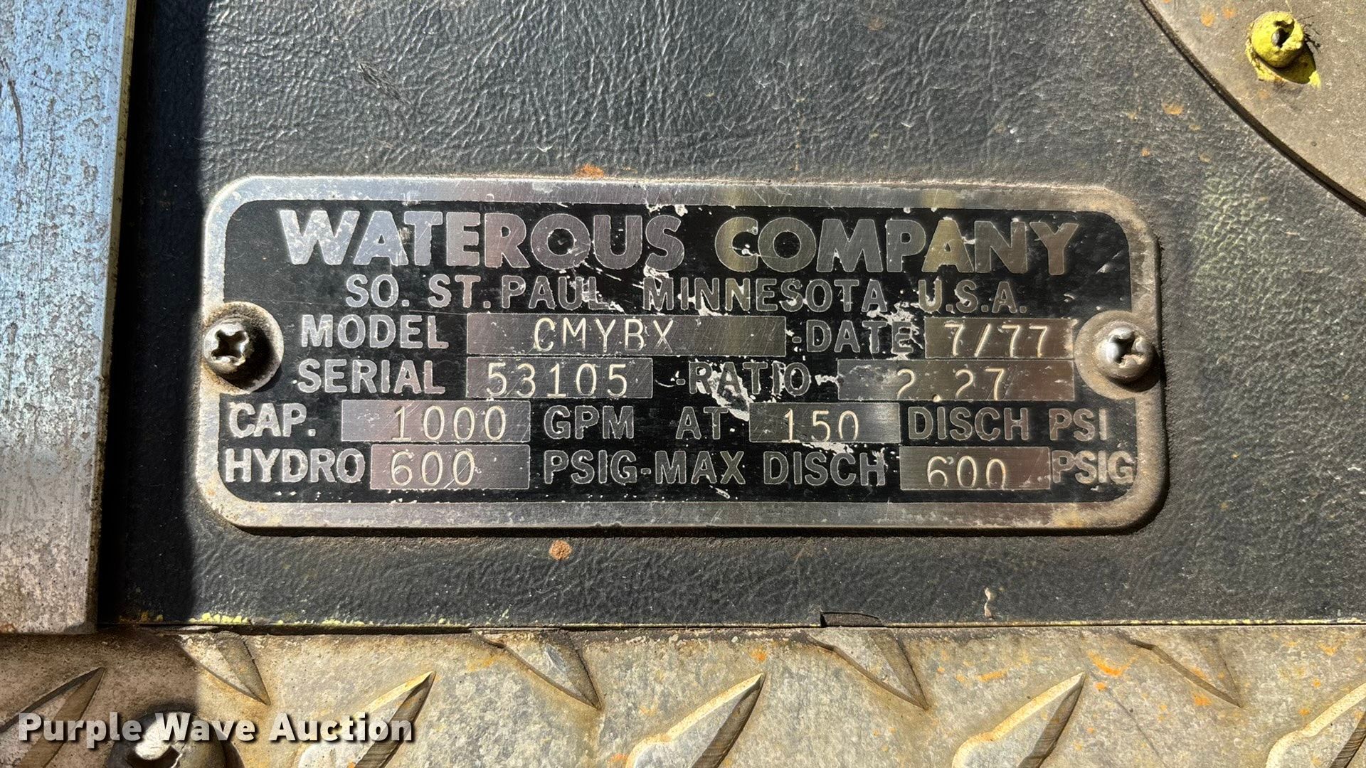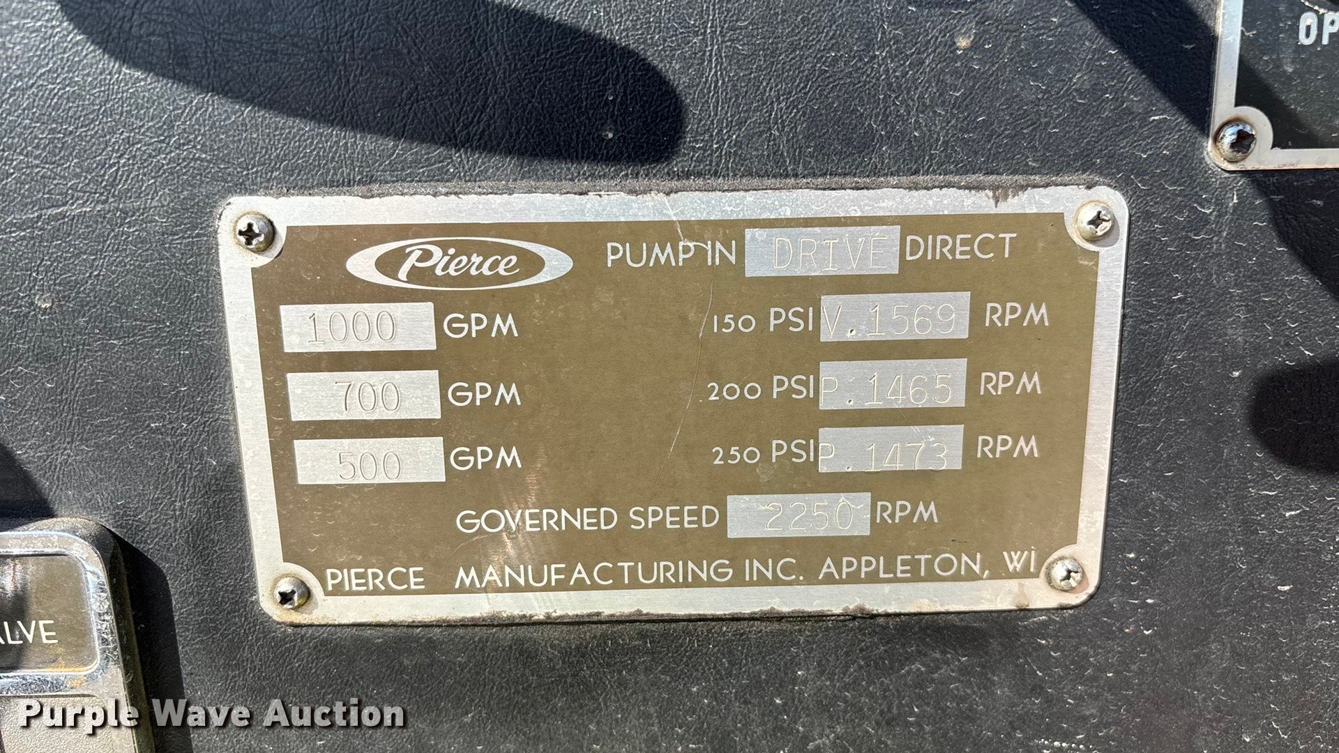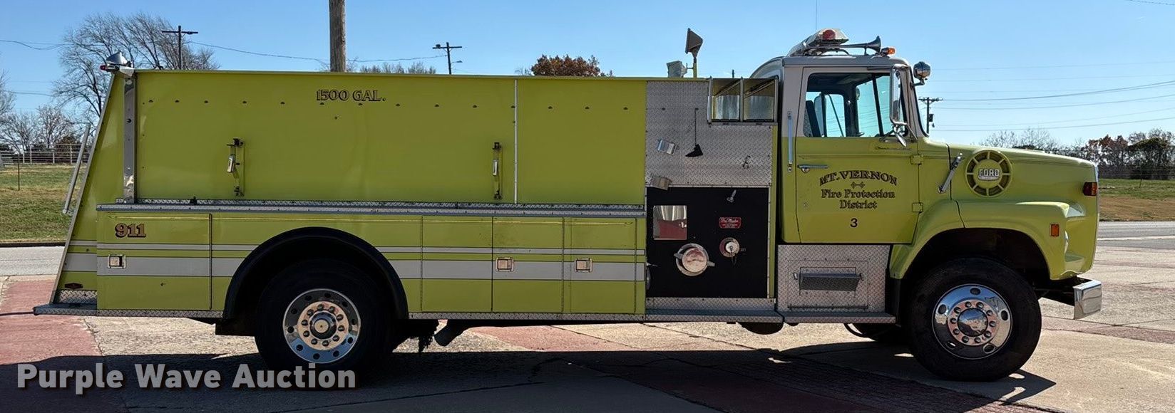 1977 Ford 9000 pumper fire truck. Miles: 80,475 on odometer, Hours: 1,962 on meter, VIN: K90AVO47629, Unit #: 3. Engine Detroit Diesel, Cylinders: 6, Fuel type: Diesel. Transmission Automatic. Chassis Axles: Single, Suspension: Spring, Brakes: Air, GVWR: 35,000 lbs. Interior Heat, Auxiliary controls. Features Fire truck body Pierce, Tank Capacity: 1,500 gallons, Pump 1,000 gpm, PA/ siren controls, Extension ladder, Attic ladder, Roof ladder, (2) suction hoses, (2) additional lights. Tires Front: 11R22.5, Rear: 11.00R20. Notes Windshield chipped or cracked, Oil leak. Missouri title. Title distribution may be delayed up to 14 days from verification of funds. Mt Vernon Fire Protection District. Mount Vernon, MO 65712