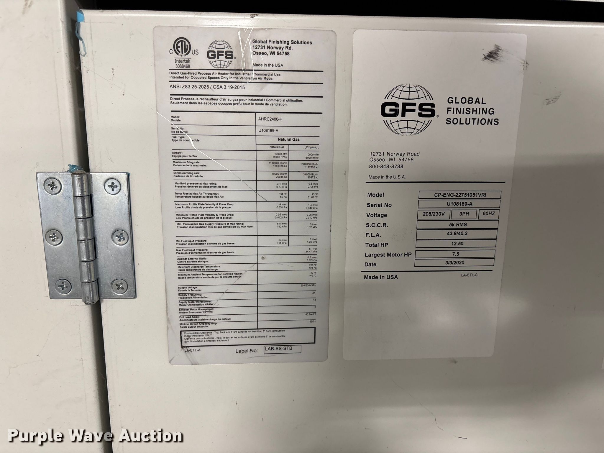 Purple Wave is selling a used Tools in Nebraska. This item is a 2020 Global Finishing Solutions Performer XD paint booth with the following: Approx. 28'L x 8'W overall, 77"W x 107"H door, Paint booth, Model: PFVMP2-71409SBP-3-W1-SP, 7.5 HP supply motor, 5 HP exhaust motor, Serial: U108189–A, Label no: ETL – LAB – 02, Exhaust system, Model: CP-ENG-275-1051VR1, Volts: 208-230, Phase: Three, Hz: 60, SCCR: 5K RMS, FLA: 43.9-40.2, Total HP: 12.5, Serial: U108189-A, Paint mixing room