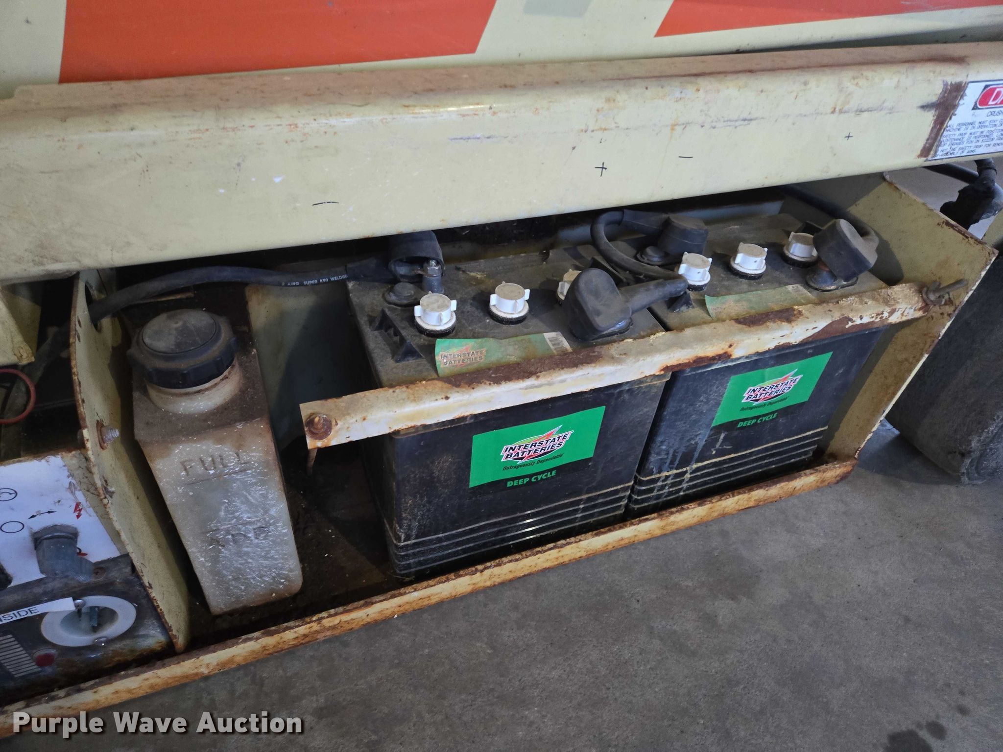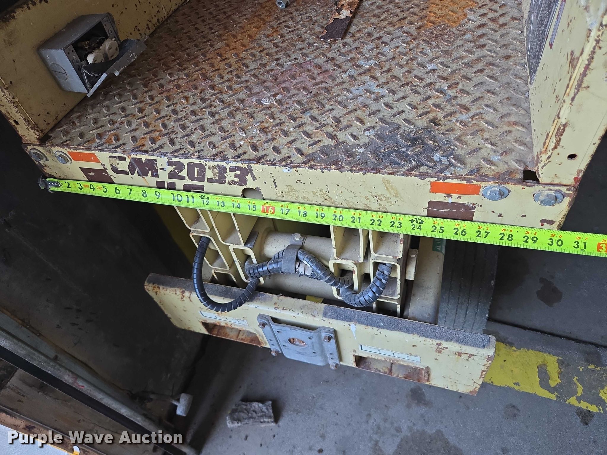JLG CM-2033 scissor lift. Hours: Unknown, Serial: 02680200008196. Electric Motor Volts: 24. Features Maximum lift capacity: 750 lbs, Maximum lift height: 20', Platform: 94" L x 30" W, AC power outlet, Controls: Platform, Remote Control, Ground. Tires Solid. Notes Batteries need replaced, Dead battery, Non-operational unit. State of South Dakota. Sioux Falls, SD 57104