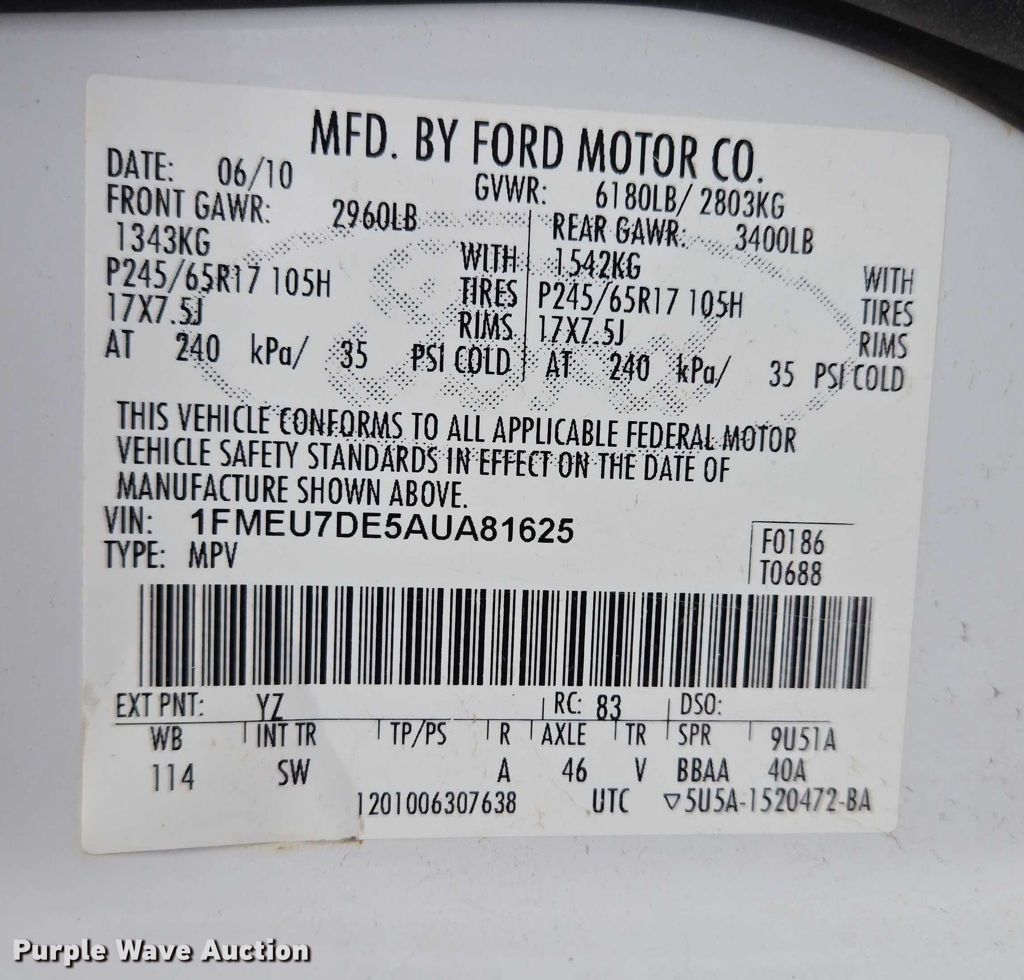 2010 Ford Explorer SUV. Miles: 172,989 on odometer, VIN: 1FMEU7DE5AUA81625, Unit #: BJ207. Engine Displacement: 4.0L, Cylinders: 6, Fuel type: Gas. Transmission Automatic, Four wheel drive. Interior AC, Heat, Seat: Power driver, Power windows, Power locks, Cruise control. Tires Size: 245/65R17. Notes Possible power steering issues, Possible engine issues, noise , Dash warning indicator: Check engine. South Dakota title. Title distribution may be delayed up to 14 days from verification of funds. State of South Dakota. Vermillion, SD 57069