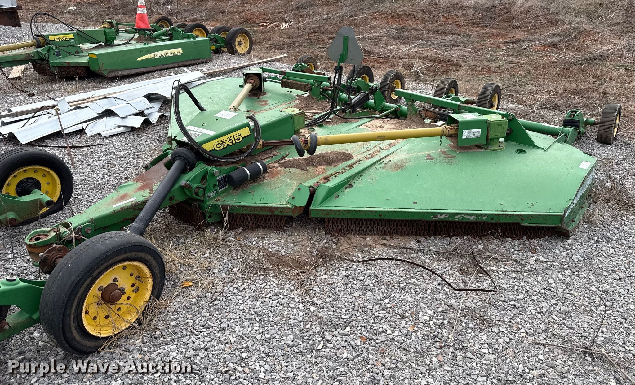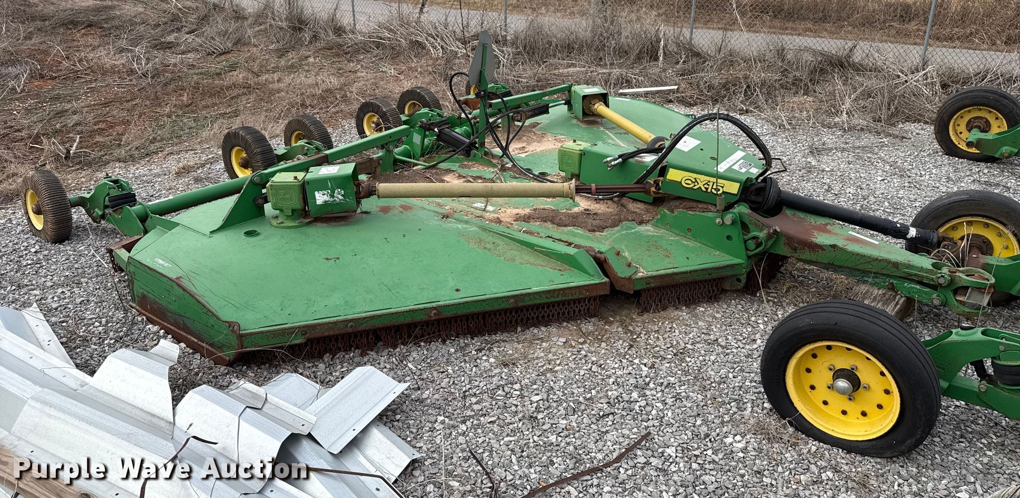 John Deere CX15 batwing rotary mower. Features. Width: 15', Hydraulic lift, Hydraulic fold, PTO: 1000. Tires Solid. Notes Wheels missing. Garvin County. Maysville, OK 73057