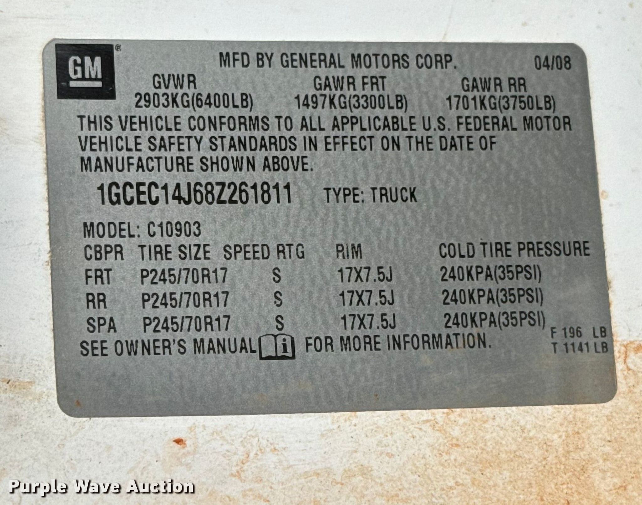 Purple Wave is selling a used 1/2 Ton Pickup or Van in Oklahoma. This item is a 2008 Chevrolet Silverado 1500 pickup truck with the following: Miles: Unknown, VIN: 1GCEC14J68Z261811