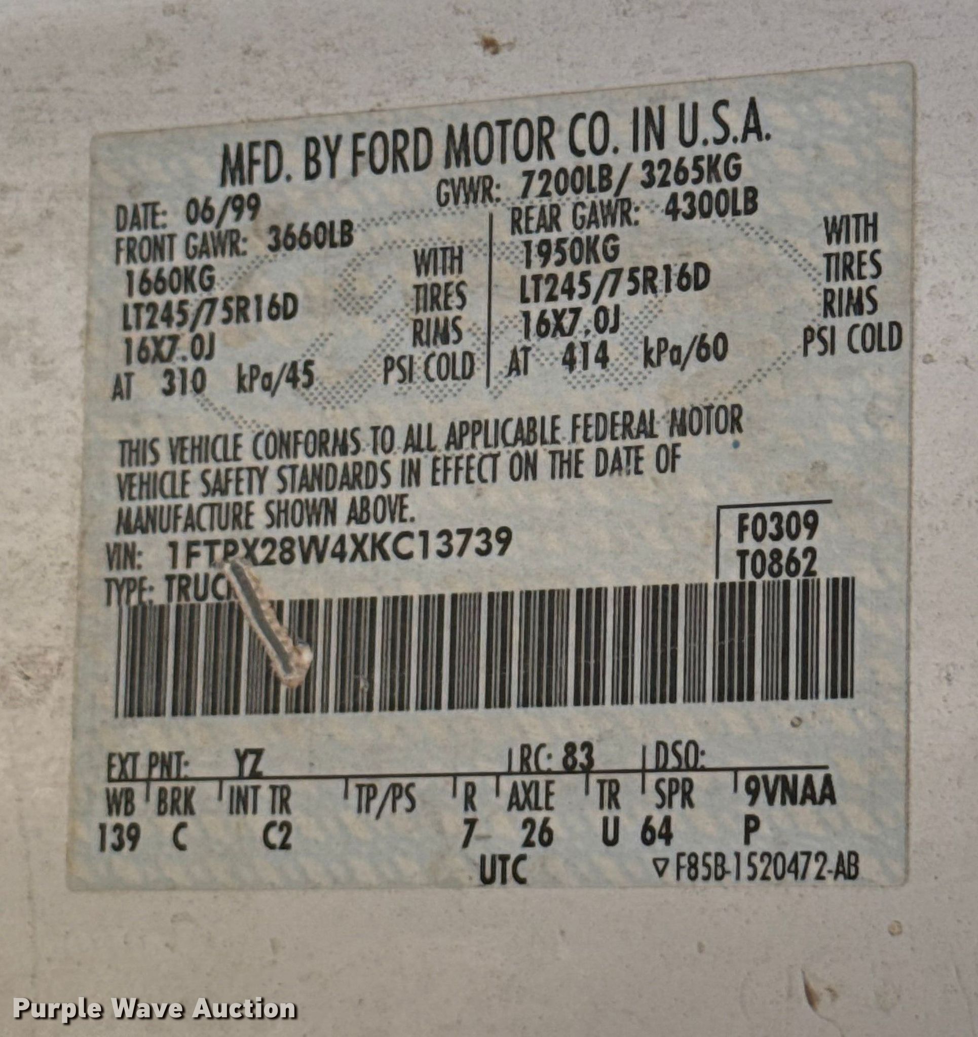 1999 Ford F250 SuperCab pickup truck. Miles: Unknown, VIN: 1FTPX28W4XKC13739. Engine Displacement: 4.6L, Cylinders: 8, Fuel type: Gas. Transmission Automatic, Four wheel drive. Interior AC, Heat. Features End gate lift. Tires Size: LT235/85R16. Notes Non-operational odometer, Dash warning indicator: Check engine, Windshield chipped or cracked, Jump start required during on-site data collection, Non-operational engine issues, needs replaced , Non-operational unit. Oklahoma title. Mileage has not been verified. Exempt will be written in the odometer disclosure on the title. Title distribution may be delayed up to 30 days from verification of funds. Garvin County. Maysville, OK 73057