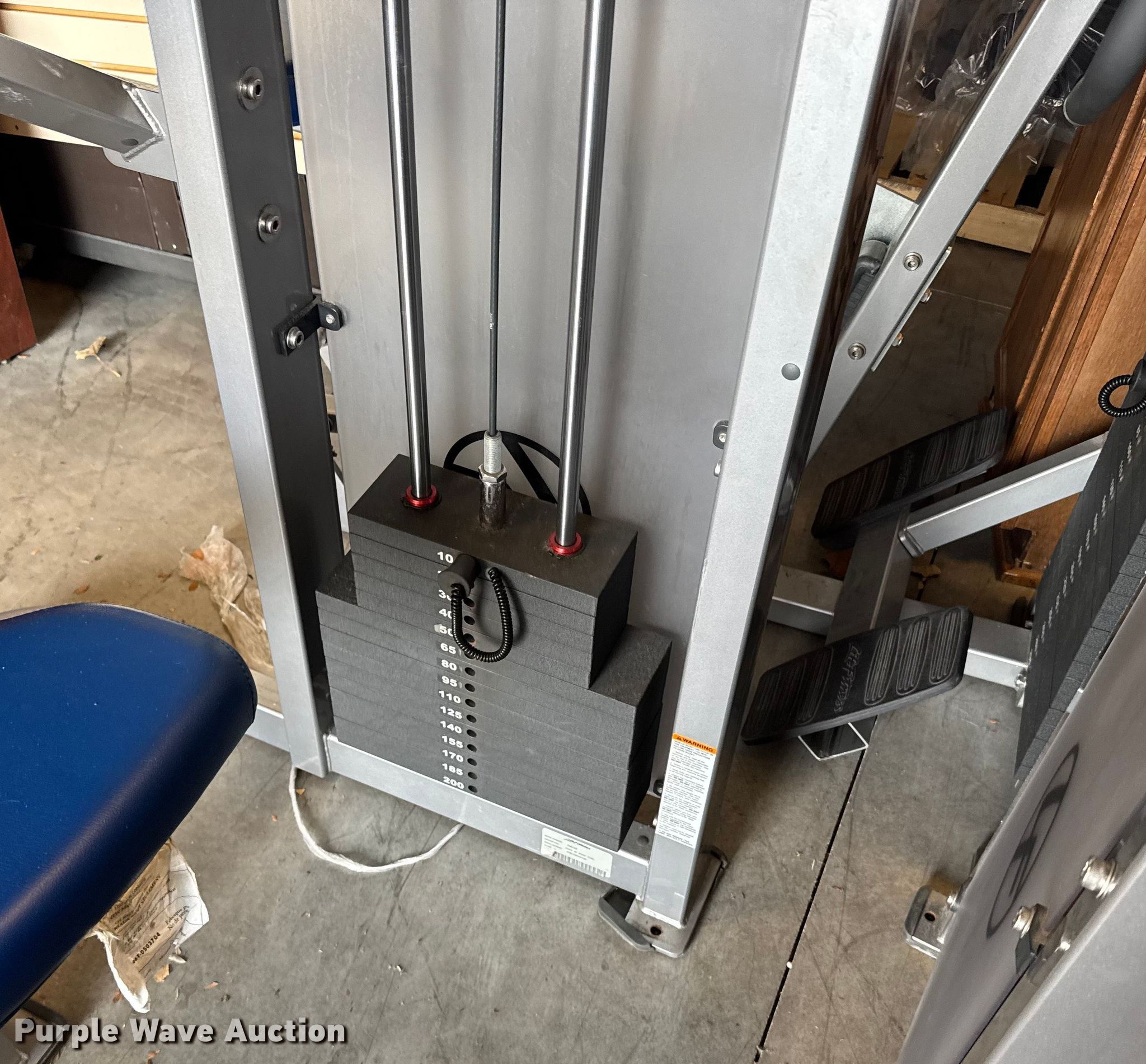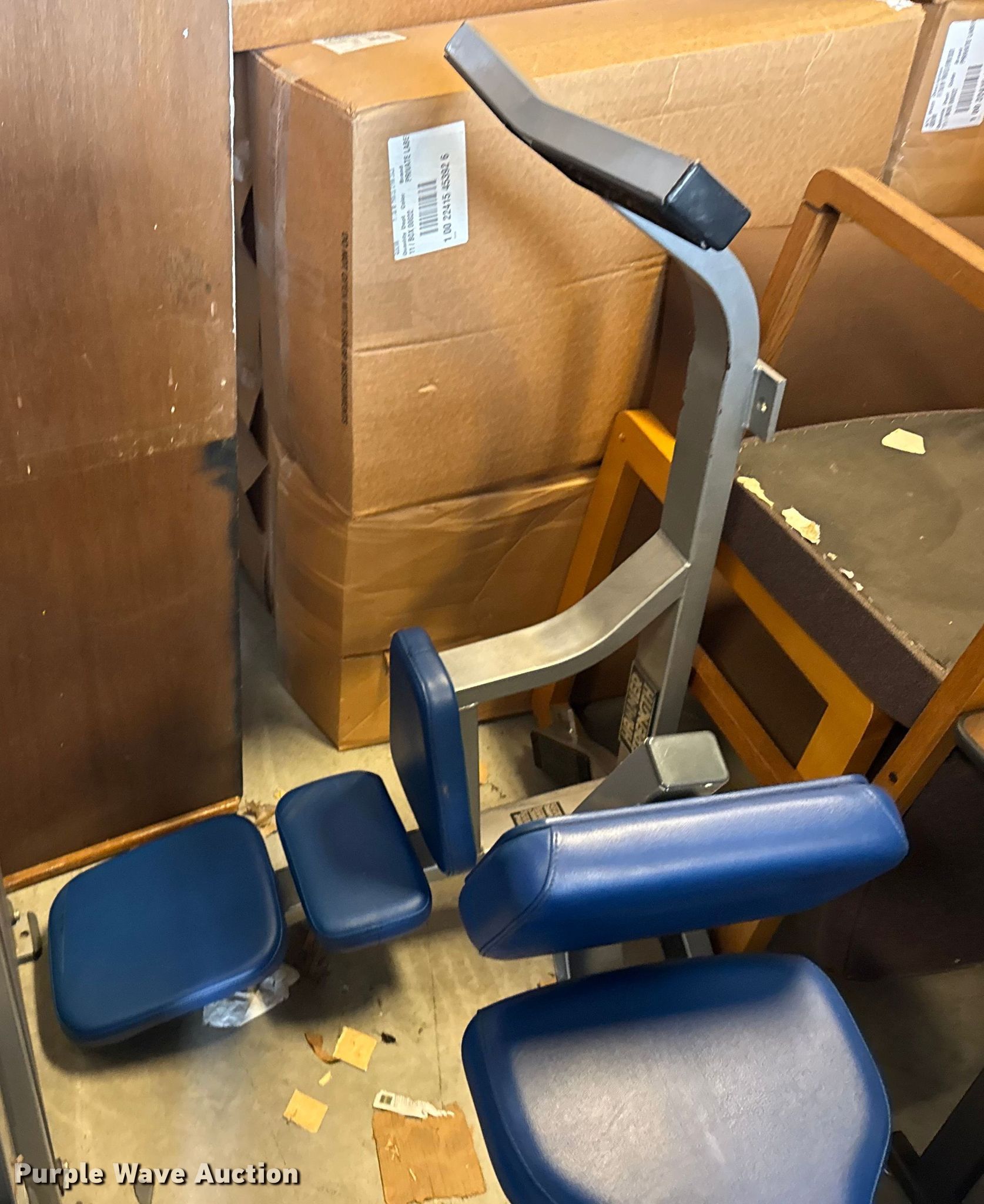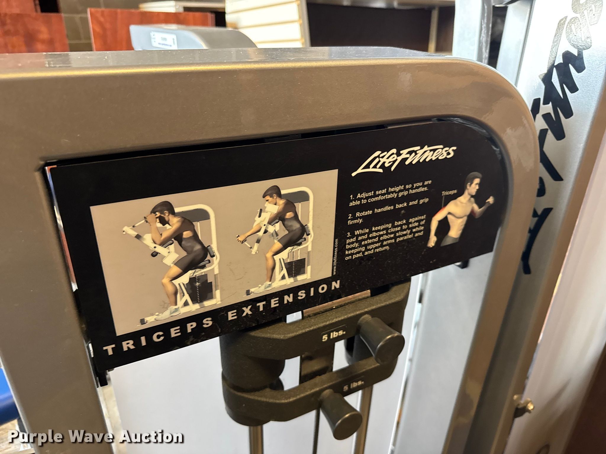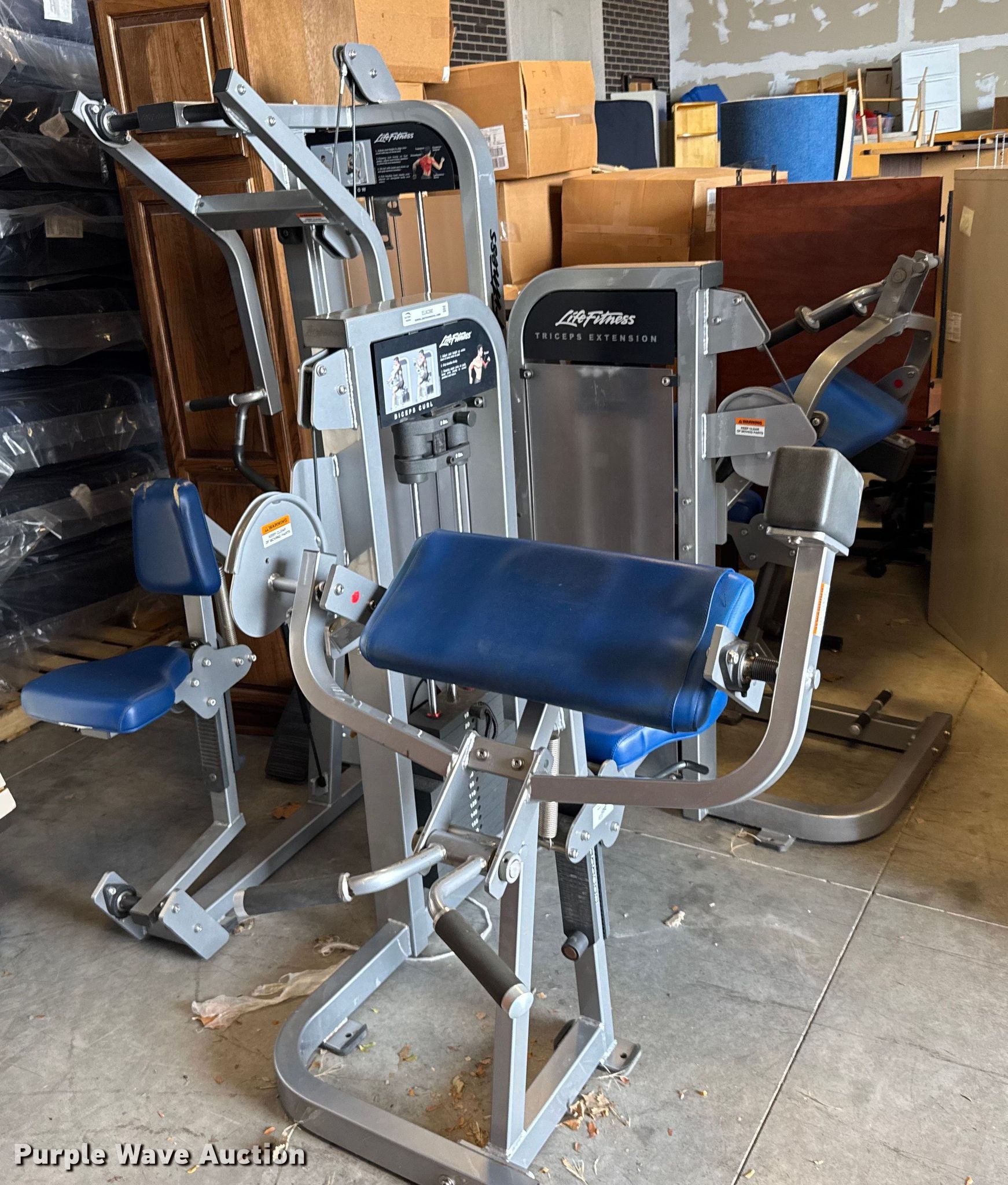 Purple Wave is selling a used Sporting Goods in Kansas. This item is a Life Fitness exercise equipment with the following: Biceps curl machine, Triceps extension machine, Seated row machine, Incline bench