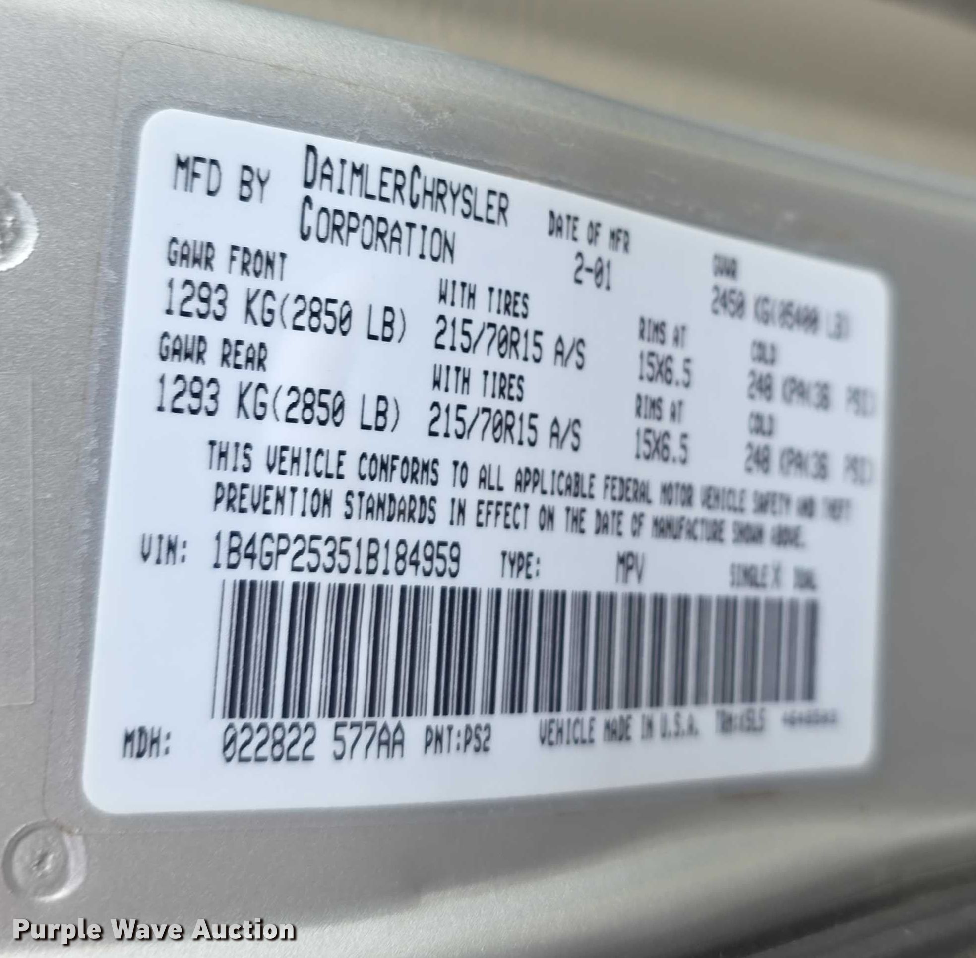 Purple Wave is selling a used Passenger Vehicle in Kansas. This item is a 2001 Dodge Caravan van with the following: Miles: 124,360 on odometer, VIN: 1B4GP25351B184959, Unit #: 10