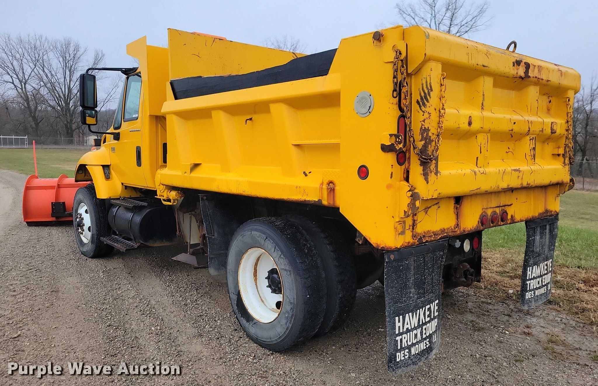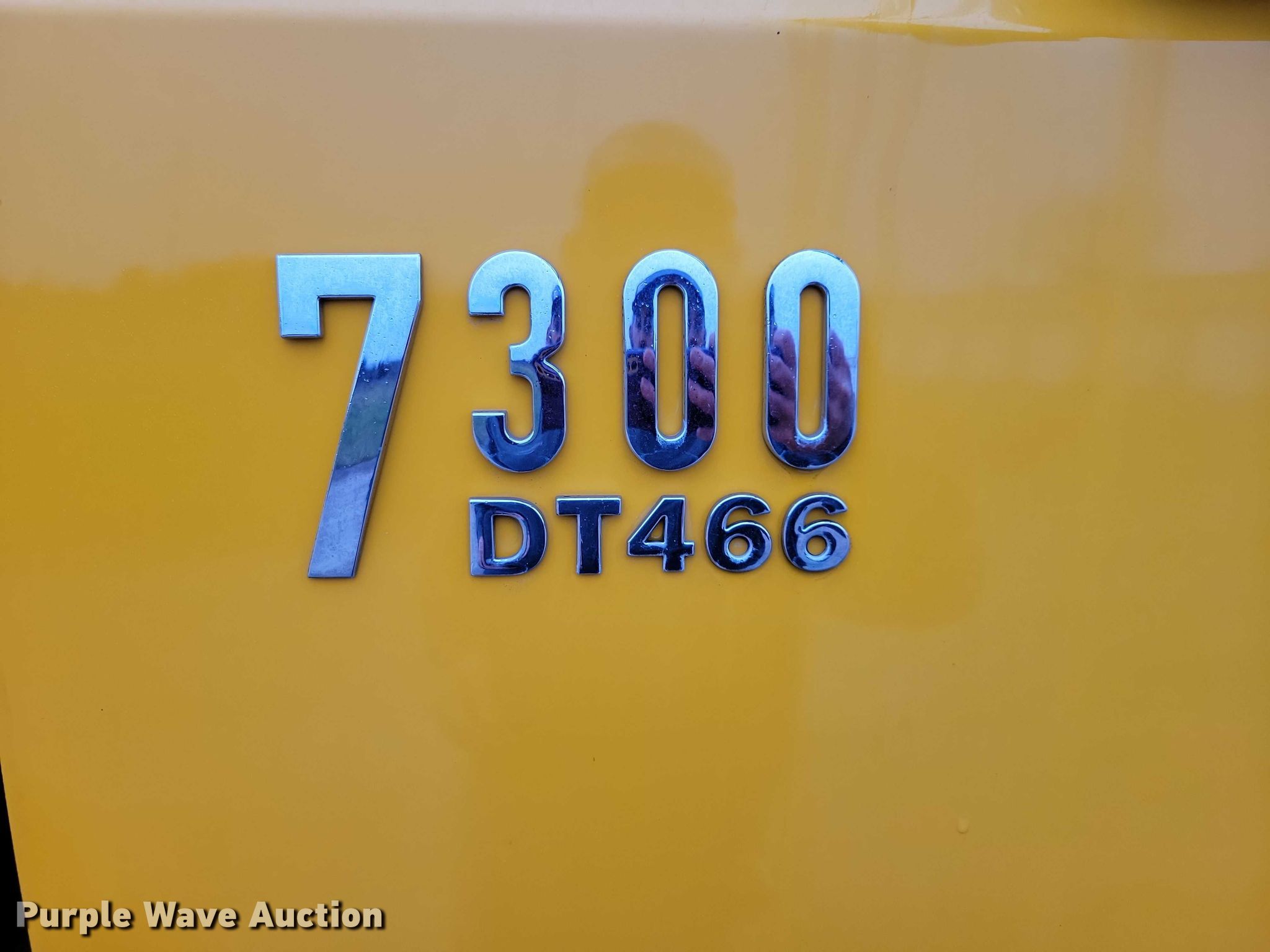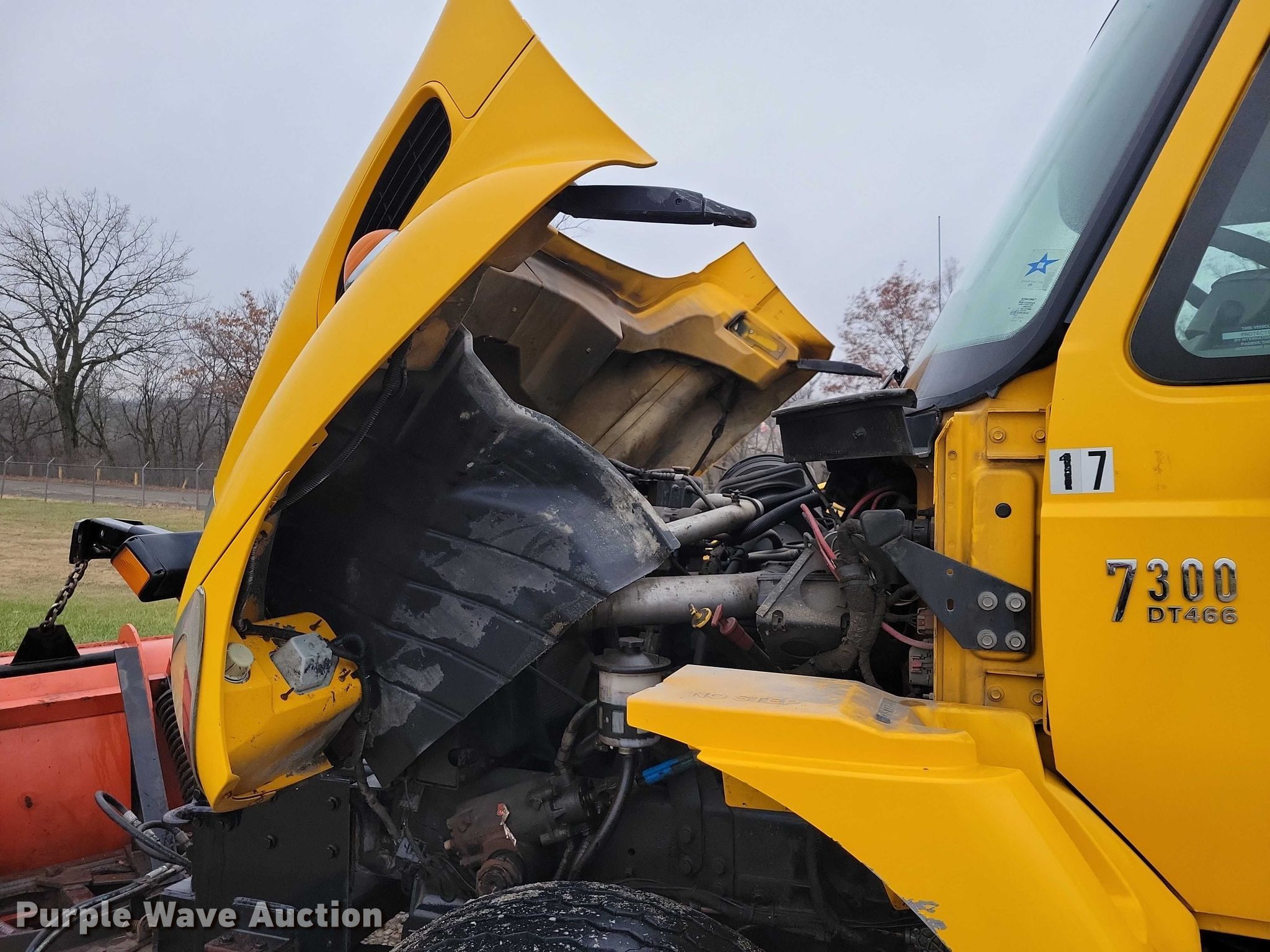 2004 International 7300 dump truck. Miles: 66,771 on odometer, VIN: 1HTWAAAR84J089927. Engine International DT466, Displacement: 7.6L, Cylinders: 6, Fuel type: Diesel. Transmission Automatic. Chassis Axles: Single, Suspension: Spring, Brakes: Air, Front mount PTO, GVWR: 39,000 lbs FAWR: 16,000 lbs. Interior AC, Heat, Power windows, Cruise control. Features Bed Dump bed, Length: 10', Width: 96", Side height: 30", Side board height: 10", Bed type: Steel, Liner, Ram: Single, End gate: Air operated, Plow Monroe MP41R11-ISCT, Width: 132", Wing plow Width: 108". Tires Front: 315/80R22.5, Rear: 11R22.5. Notes Dash warning indicator: ABS, Traction control, Check AC, Non-operational side tilt. Iowa title. Seller is a government entity who will be assigning and distributing the title. Please contact the seller for distribution questions. Title distribution may be delayed up to 14 days from verification of funds. City of Forest City. Forest City, IA 50436