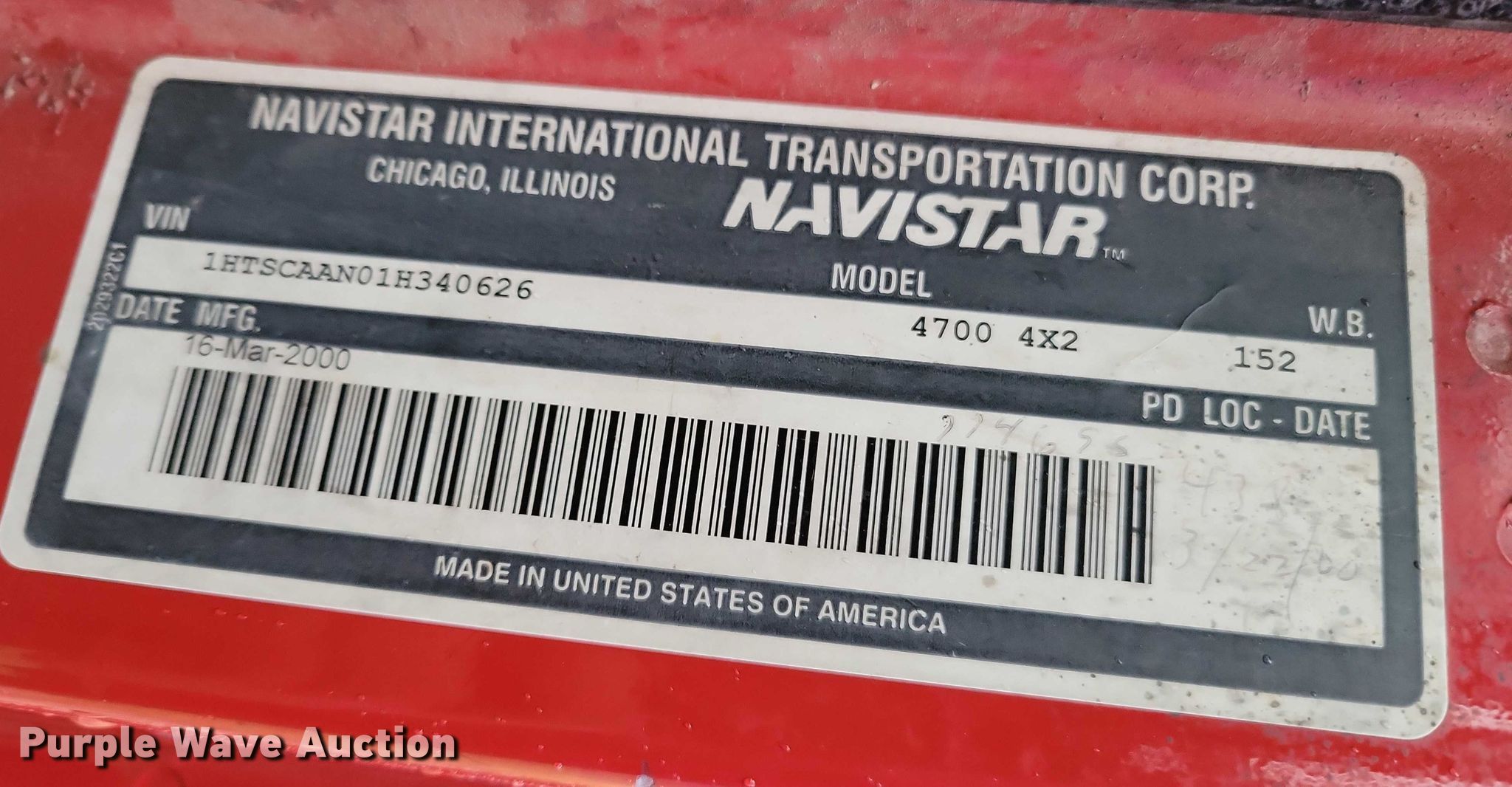 Purple Wave is selling a used Construction Dump Truck in Iowa. This item is a 2001 International 4700 dump truck with the following: Miles: 33,381 on odometer, Hours: 3,784 on meter, VIN: 1HTSCAAN01H340626