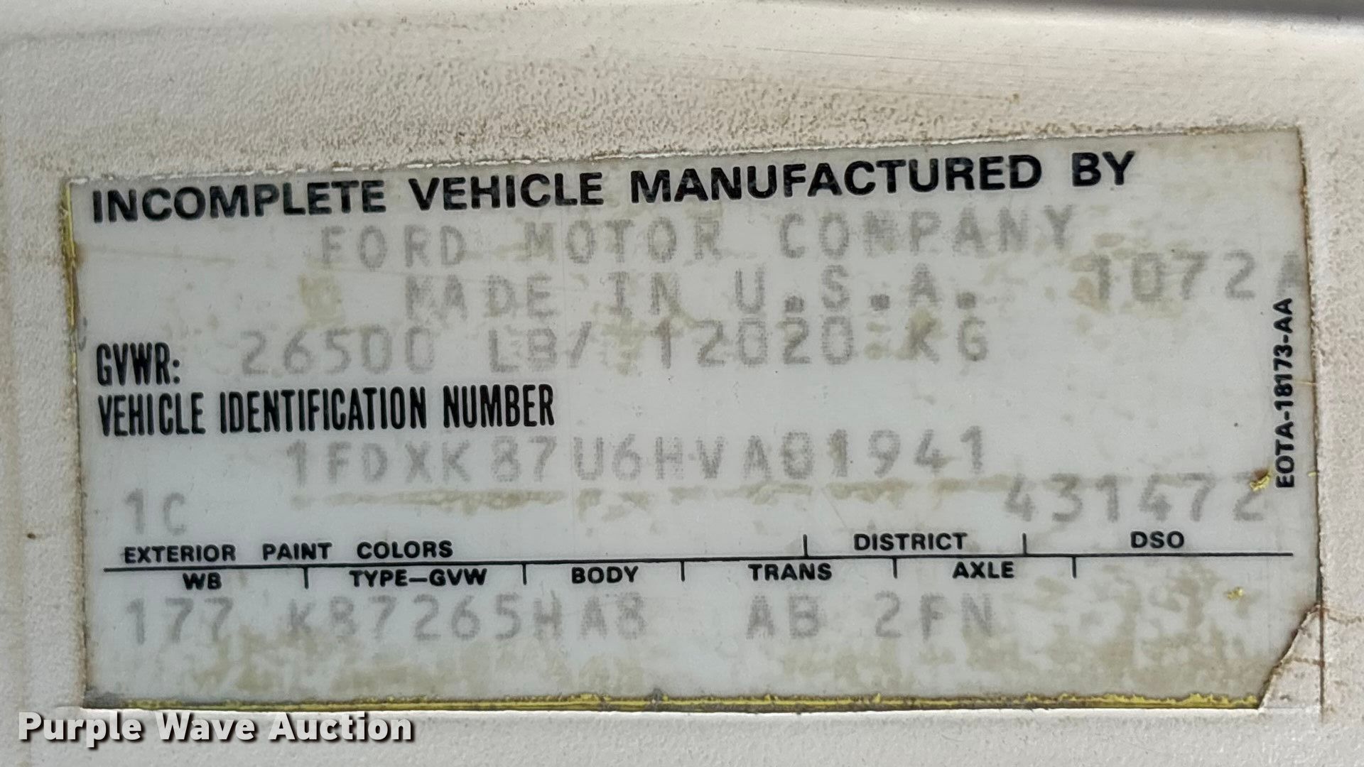 - VIN: 1FDXK87U6HVA01941