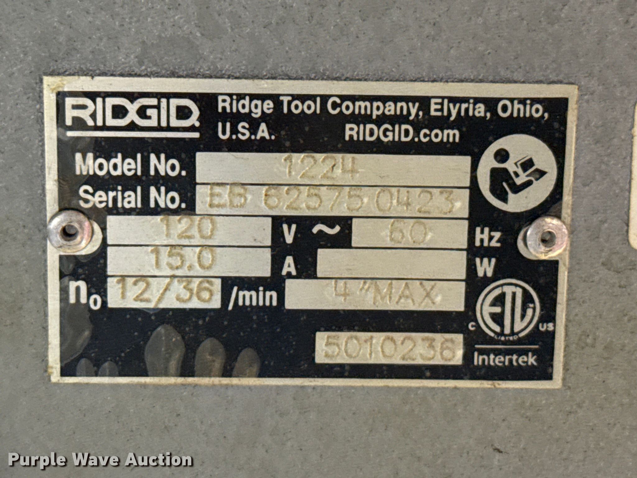 Purple Wave is selling a used Tools in Kansas. This item is a Rigid 1224 pipe threader with the following: Volts: 120, Amps: 20