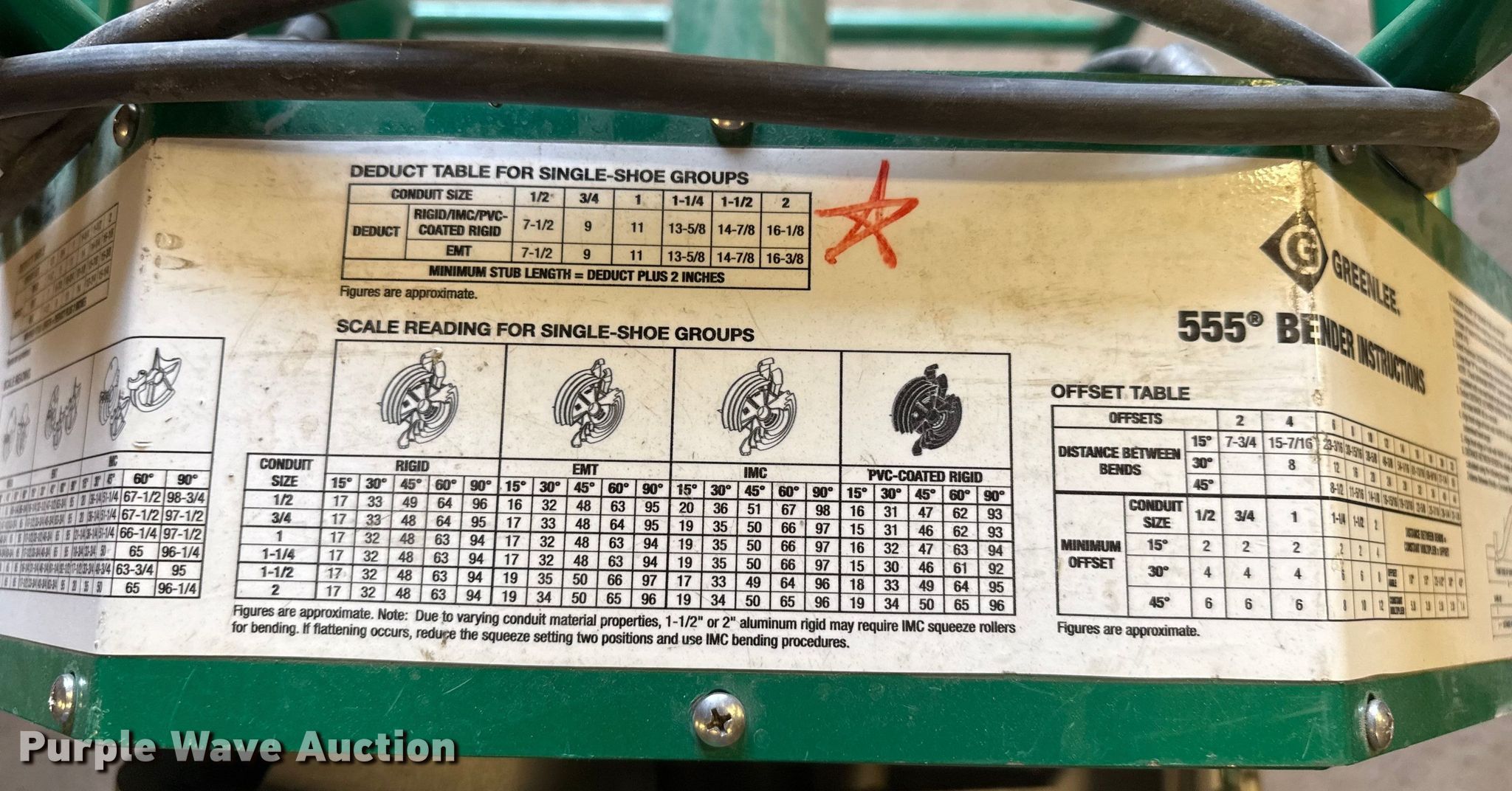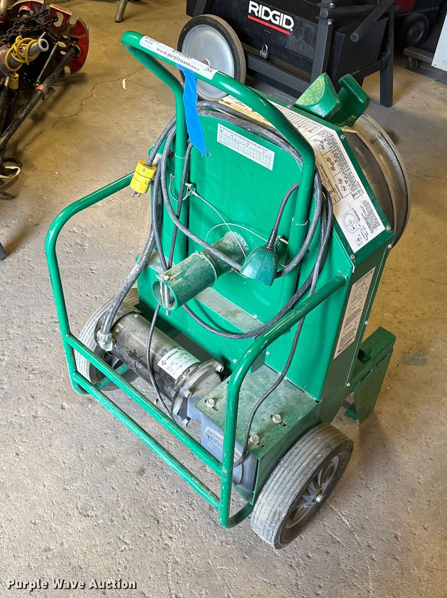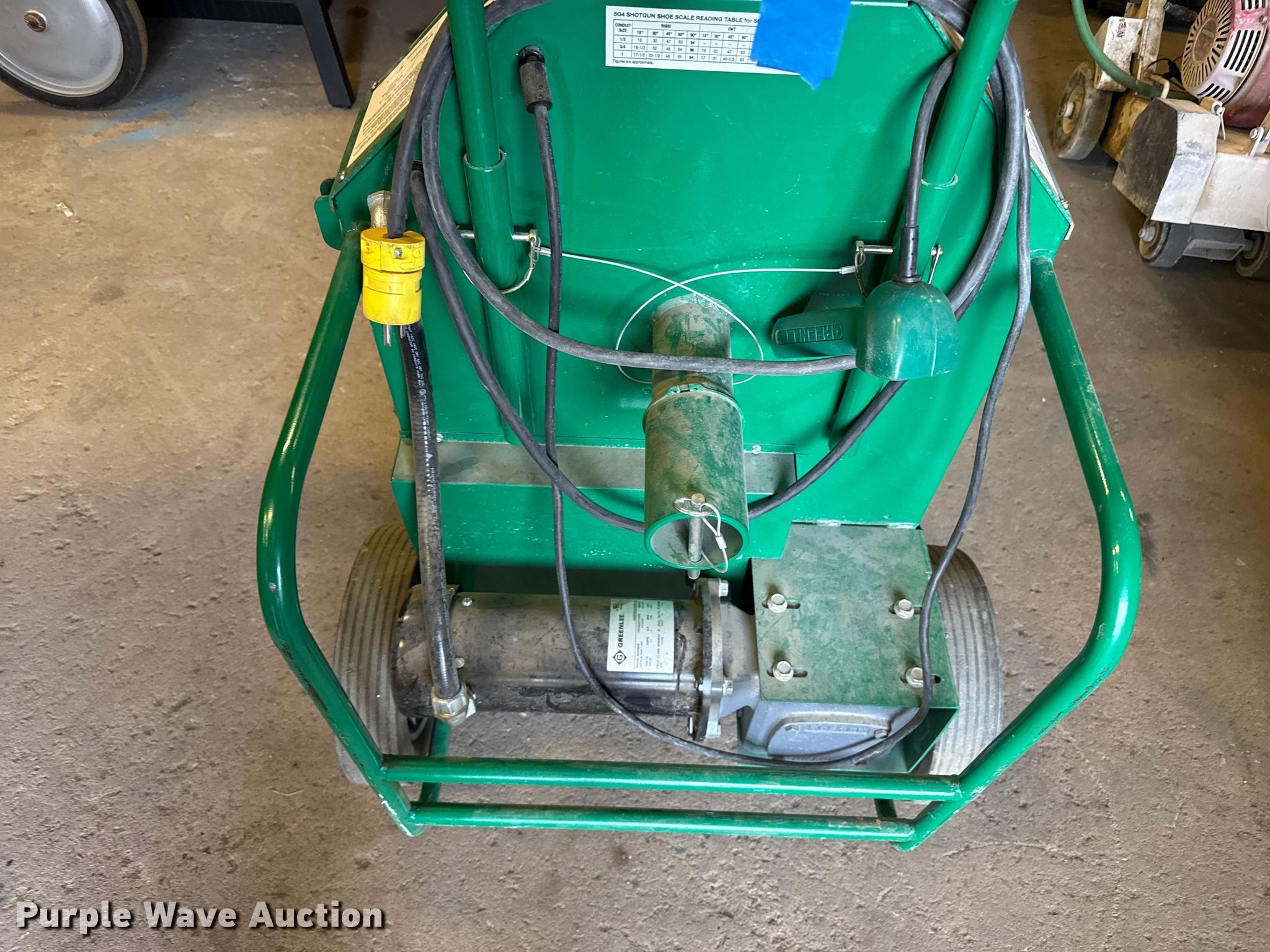 Purple Wave is selling a used Tools in Kansas. This item is a Greenlee 555 pipe bender with the following: (2) rigid pipe bending shoes:, 1/2" to 1 1/4", 1" to 2", Volts: 120, Amps: 20