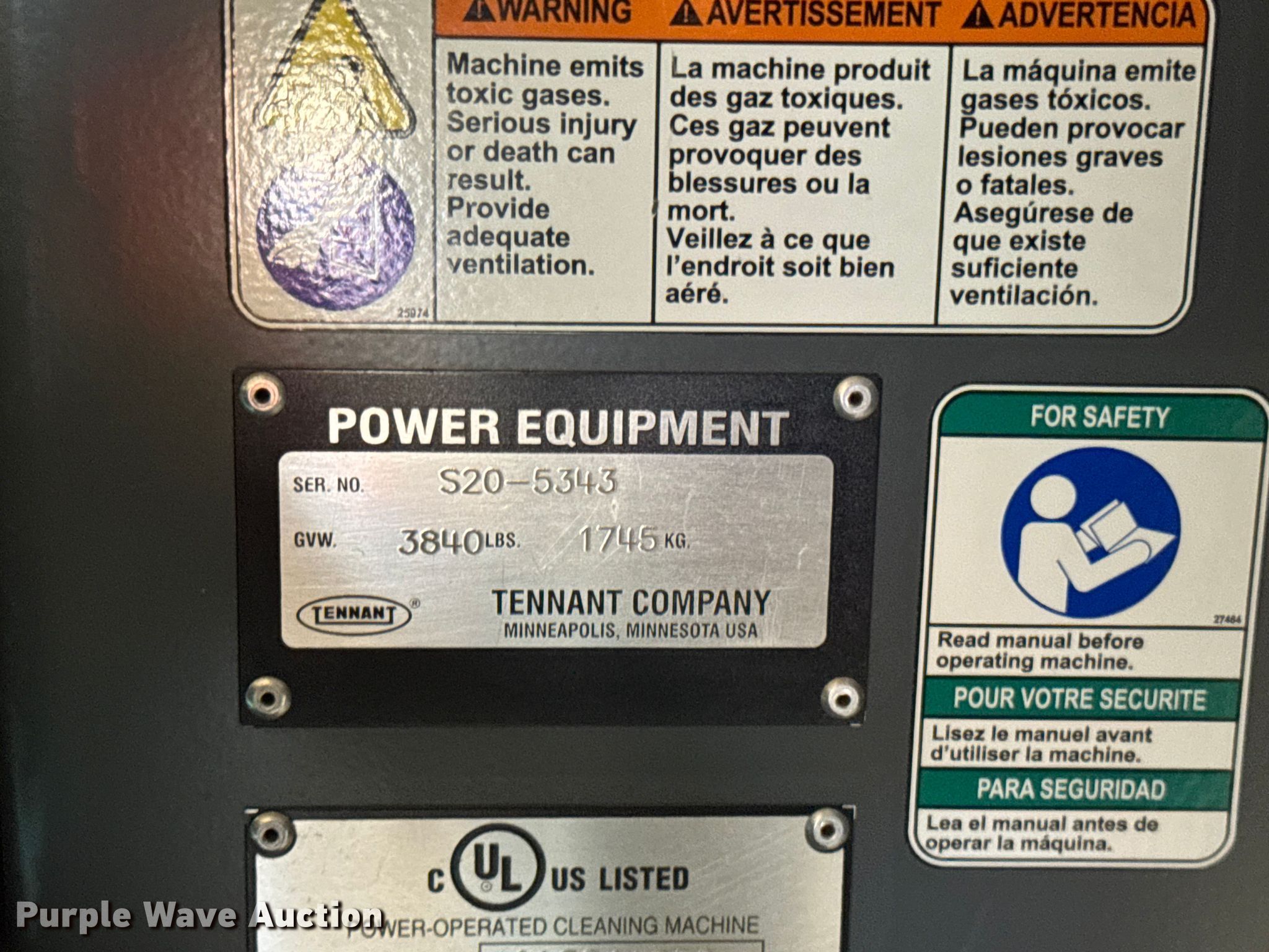 Purple Wave is selling a used Sweeper in Wisconsin. This item is a Tennant S20 sweeper with the following: Hours: 719 on meter, Serial: S205343