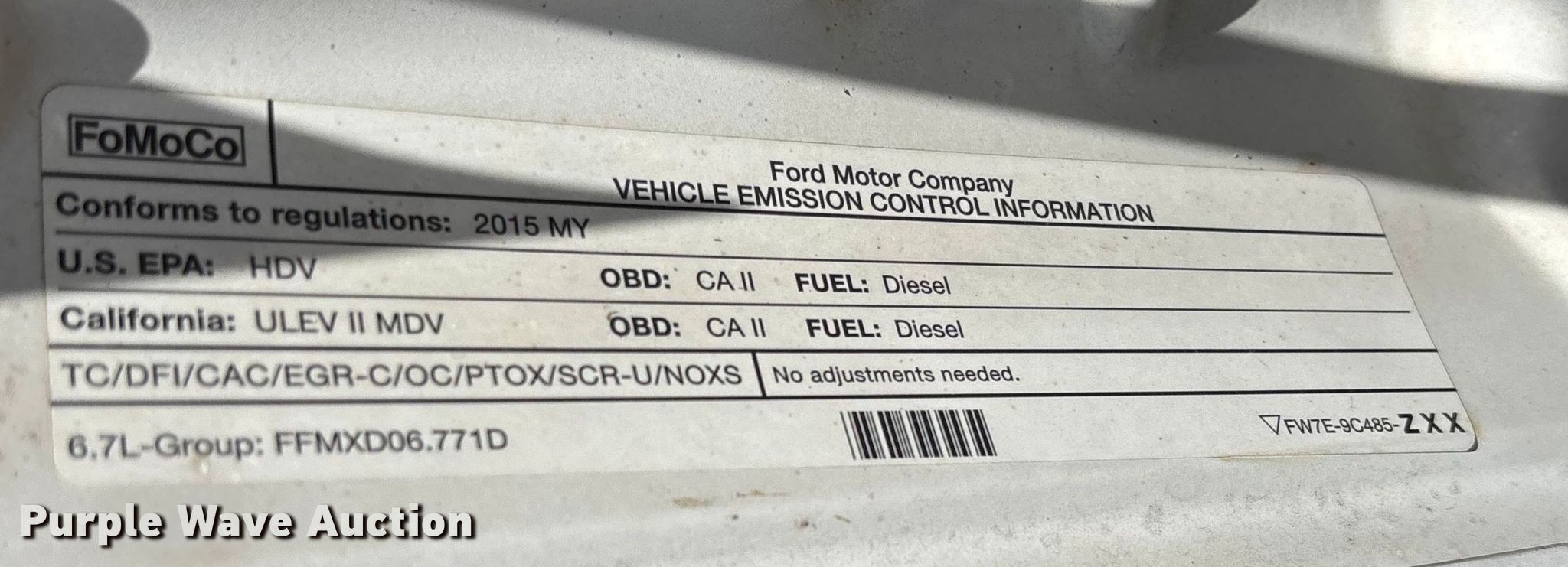2015 Ford F350 Super Duty Crew Cab pickup truck. Miles: 335,177 on odometer, VIN: 1FT8W3CT9FEA99180. Engine Displacement: 6.7L, Cylinders: 8, Fuel type: Diesel. Transmission Automatic. Interior AC, Heat, Heated mirrors, Power windows, Power locks, Cruise control, Brake controller. Features Bed Length: 8'. Tires Size: 245/75R17. Notes Dash warning indicator: Check engine, Electrical system fault, Windshield chipped or cracked, Fuel system issues , Unit must be towed or hauled , Non-operational unit. Arkansas title. Title distribution may be delayed up to 14 days from verification of funds. D&H Contracting, Inc. Imboden, AR 72434